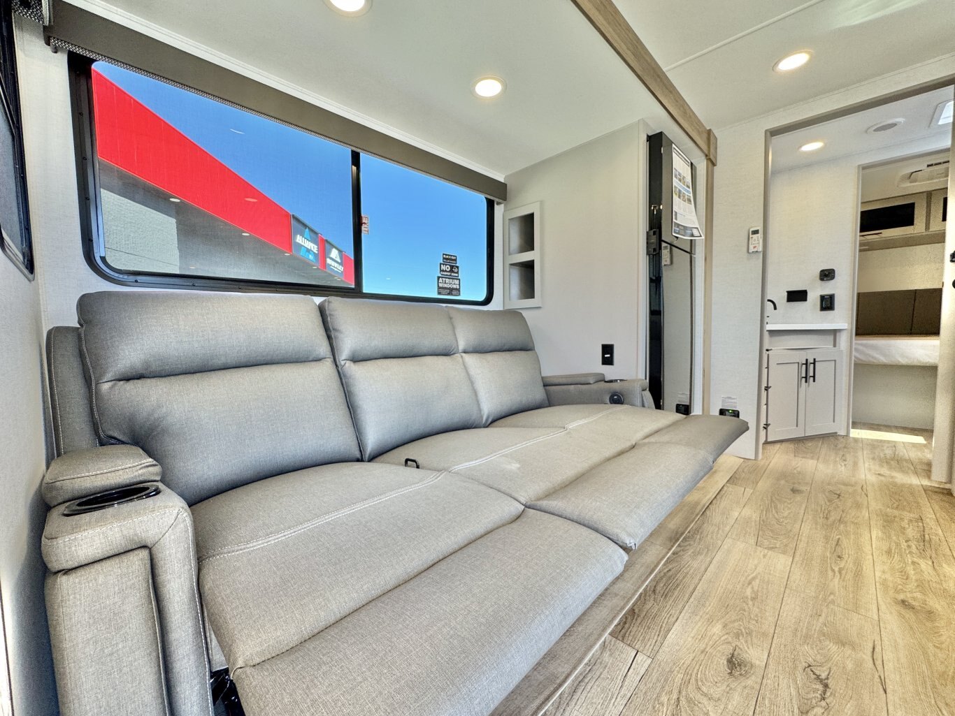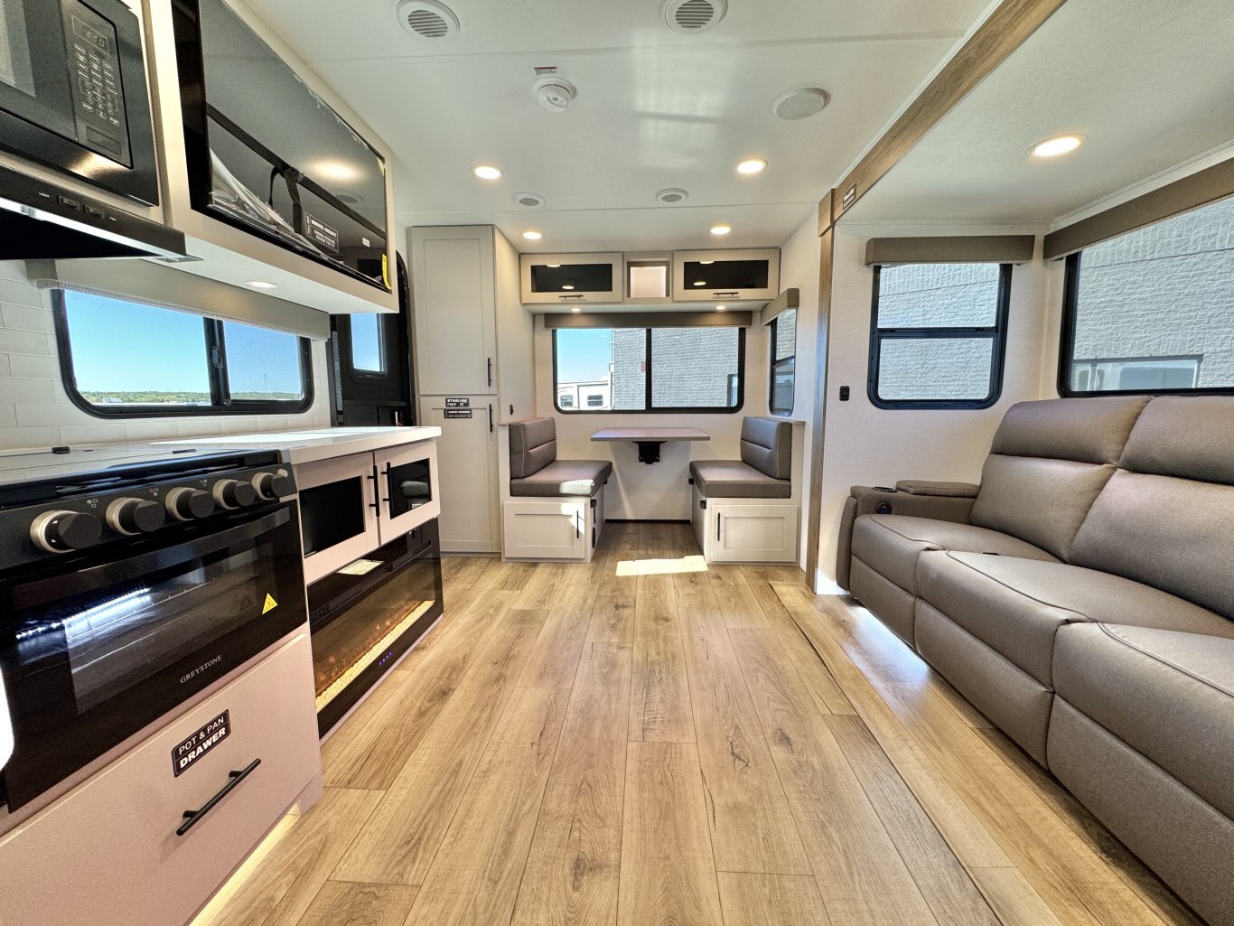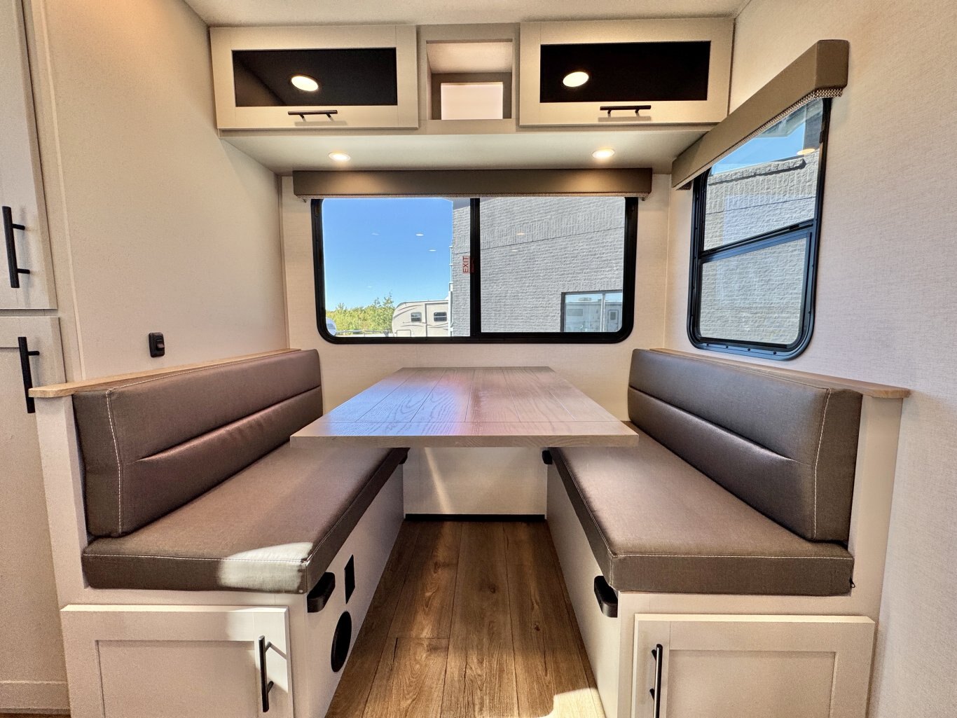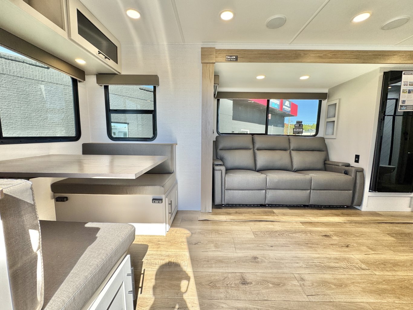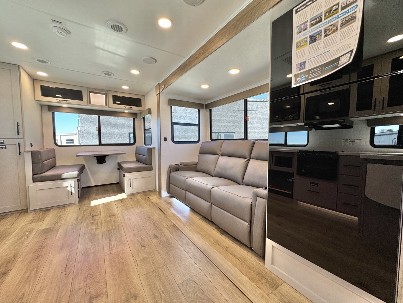 -Rear living layout includes a full dinette with overhead storage and a spacious reclining loveseat near the entry