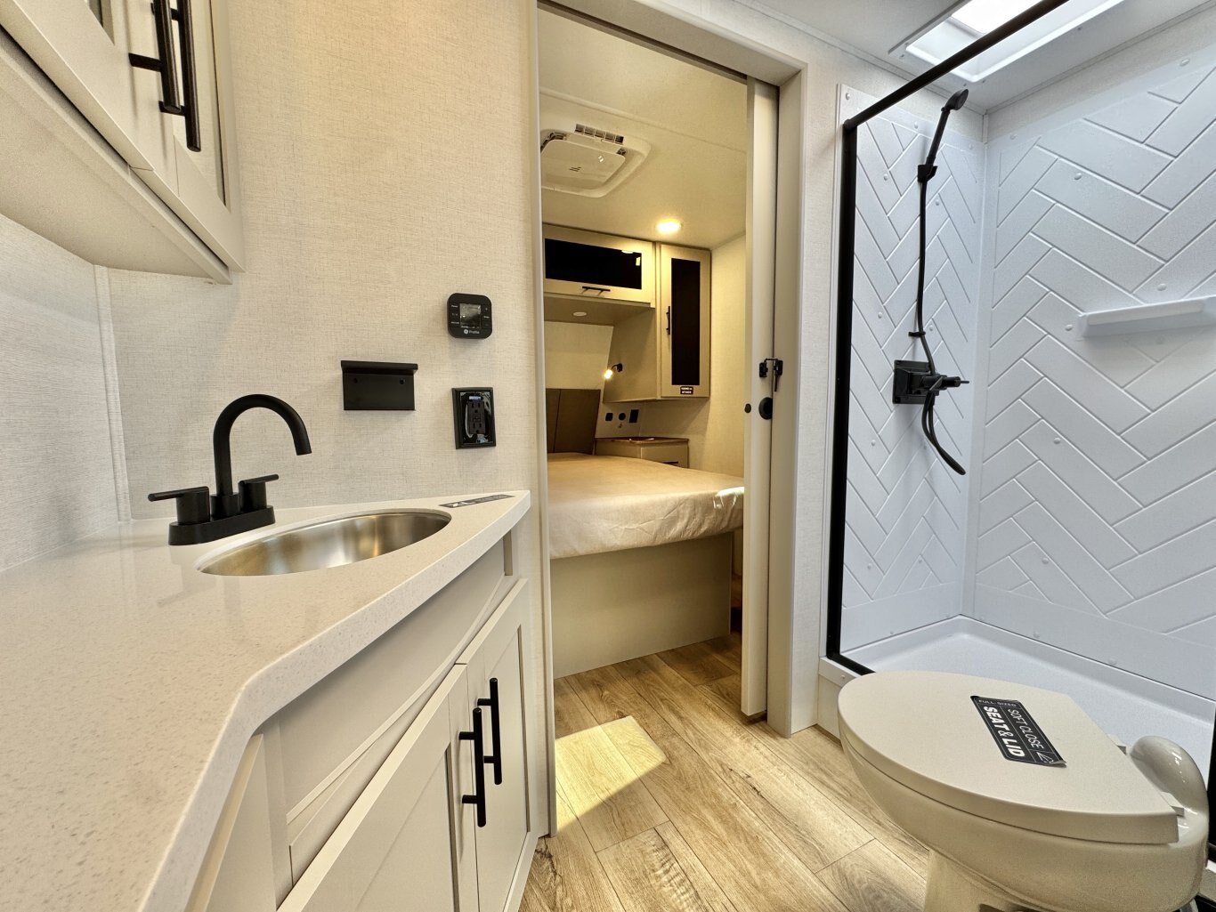 The Delta 252RL blends compact design with residential comfort, making it an ideal travel trailer for couples and weekend explorers. A rear dinette and reclining loveseat offer cozy seating options, all centered around an entertainment wall with a 40" HDTV and fireplace. The kitchen delivers practicality with a flip-up counter, pantry, and 10 cu. ft. refrigerator—perfect for extended stays. The private queen bedroom ensures restful nights, while the spacious bathroom adds convenience with direct access from the main living area. With outdoor amenities like a griddle grill, 18' awning, and 62 cu. ft. of drop-frame storage, the Delta 252RL is made for easy, elevated travel.