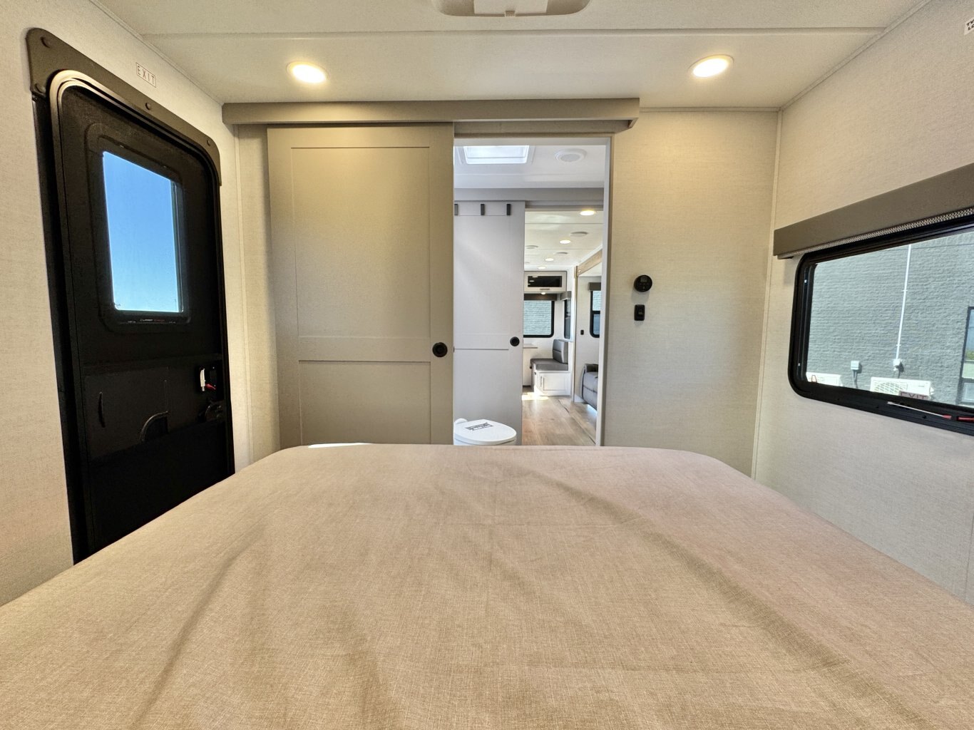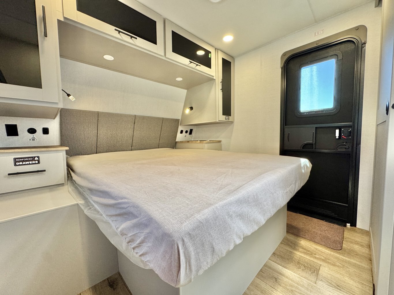 -Front bedroom features a 60" x 80" queen bed with dual wardrobes and overhead storage