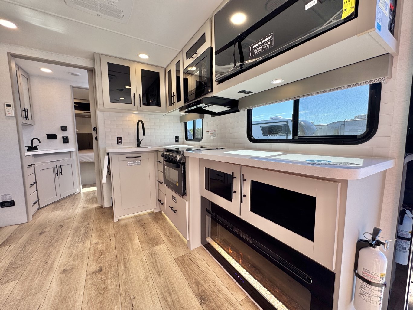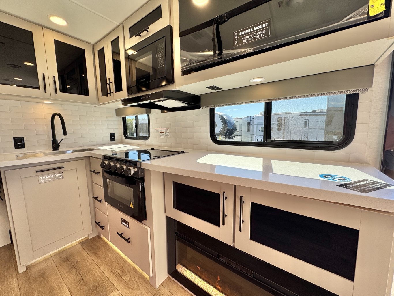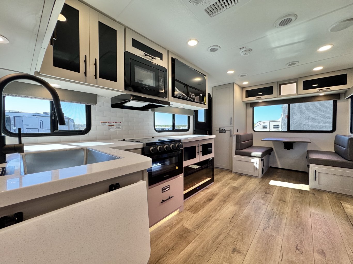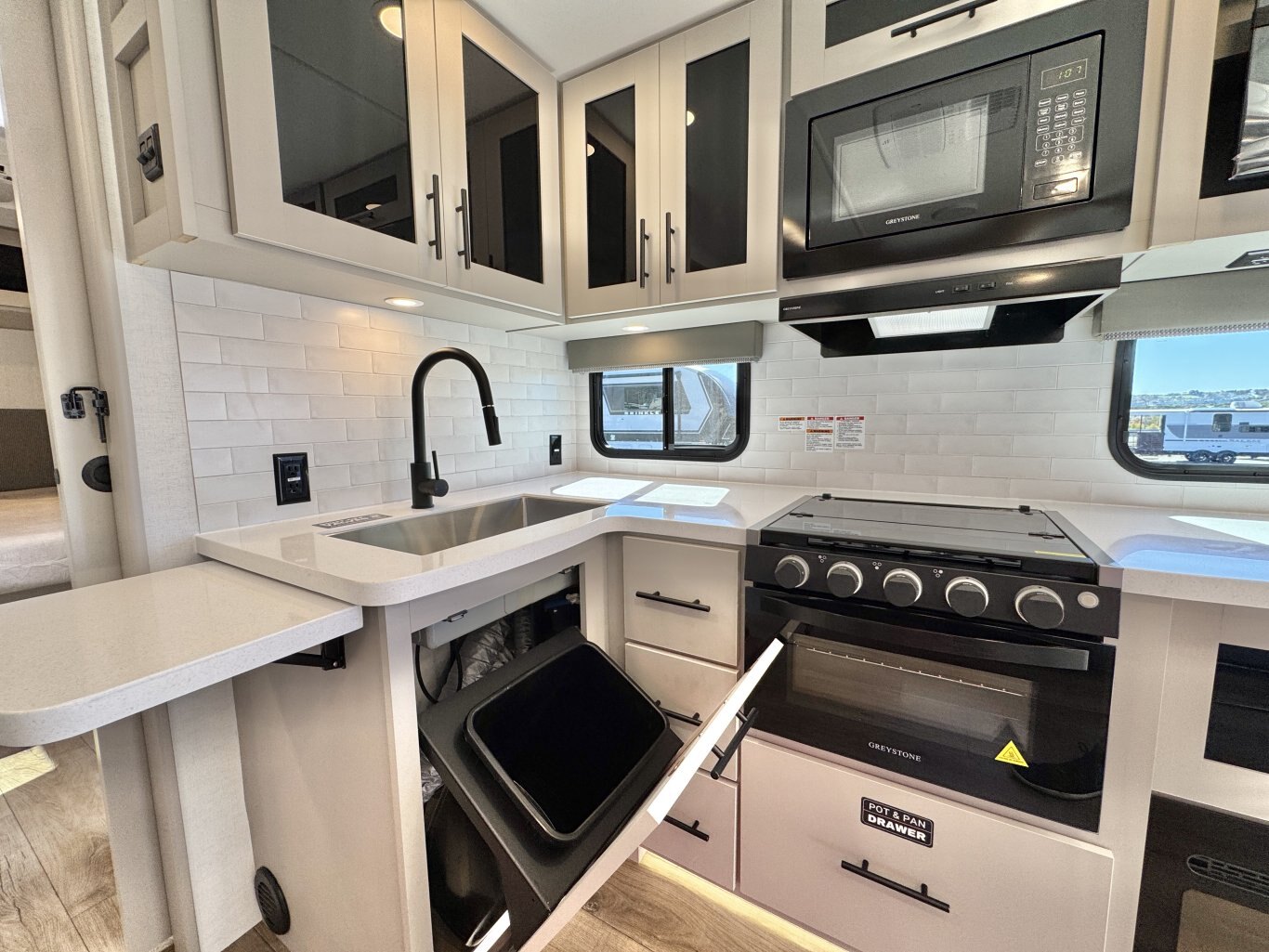 -Kitchen includes a 10 cu. ft. 12V refrigerator, pantry, and flip-up counter extension for added prep space
