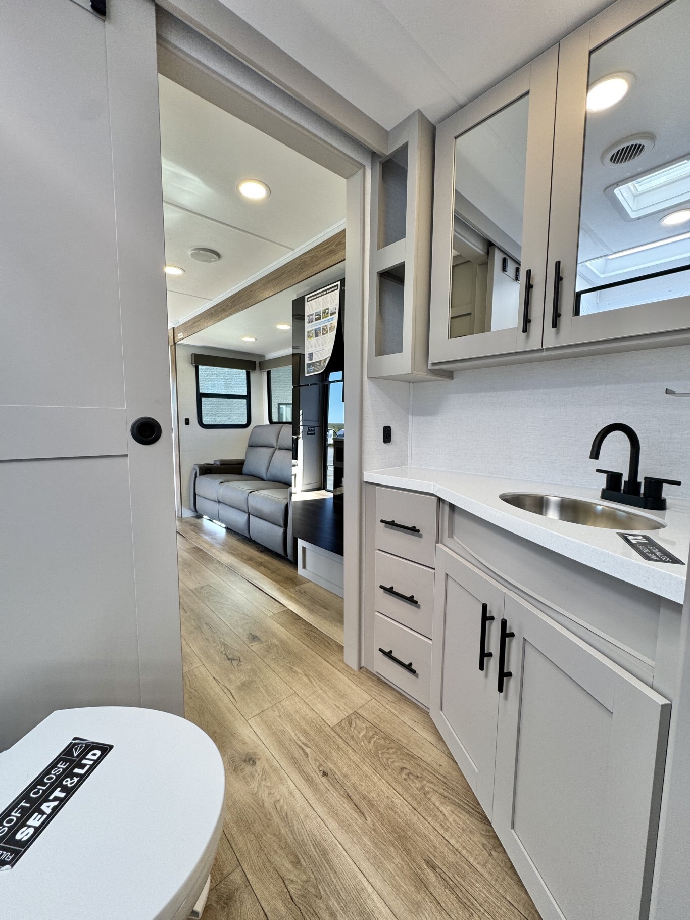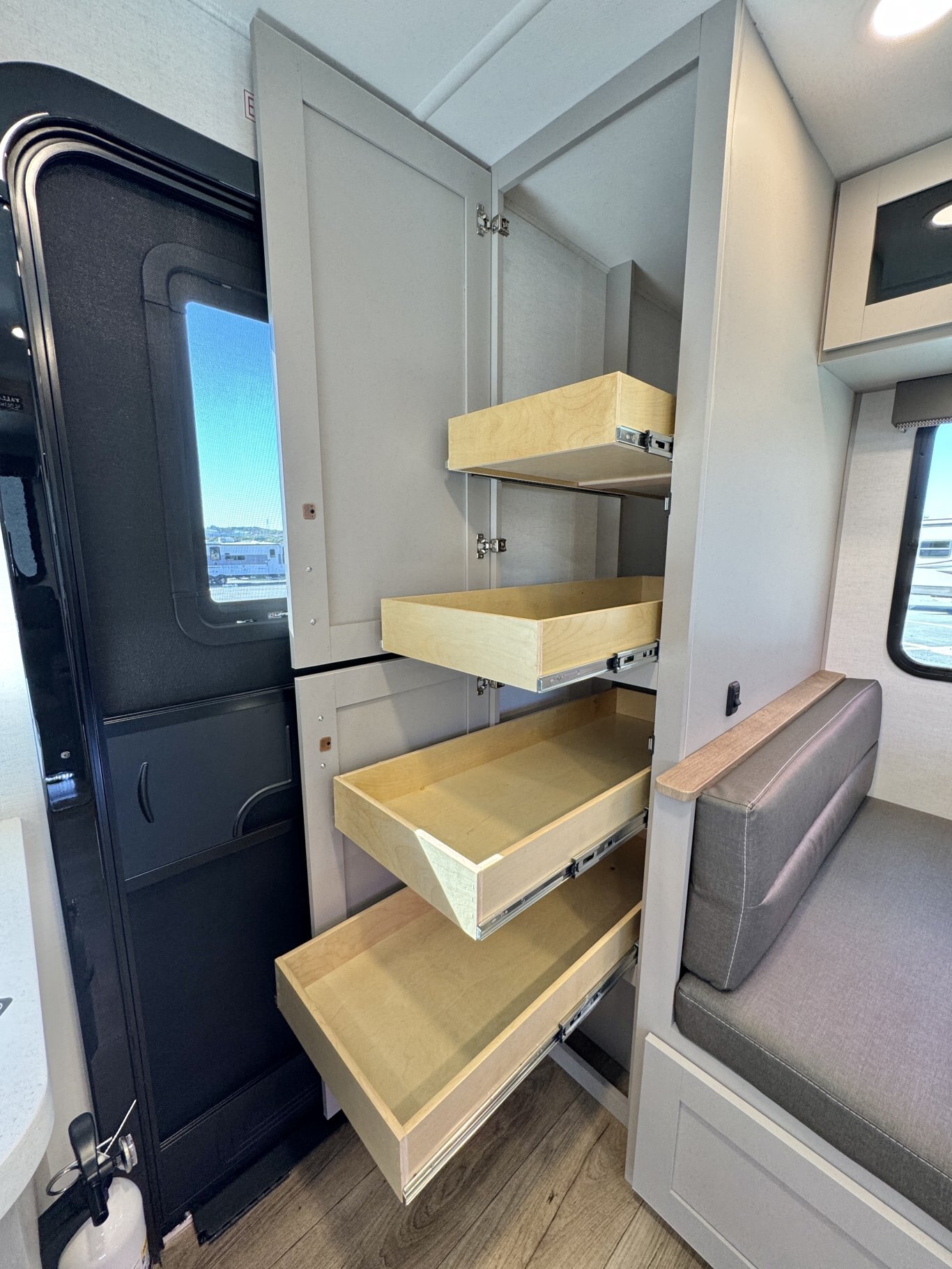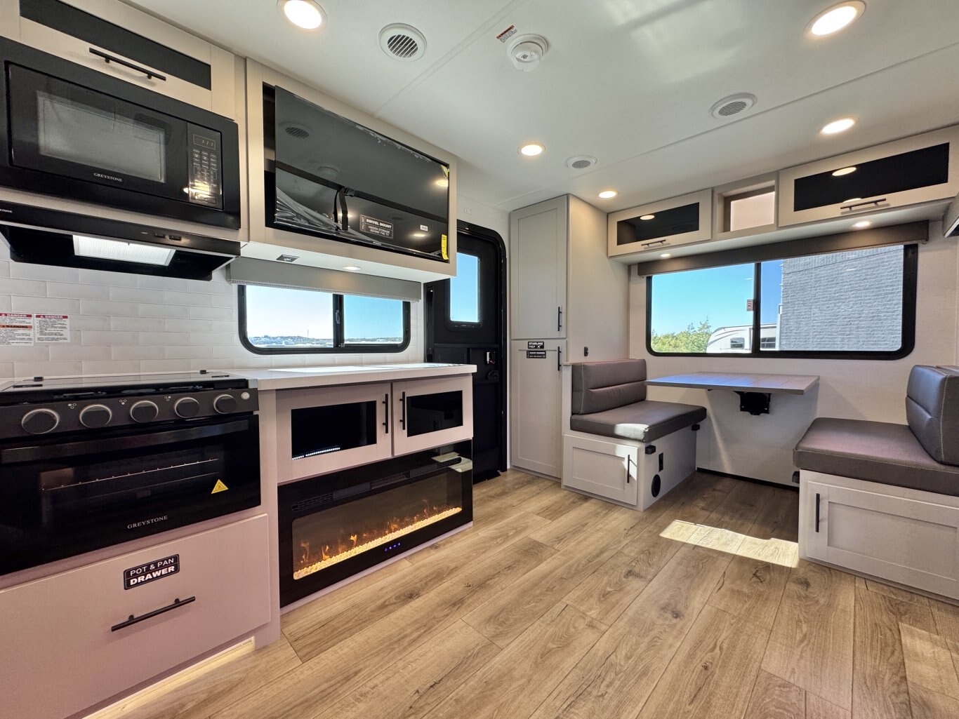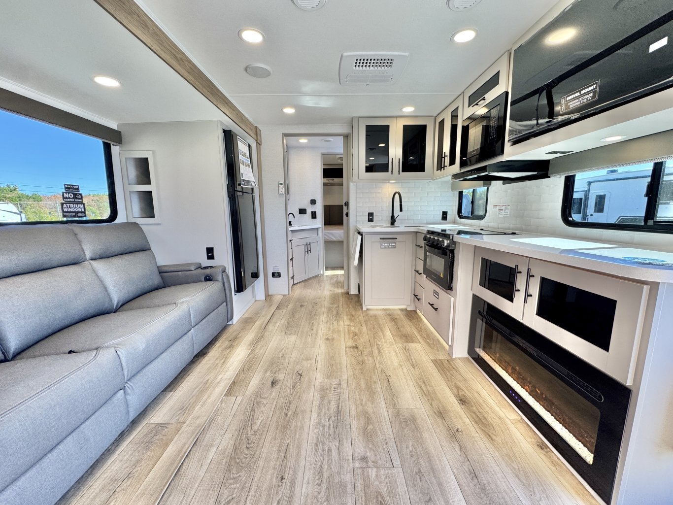 -Kitchen includes a 10 cu. ft. 12V refrigerator, pantry, and flip-up counter extension for added prep space