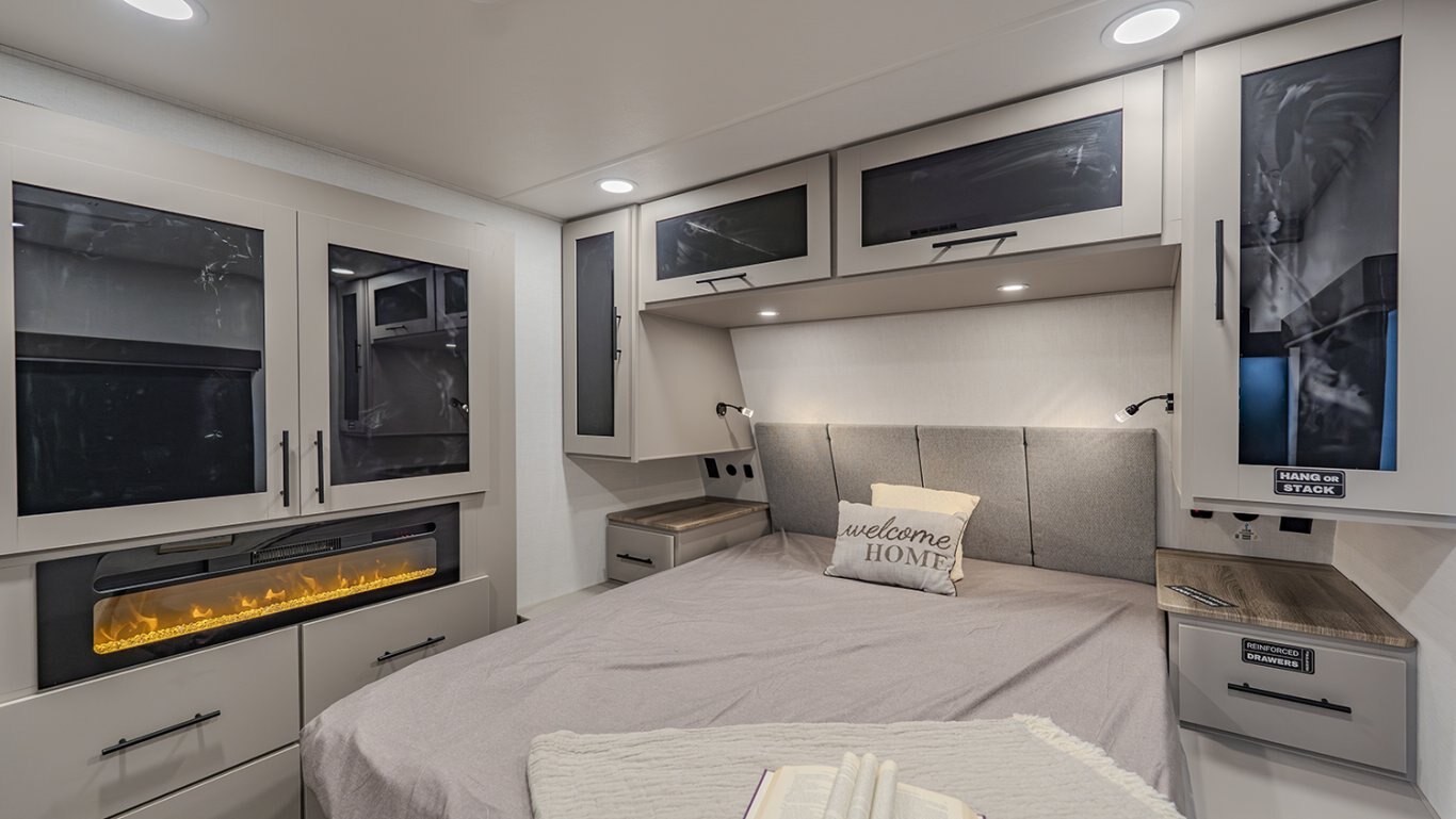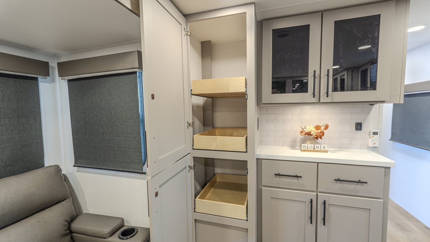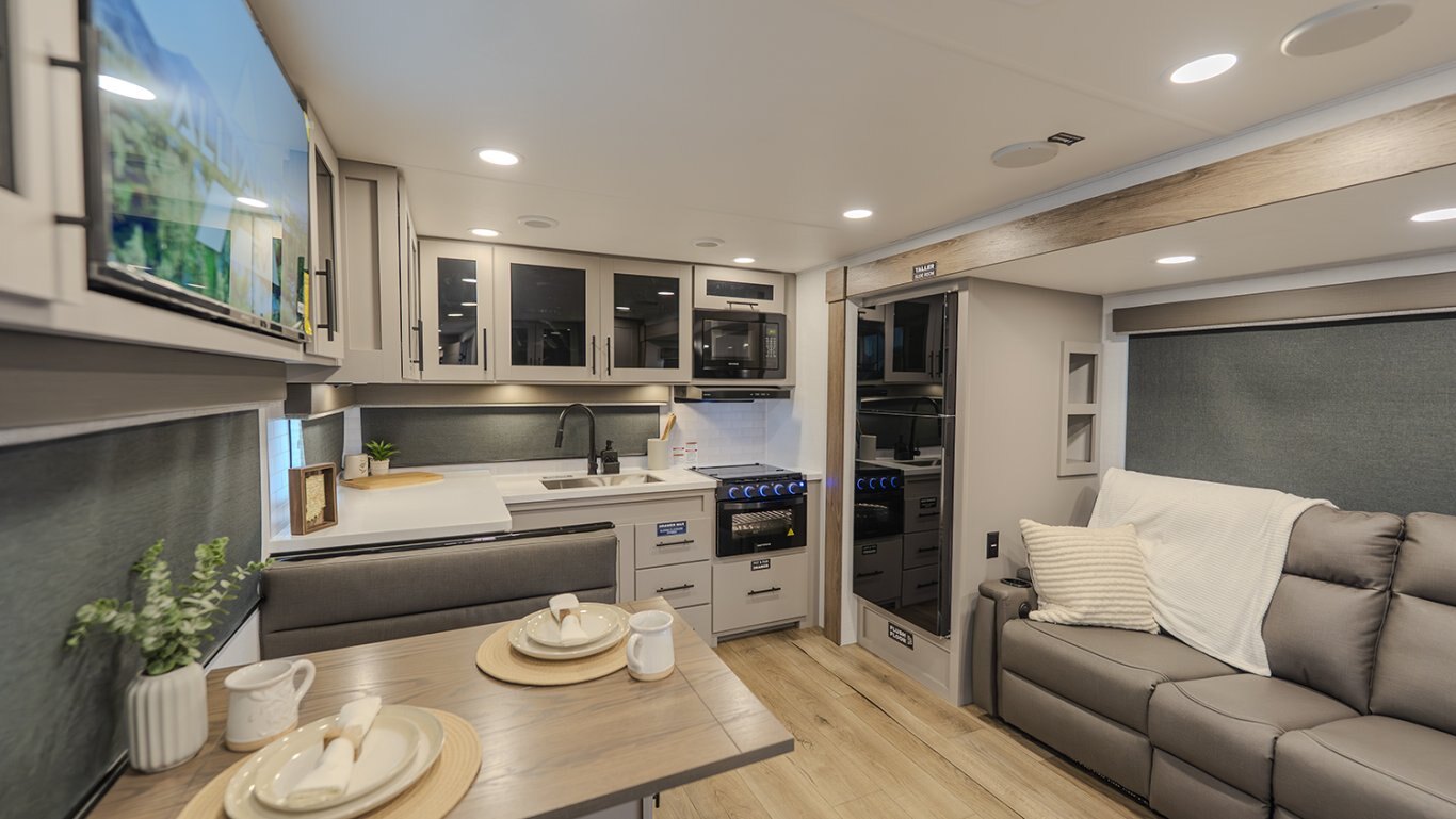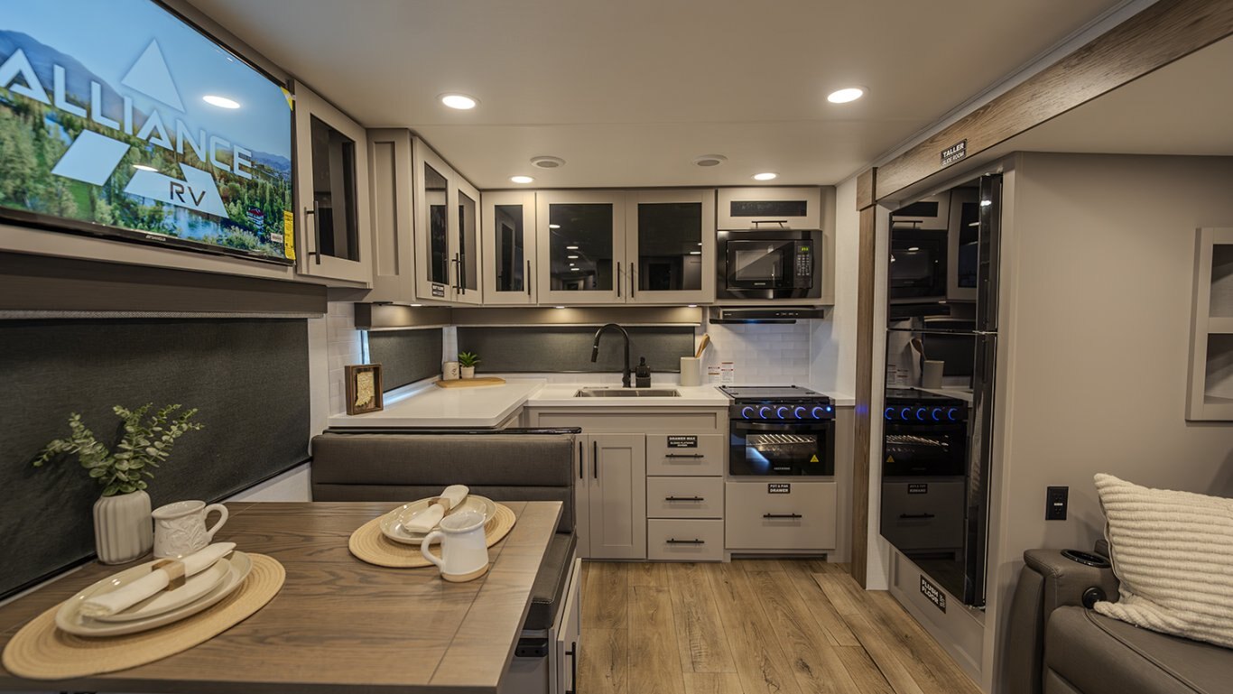 | The Delta 274RKW offers a sleek, rear-kitchen design perfect for couples or small families looking for comfort and utility on the road. A spacious kitchen and entertainment-ready living area make it easy to unwind, featuring a theater seat, 40" TV, and optional freestanding dining setup. Smart storage solutions like a pull-out pantry and overhead cabinets keep essentials organized. The full bath with washer/dryer prep and the private queen bedroom with built-in fireplace and wardrobes add a residential feel. With a 19' awning, outdoor griddle, and well-thought-out layout, the 274RKW makes every trip feel like a retreat. |