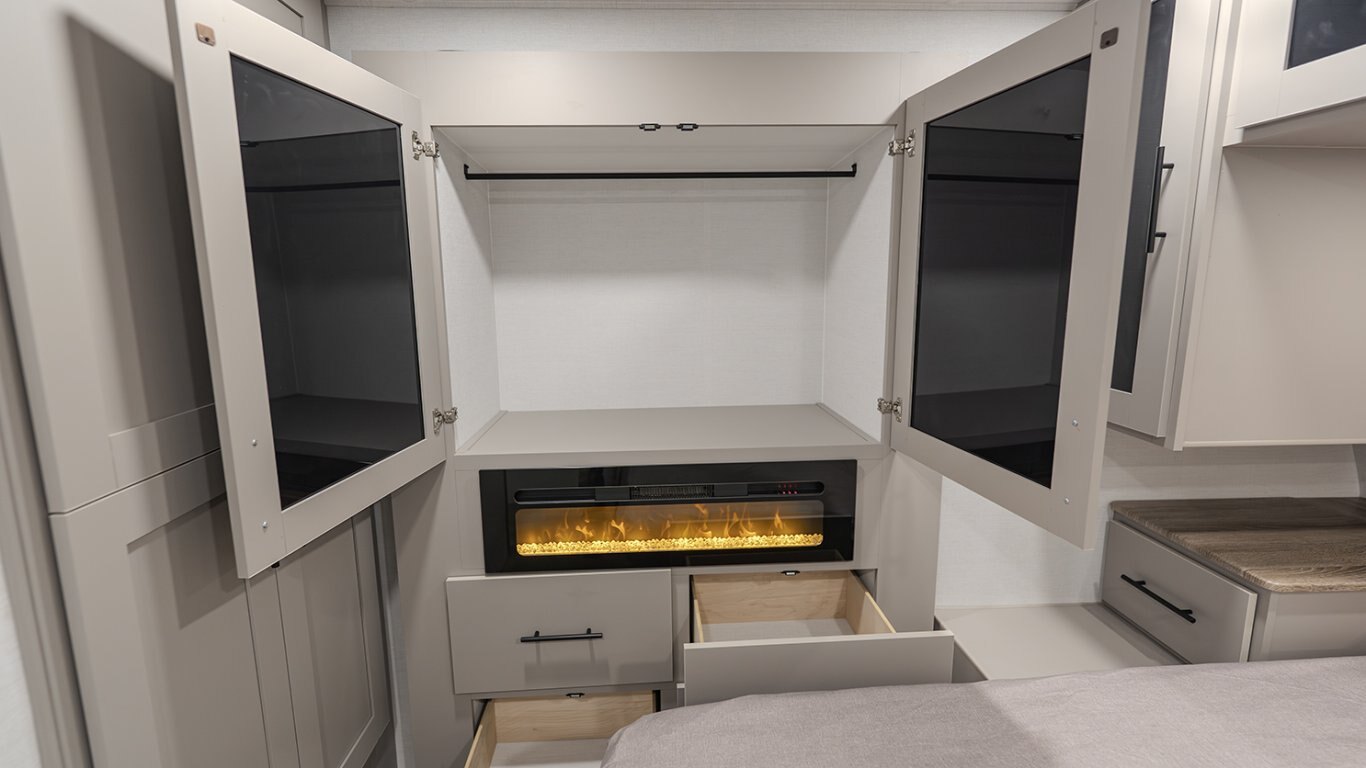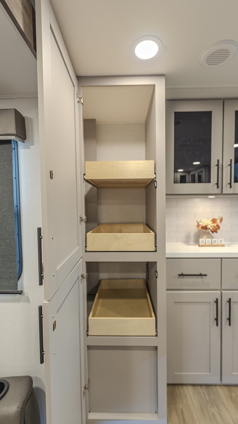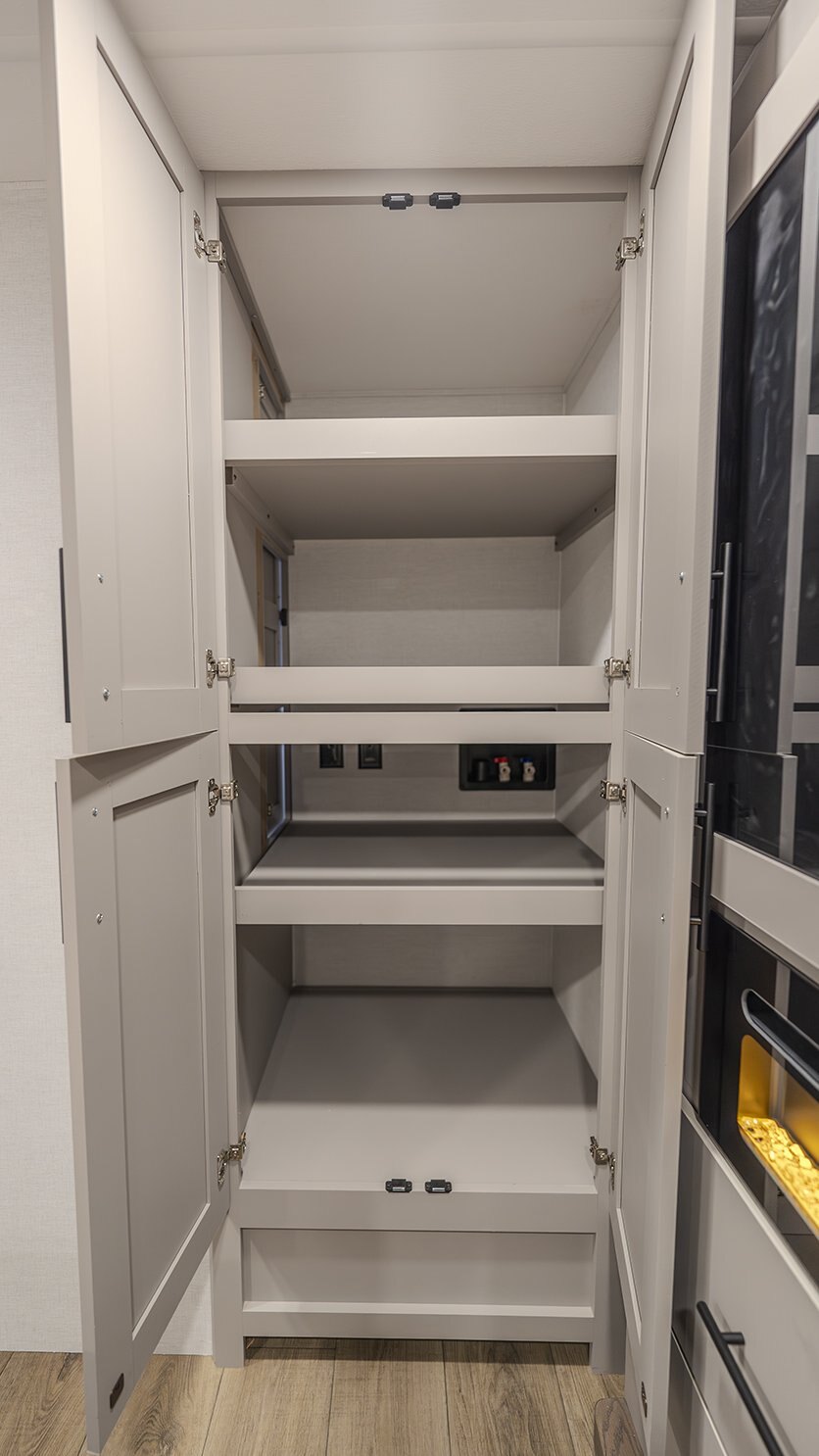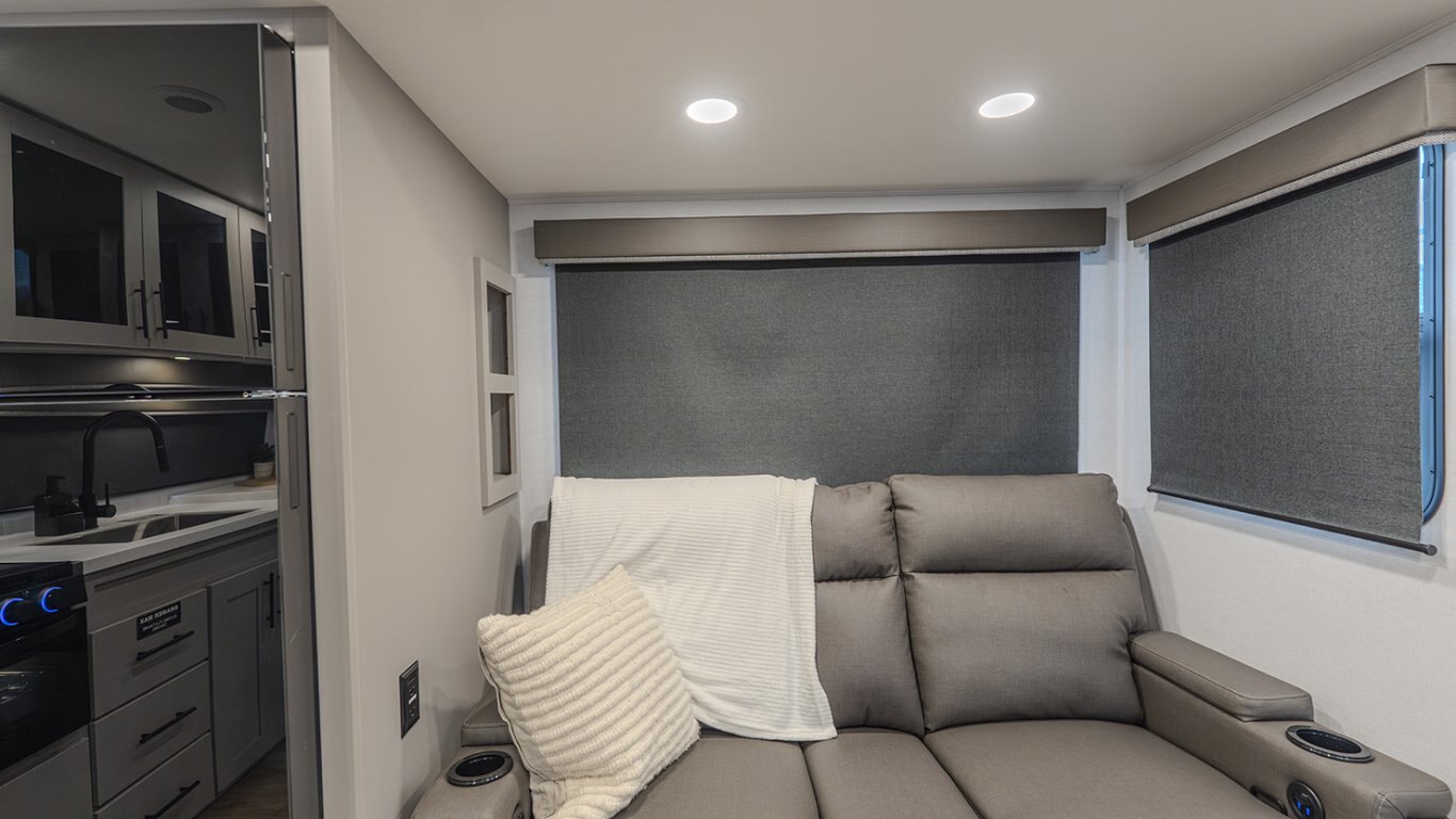 | The Delta 274RKW offers a sleek, rear-kitchen design perfect for couples or small families looking for comfort and utility on the road. A spacious kitchen and entertainment-ready living area make it easy to unwind, featuring a theater seat, 40" TV, and optional freestanding dining setup. Smart storage solutions like a pull-out pantry and overhead cabinets keep essentials organized. The full bath with washer/dryer prep and the private queen bedroom with built-in fireplace and wardrobes add a residential feel. With a 19' awning, outdoor griddle, and well-thought-out layout, the 274RKW makes every trip feel like a retreat. |