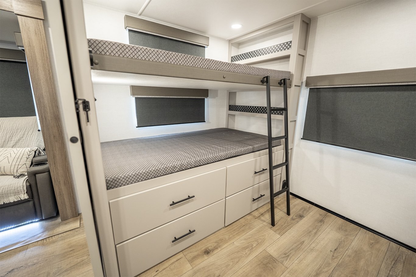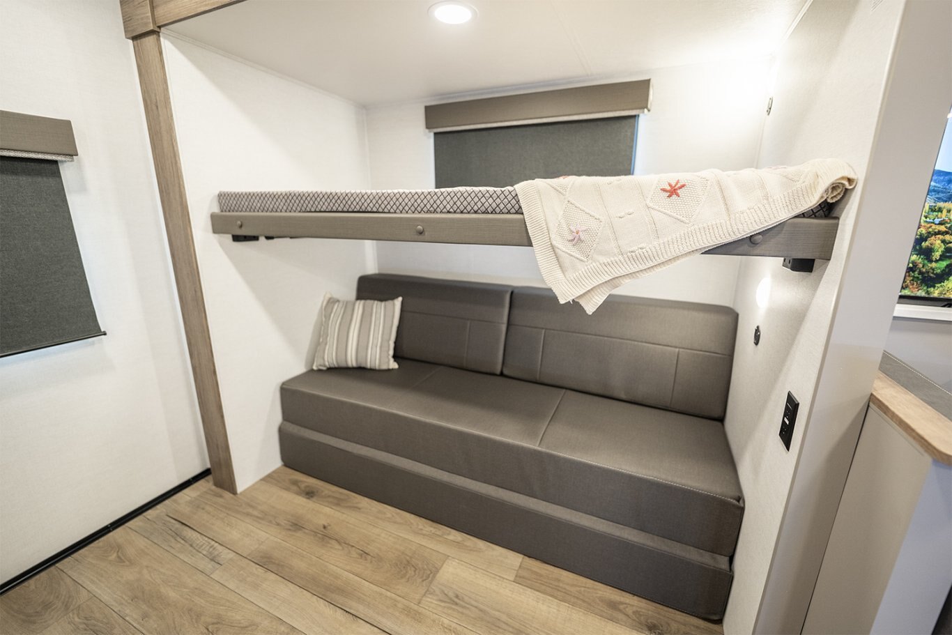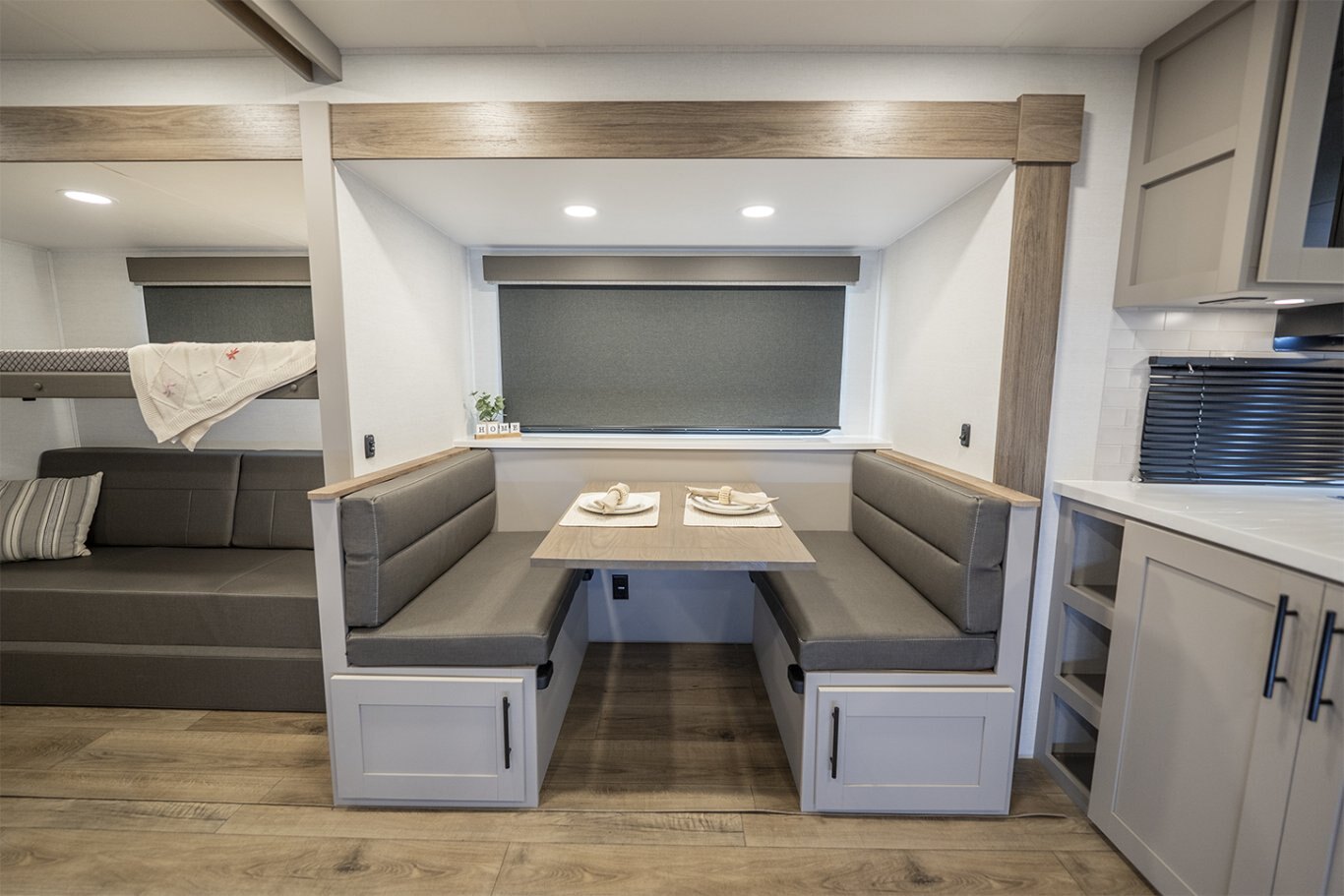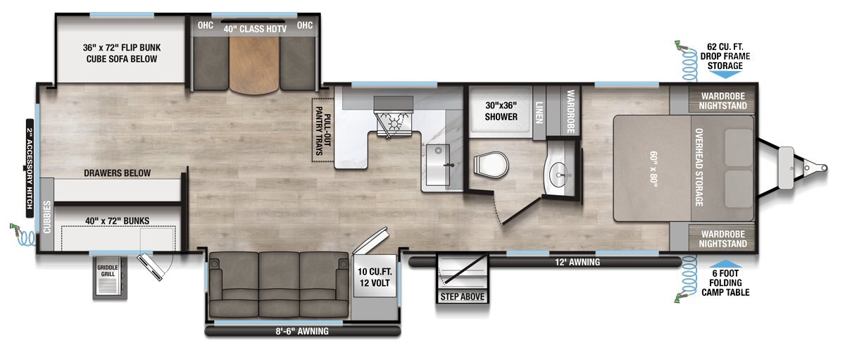 The Delta 321BH is the perfect family travel trailer, offering a spacious layout with a dedicated rear bunkhouse that keeps kids or guests comfortable and organized. The main living area delivers relaxation with theater seating and an entertainment center featuring a 40" HDTV and smart storage. A fully equipped kitchen and outdoor griddle give you the flexibility to cook wherever the mood strikes. The front queen bedroom ensures a quiet retreat, while the full bath and hallway access add everyday convenience. With dual awnings, massive storage, and flexible sleeping space, the 321BH turns every family getaway into an elevated adventure. |
