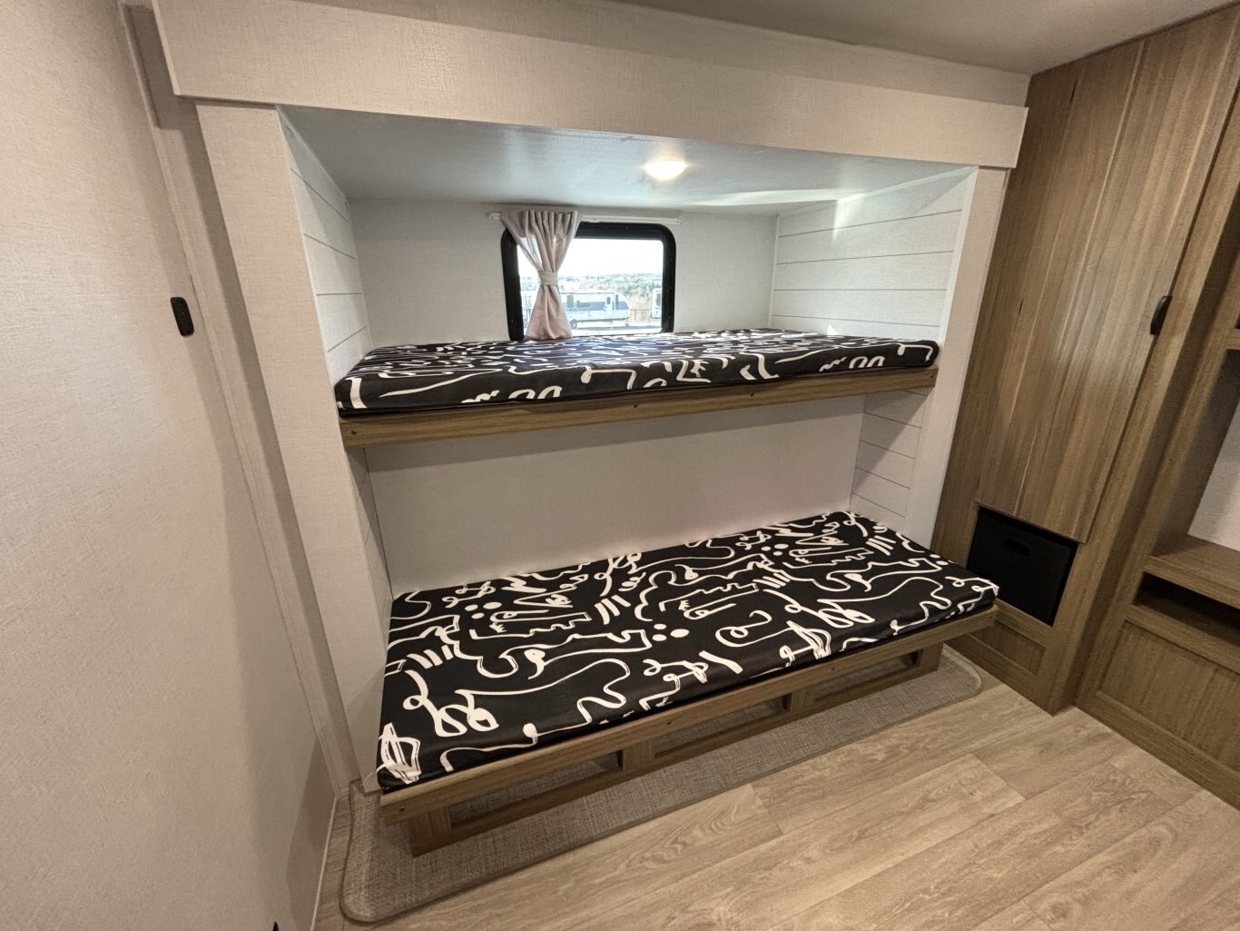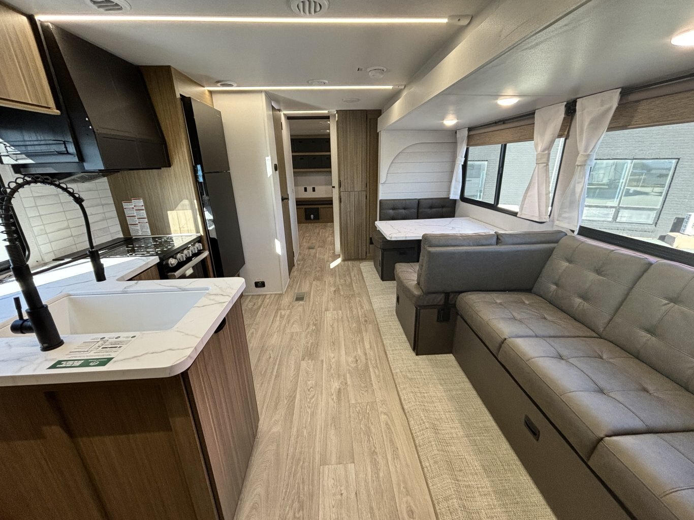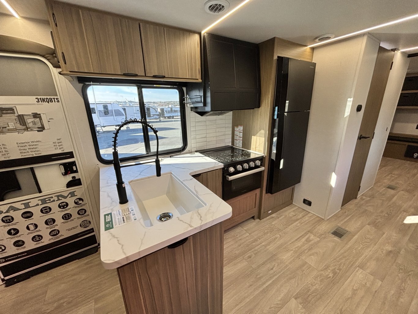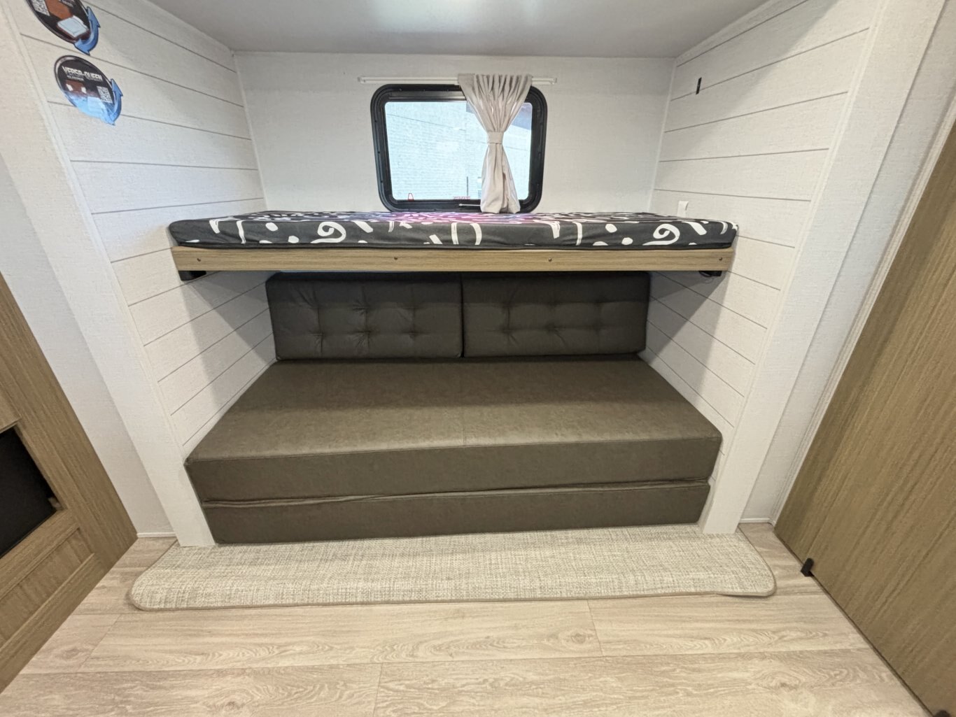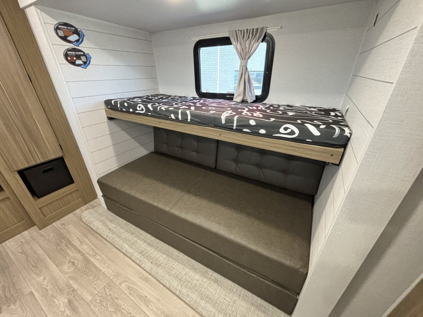 The 31KQBTS is the ultimate bunkhouse, with three total slide outs and an outside kitchen. This well-equipped travel trailer features oversized panoramic windows, the ever-popular U-dinette, which you can customize with the adjacent Versa-Lounge. The kitchen includes a 11 CU. FT. refrigerator and stovetop with oven and LED accents, plus cabinets for all your cooking essentials!