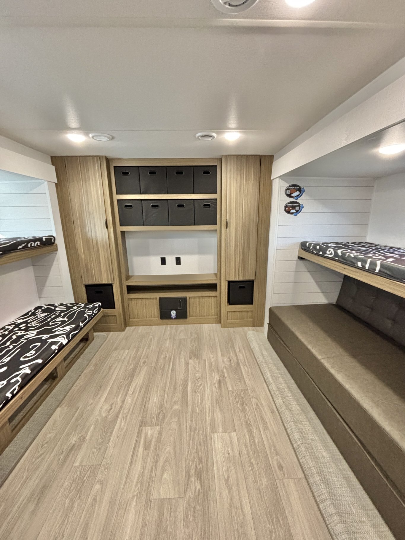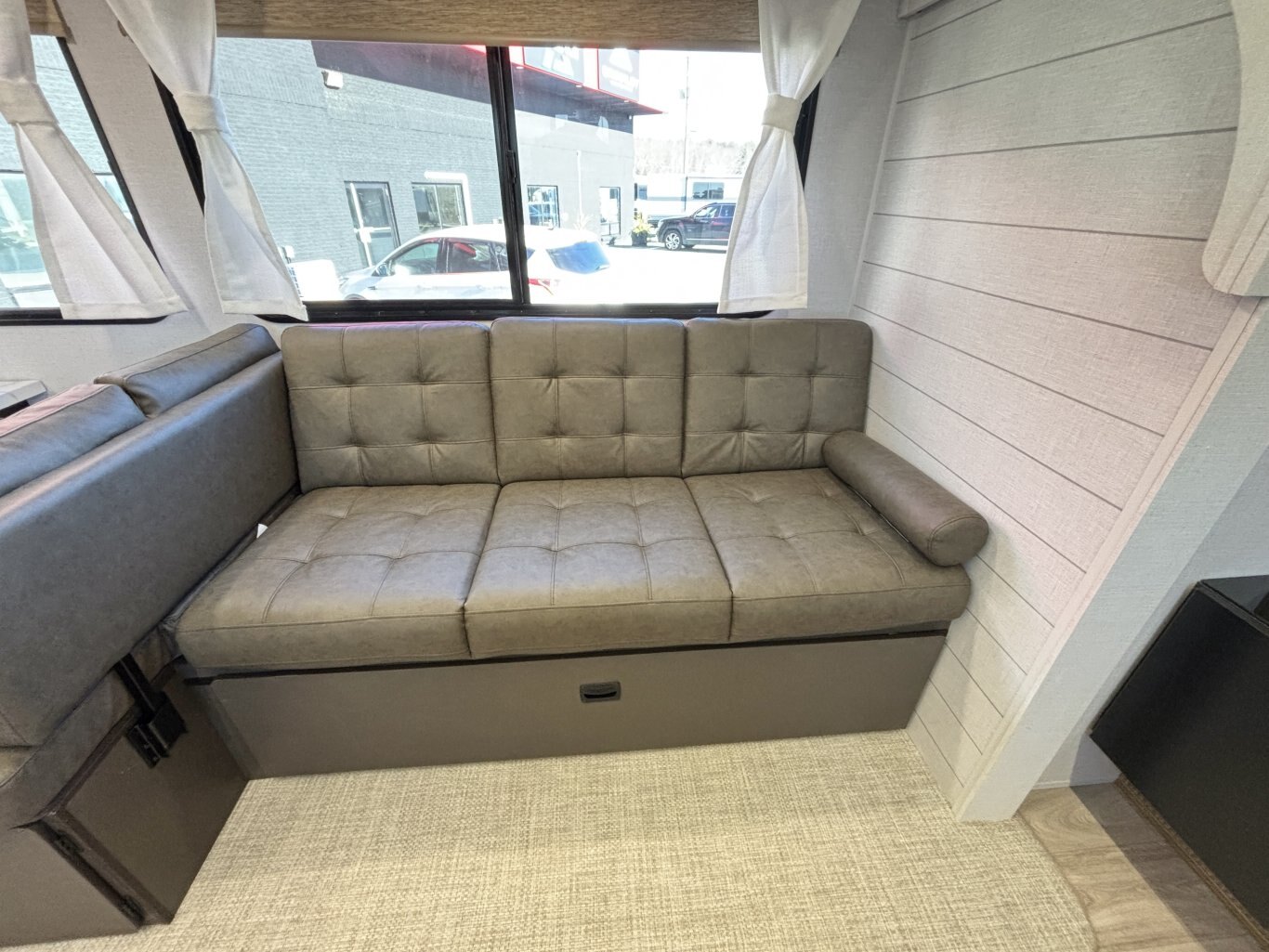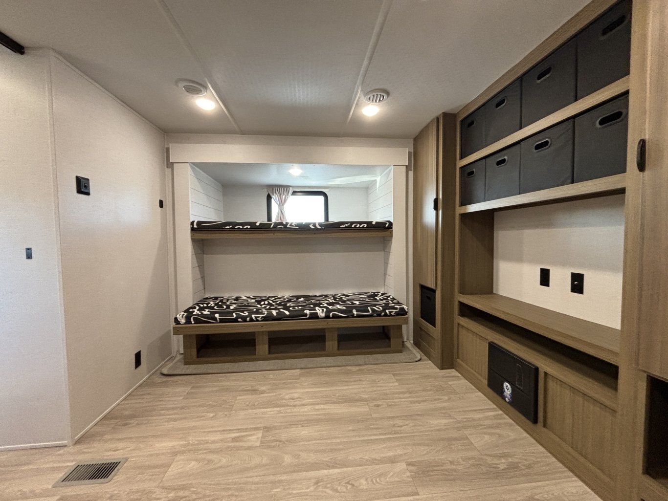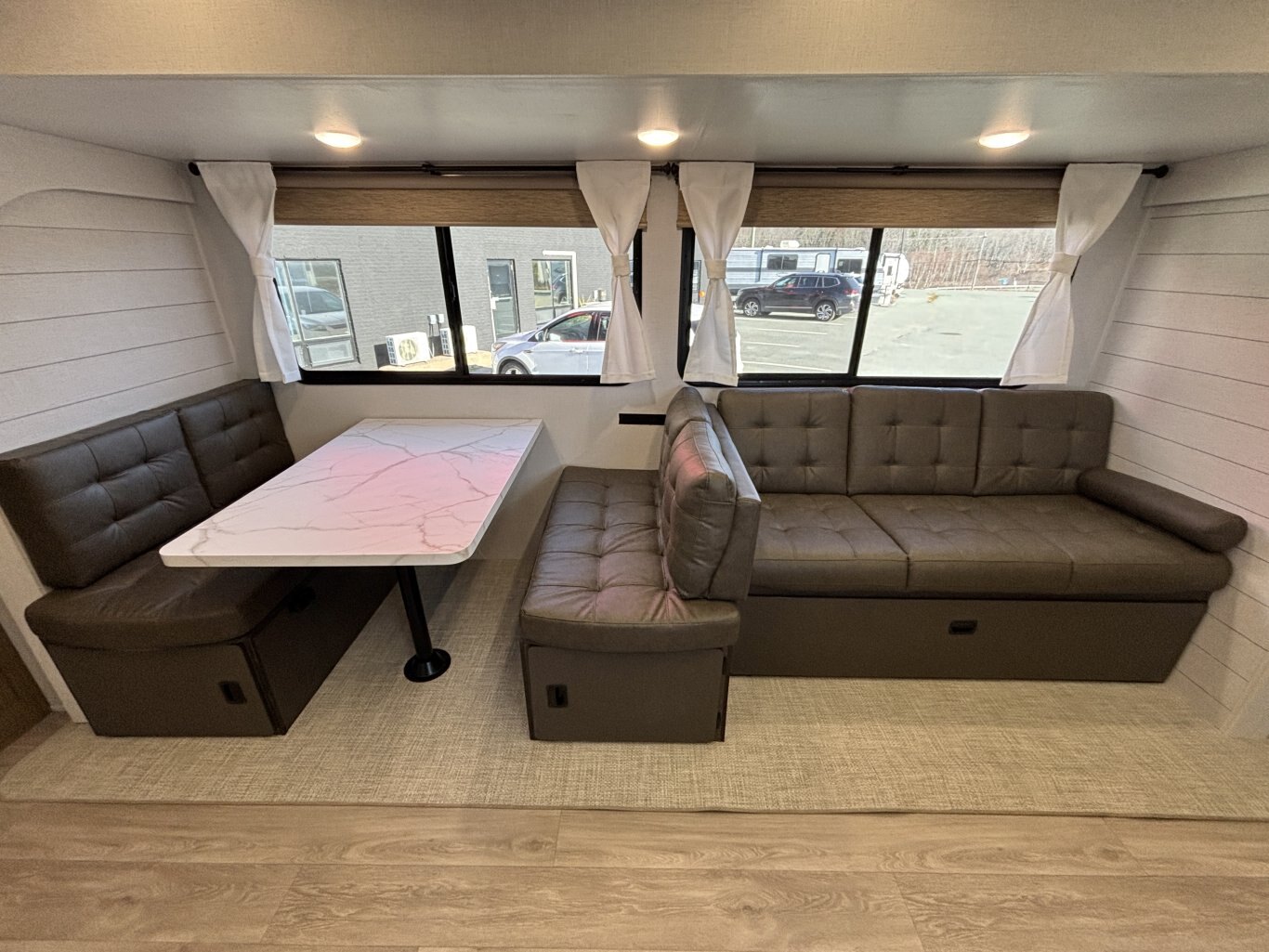 The 31KQBTS is the ultimate bunkhouse, with three total slide outs and an outside kitchen. This well-equipped travel trailer features oversized panoramic windows, the ever-popular U-dinette, which you can customize with the adjacent Versa-Lounge. The kitchen includes a 11 CU. FT. refrigerator and stovetop with oven and LED accents, plus cabinets for all your cooking essentials!