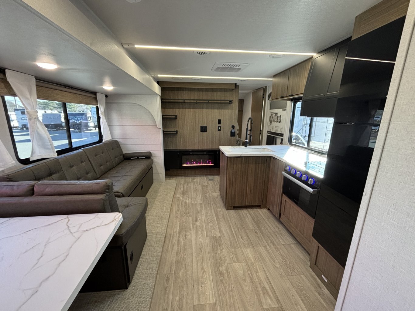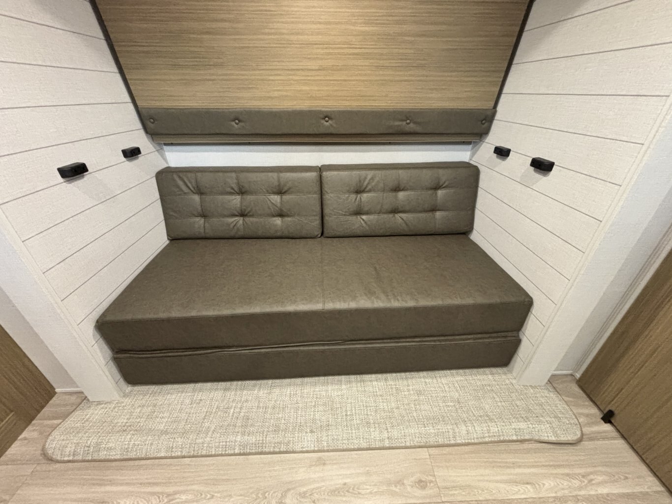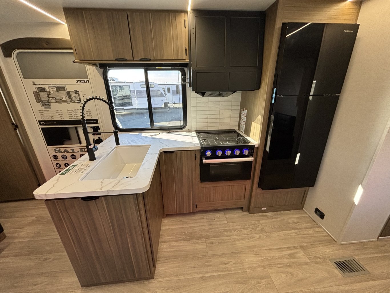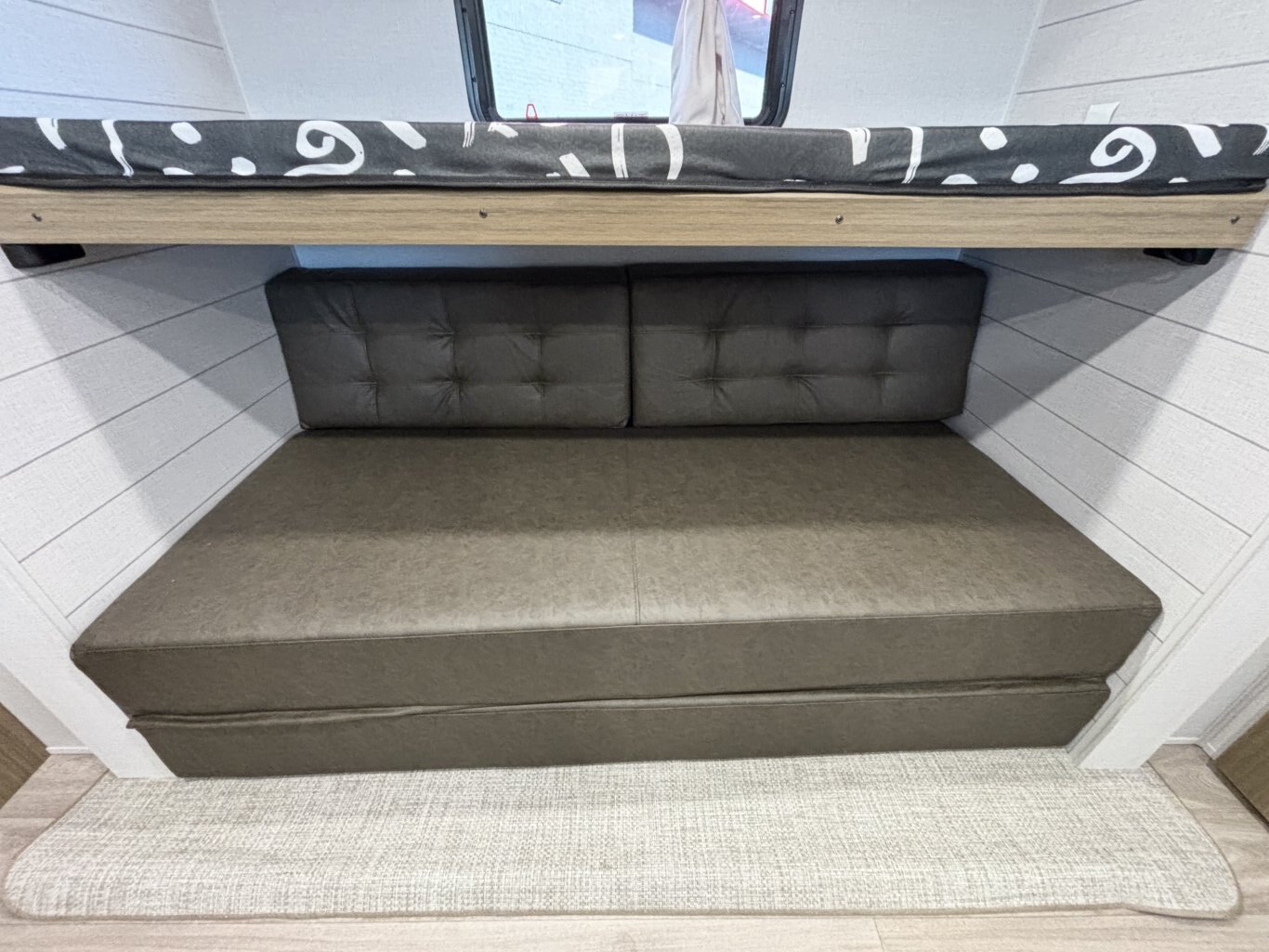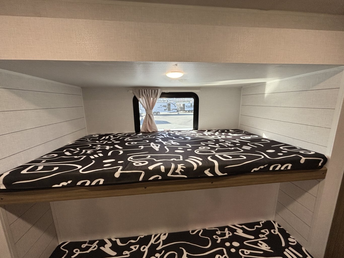 The 31KQBTS is the ultimate bunkhouse, with three total slide outs and an outside kitchen. This well-equipped travel trailer features oversized panoramic windows, the ever-popular U-dinette, which you can customize with the adjacent Versa-Lounge. The kitchen includes a 11 CU. FT. refrigerator and stovetop with oven and LED accents, plus cabinets for all your cooking essentials!