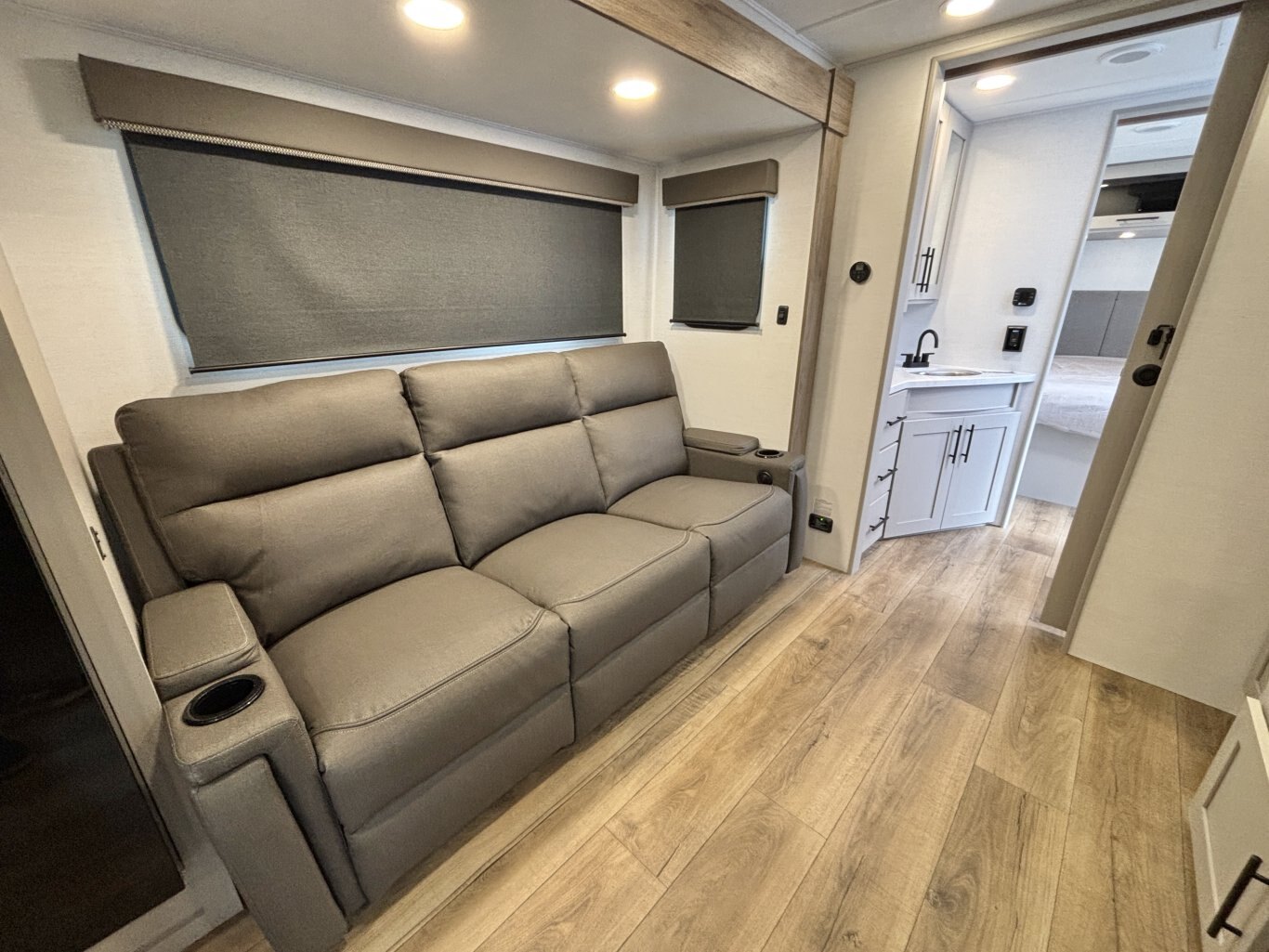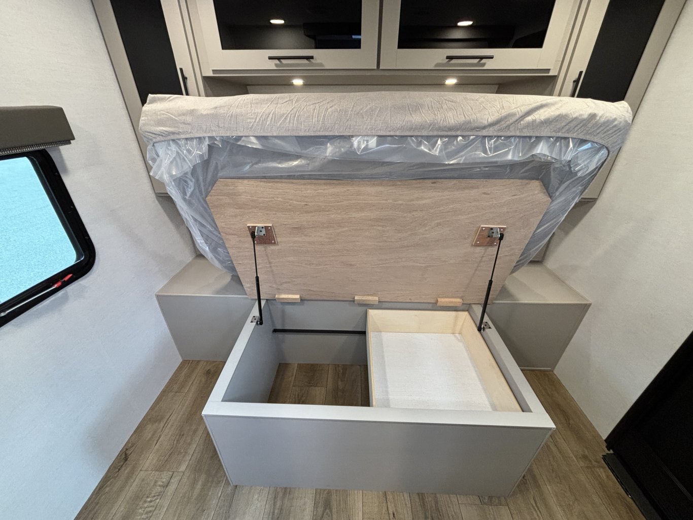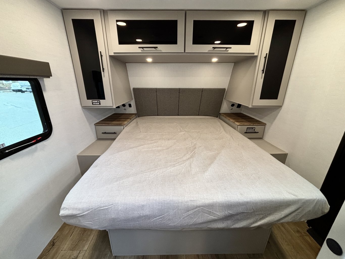The cozy front bedroom includes a queen bed with under-bed storage, overhead cabinets, and dual wardrobes—offering plenty of space for essentials. In the living area, the theater seating or optional tri-fold sofa is positioned perfectly for relaxing across from the entertainment center and fireplace.