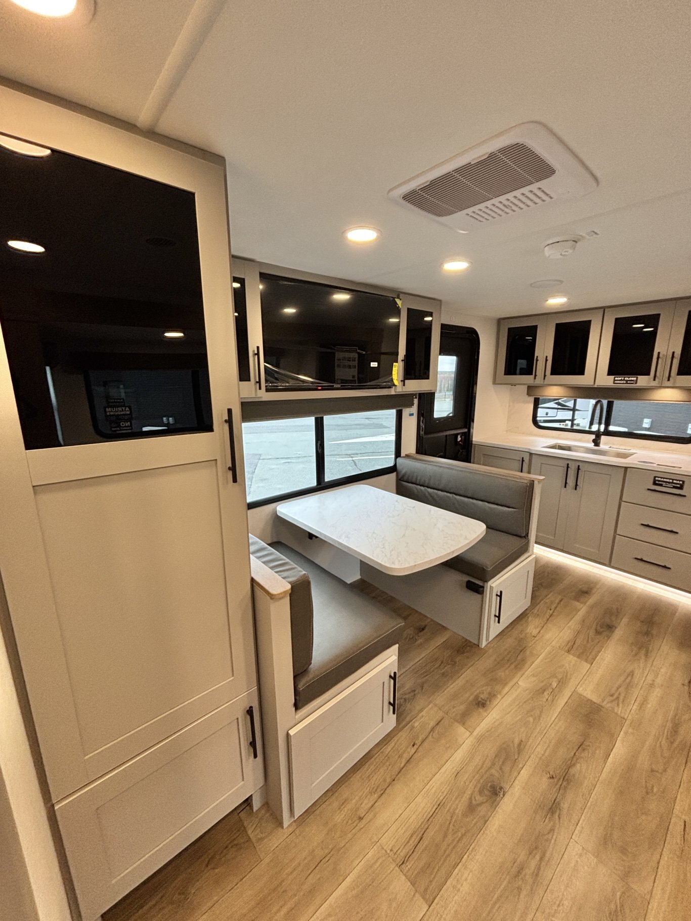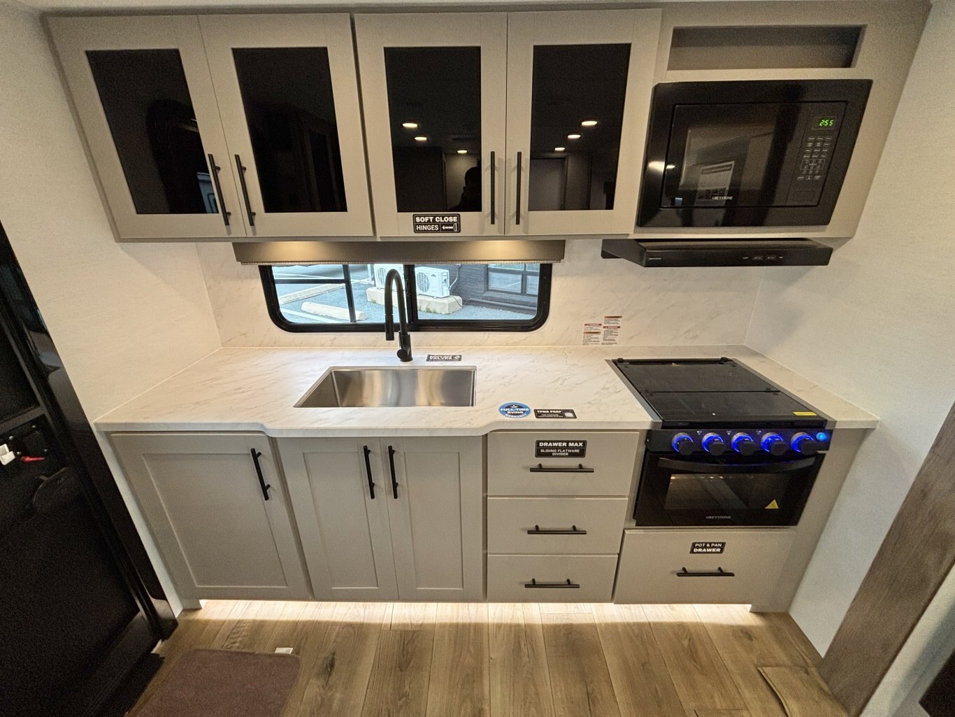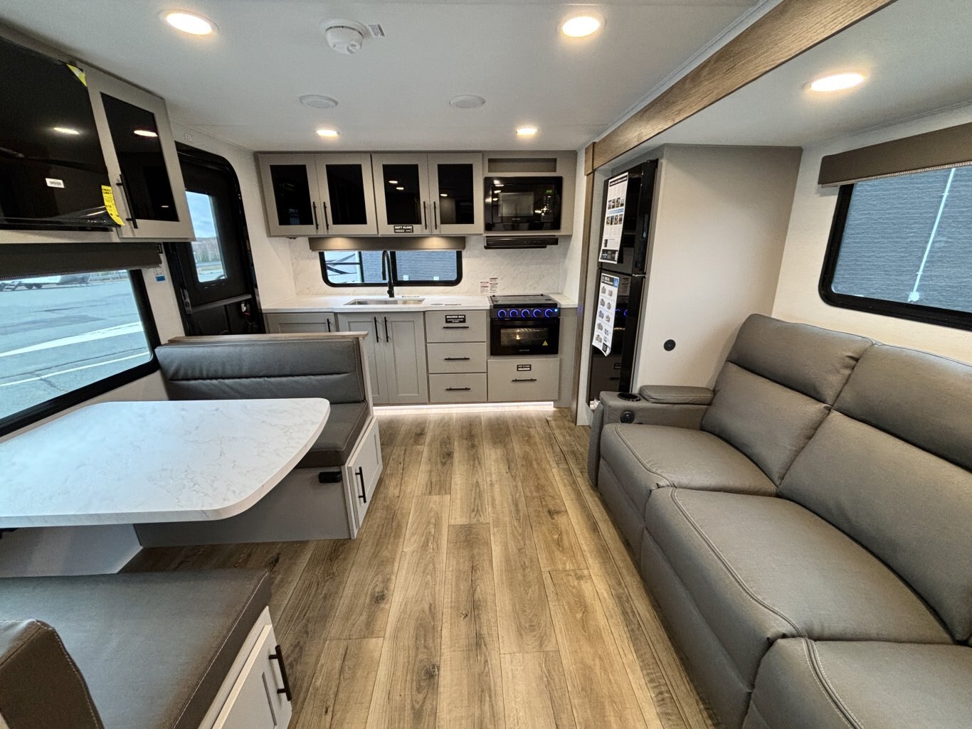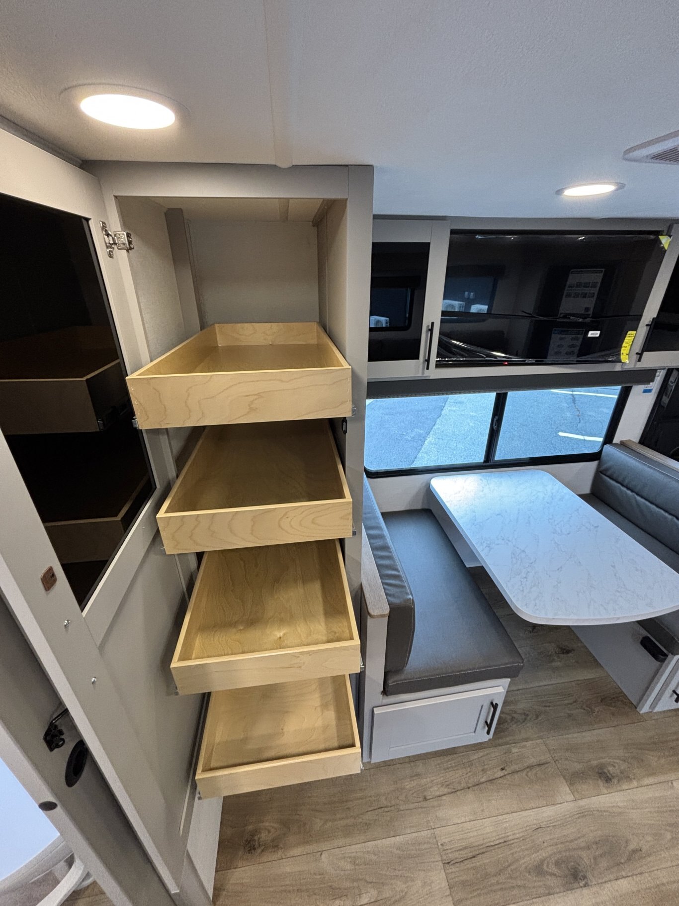 At just under 30 feet, the RK234 delivers a surprising sense of openness thanks to its rear kitchen layout, slide-out dinette, and large panoramic windows. The fully equipped kitchen features a residential microwave, high-rise faucet, and ample pantry storage, giving you everything you need to cook and dine comfortably wherever the road takes you.