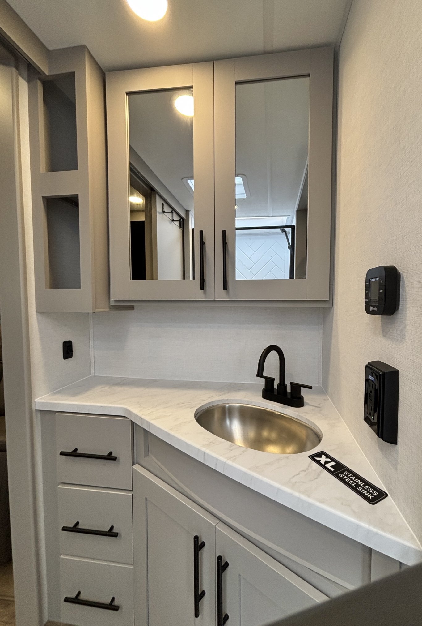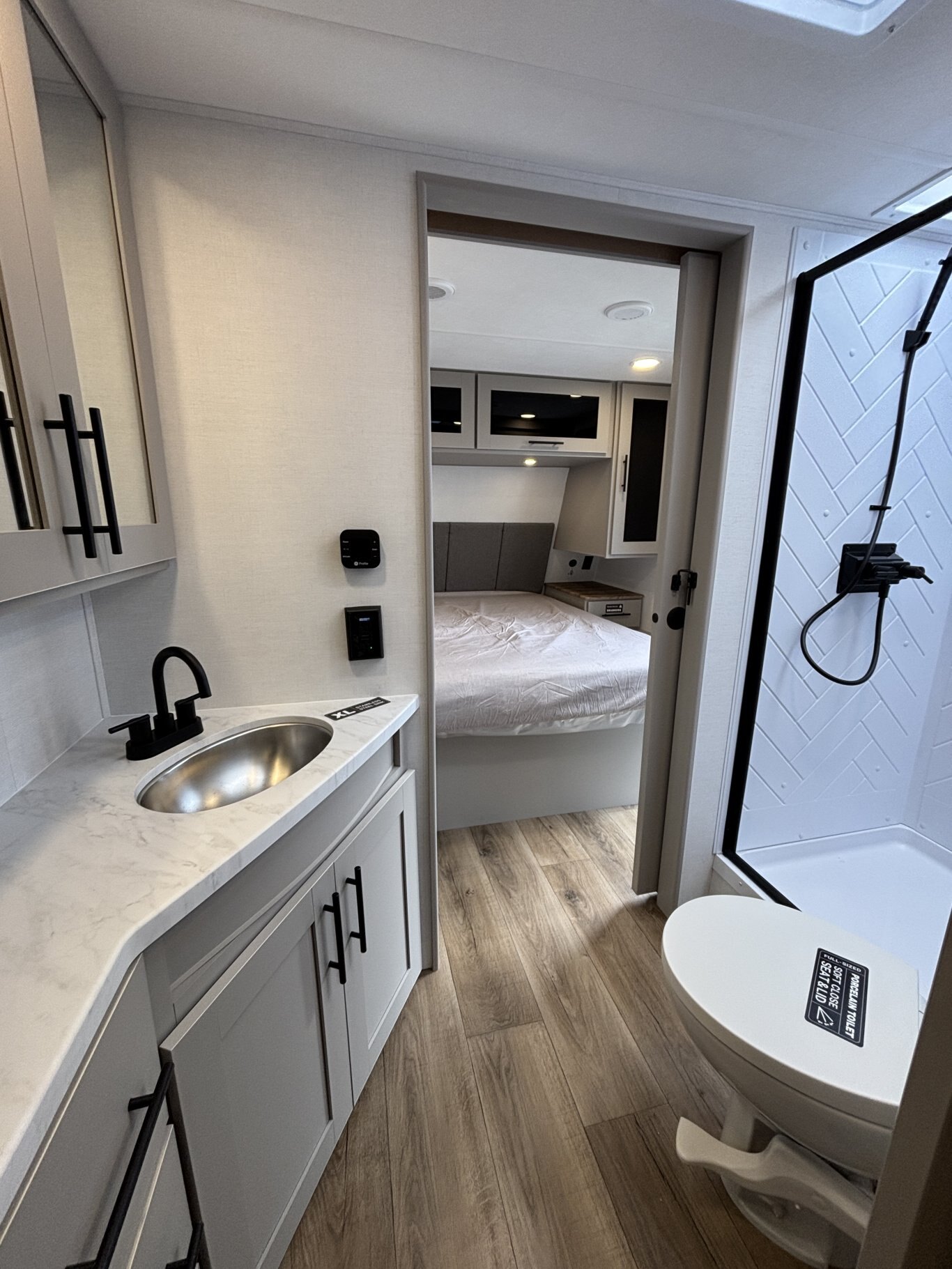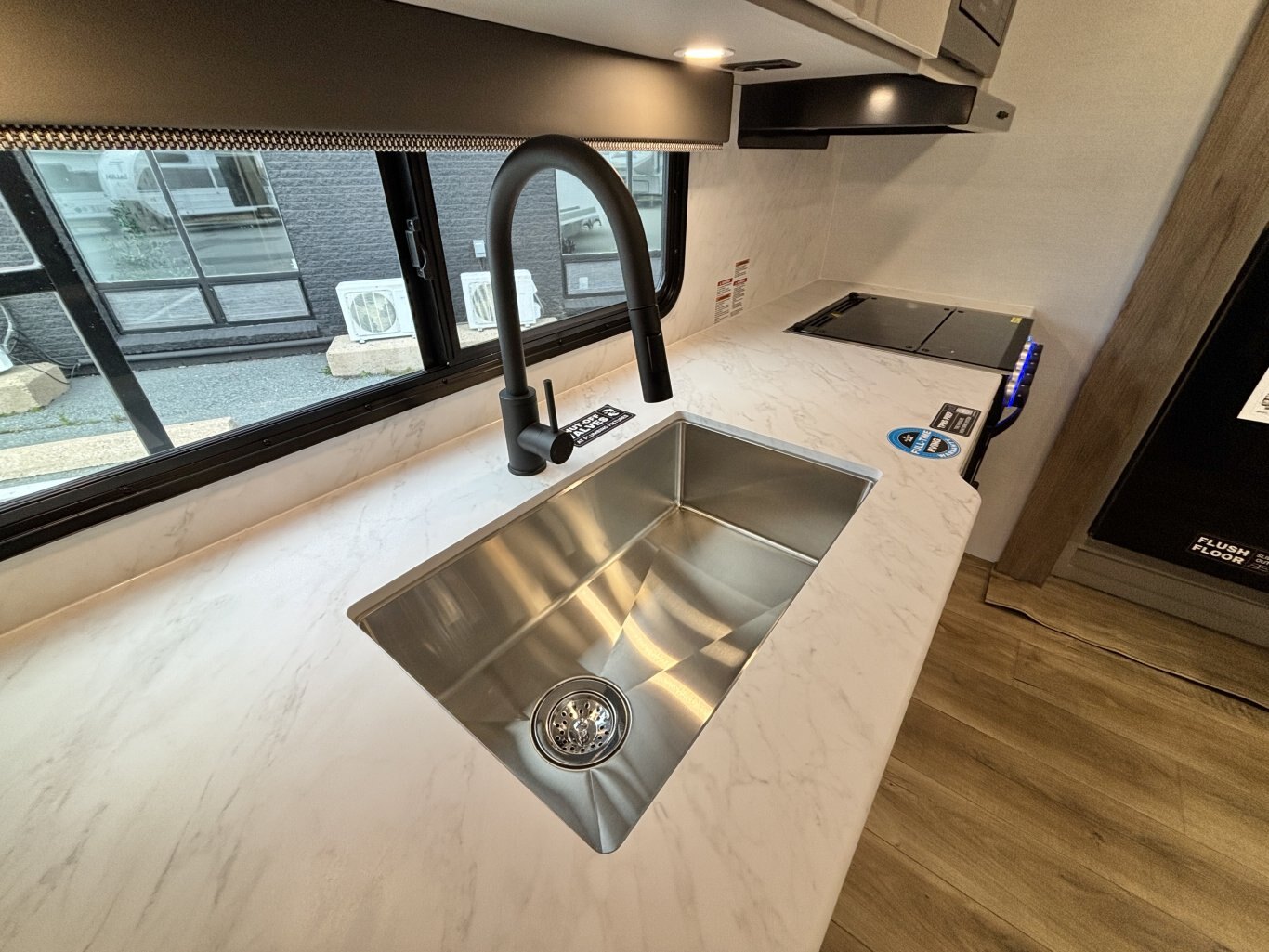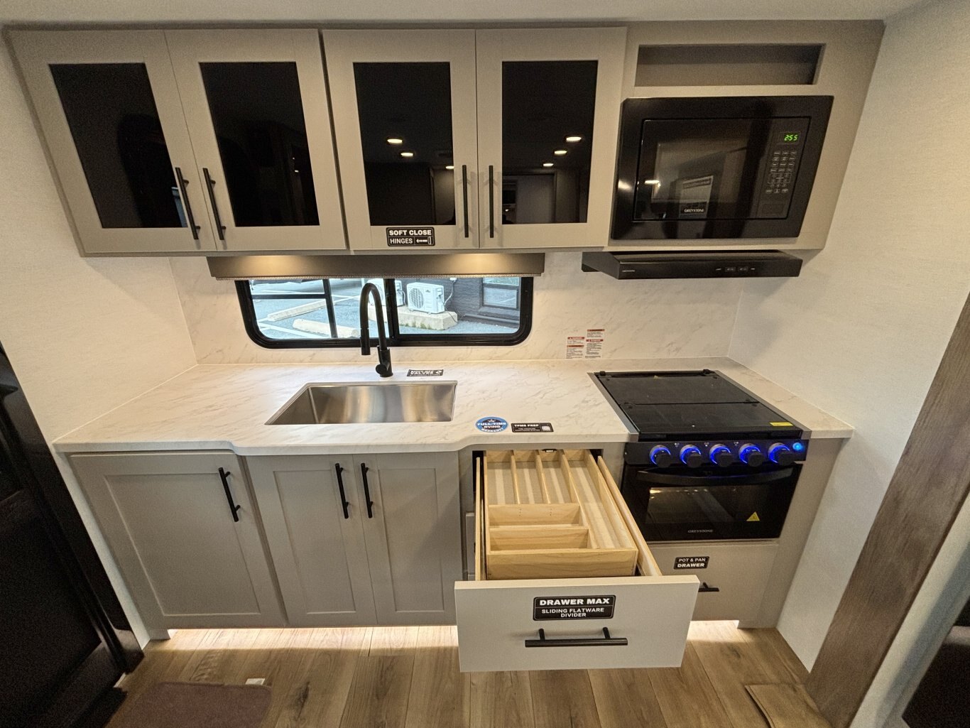 At just under 30 feet, the RK234 delivers a surprising sense of openness thanks to its rear kitchen layout, slide-out dinette, and large panoramic windows. The fully equipped kitchen features a residential microwave, high-rise faucet, and ample pantry storage, giving you everything you need to cook and dine comfortably wherever the road takes you.