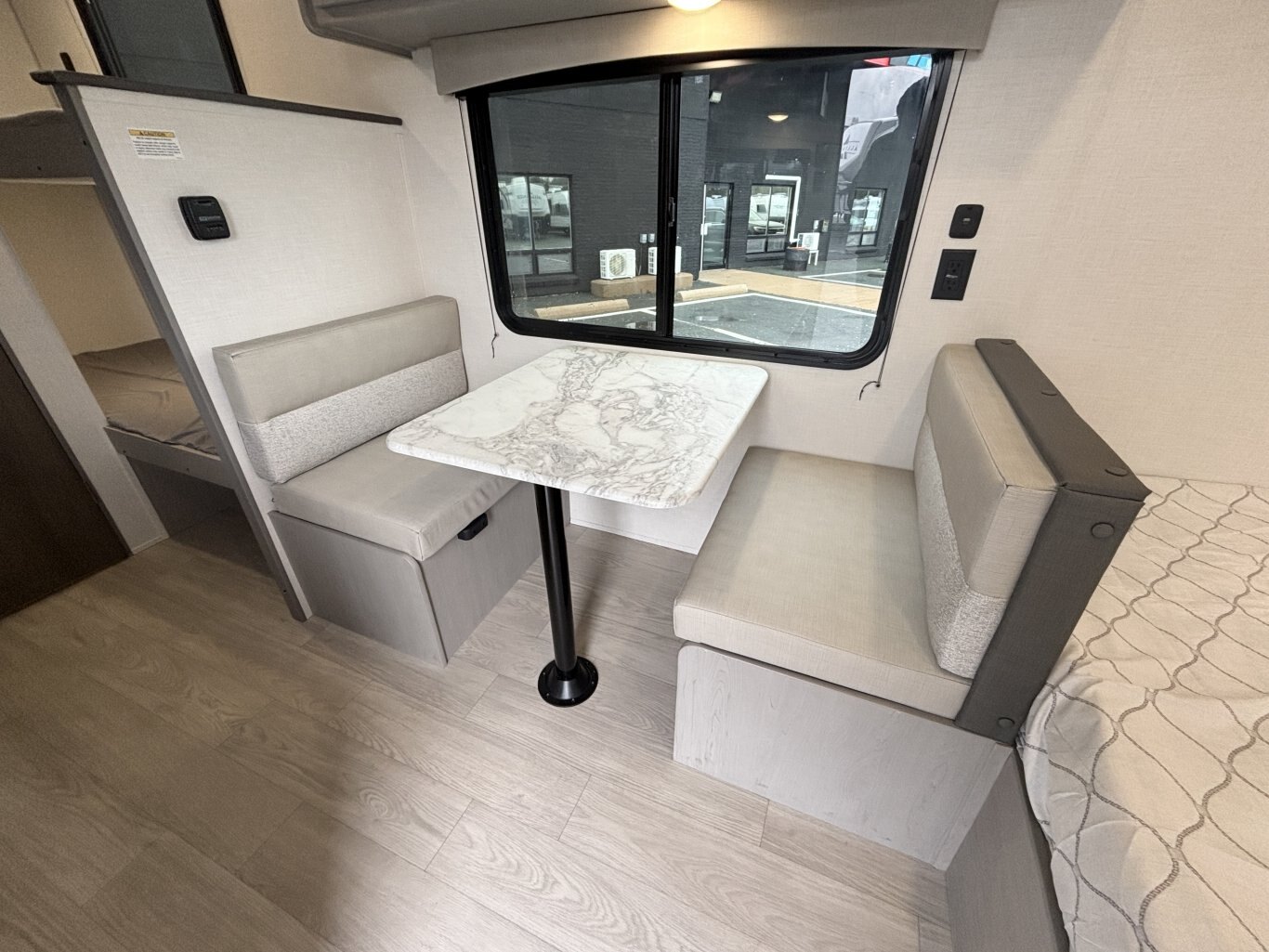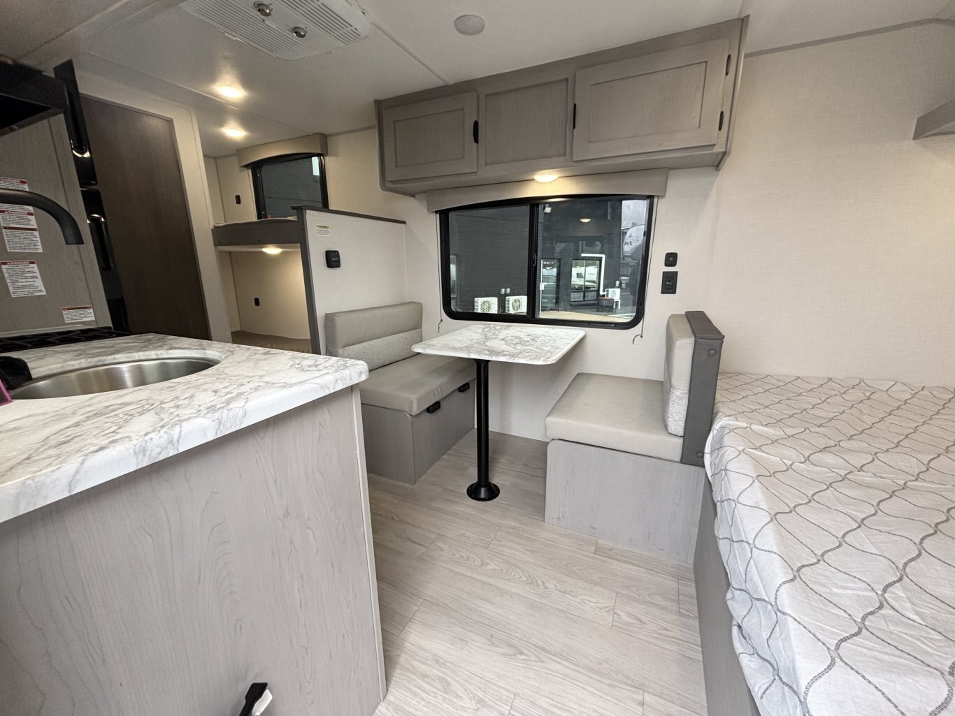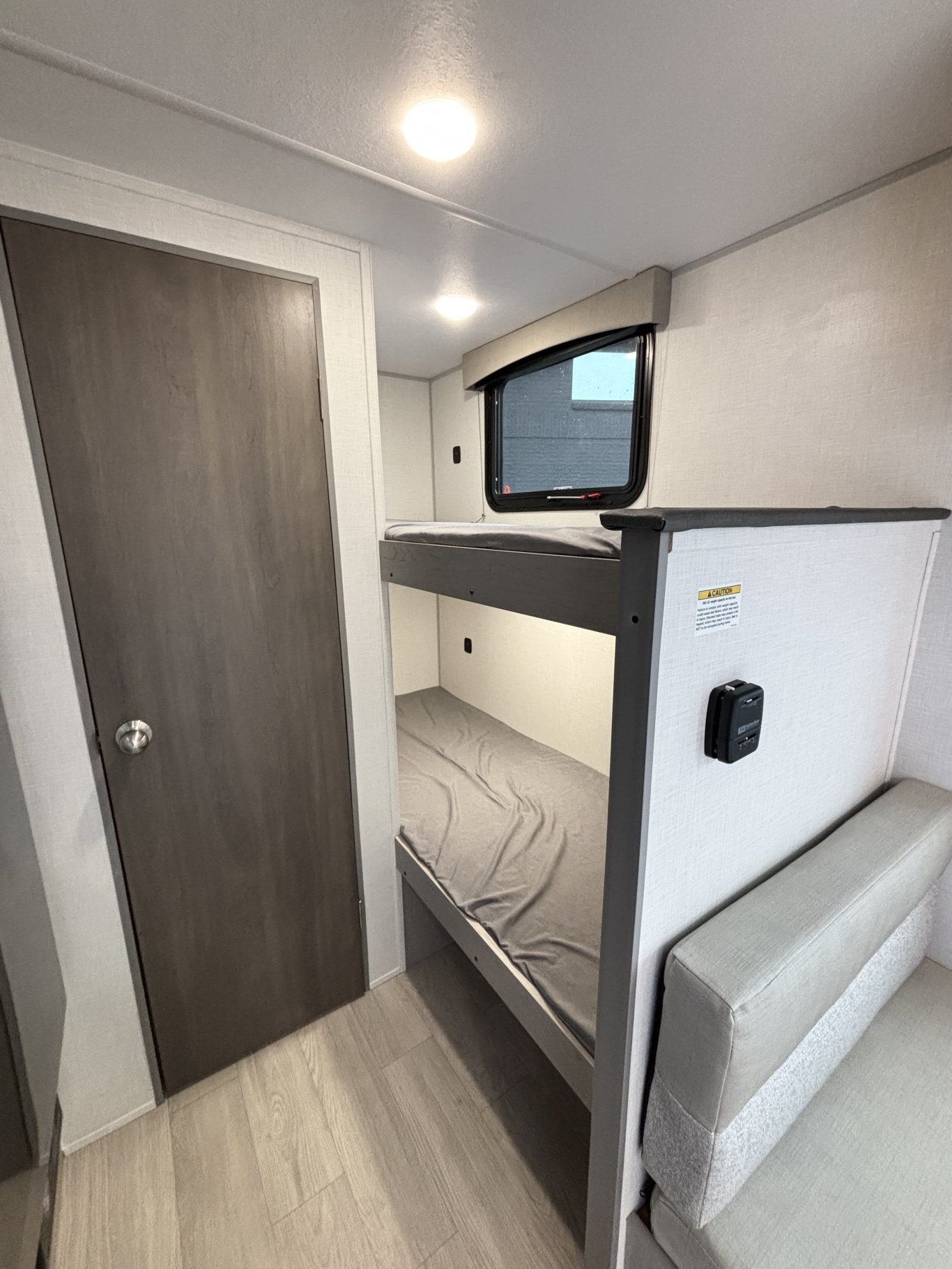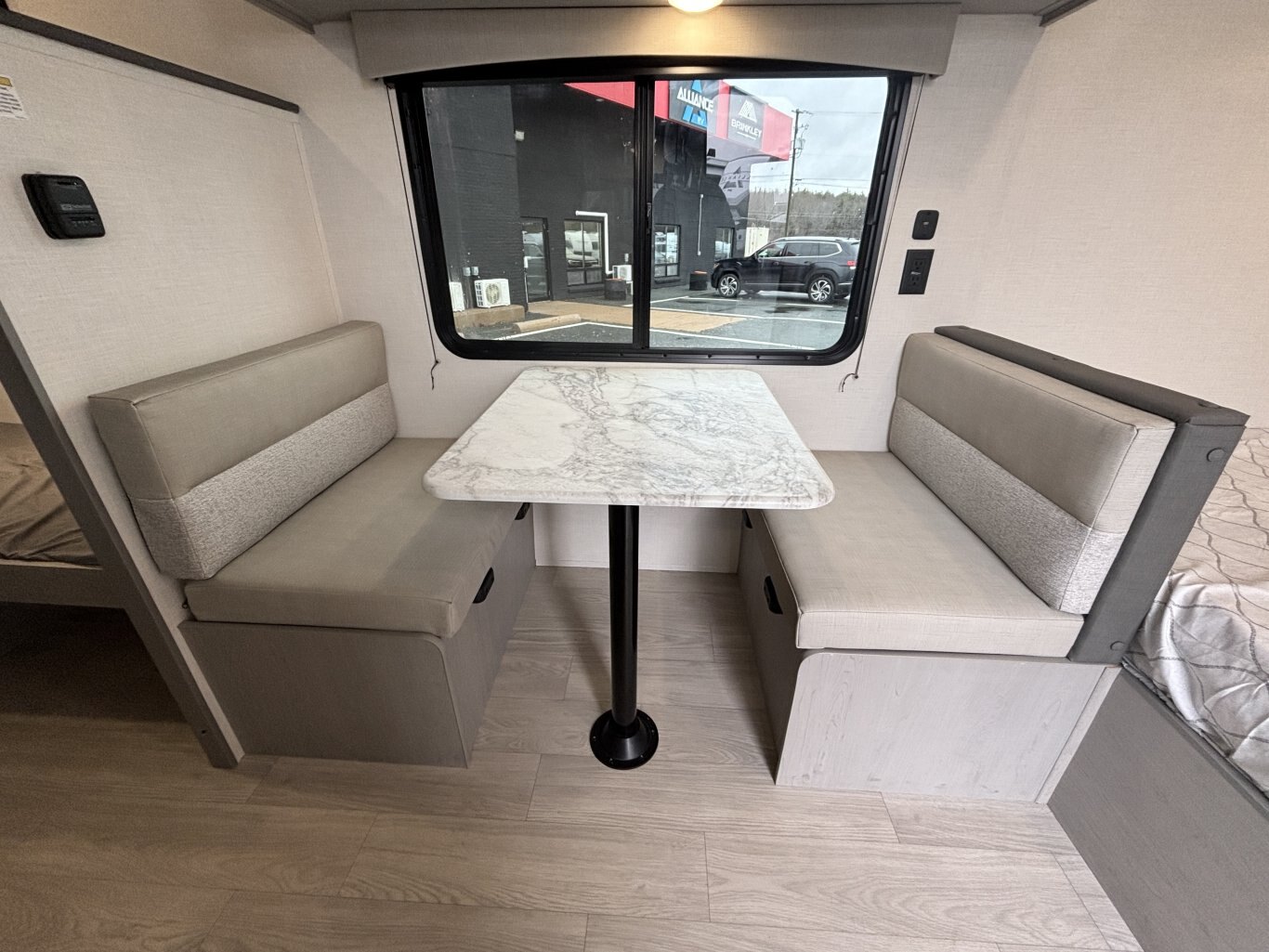 | The most-popular and top-selling single axle bunk model floorplan in the industry. Our commitment to all end-users is that we will always build this sub-3000 lb trailer with a dinette (and not a couch or bench seat – which prevents trailer pass through and a functional eating area for kids), a furnace, and a roof-mount A/C unit. This ensures true camping functionality that is critical for great family experiences. Note: other brands eliminate these keys features. #CampEasy |