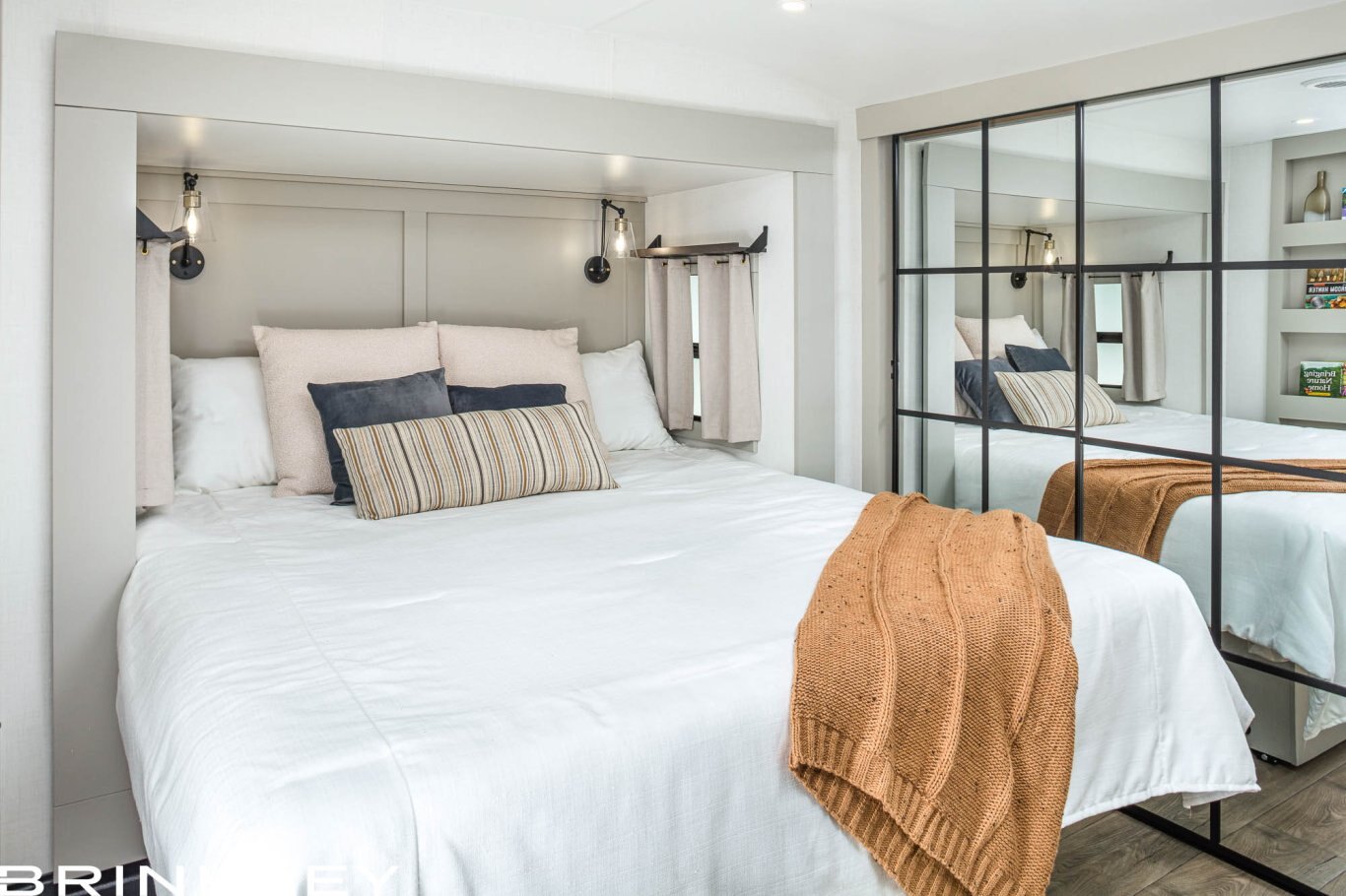 | 79.5″ Bedroom Ceiling Height 67″ Bedroom Slide-Out Height Dimmable Bedroom Lighting King Bed w/ Residential 9″ Memory Foam Mattress (70″x80″) Queen Bed w/ Residential 9″ Memory Foam Mattress (60″x80″) & Nightstands Matching Comforter & Pillow Package Dual Motion Activated LED Bed Lights Dual Bedside Overhead Shelves (CPAP Extensions Available Through Parts Dept.) Dual Bedside Outlets w/ USB & USB-C Finished Under-Bed Storage Compartment w/ Motion Activated Lighting Dual Reading Sconce Lights Walk-In Closet w/ Residential Mirrored Sliding Doors Bright LED Closet Lighting Residential Style Dresser Hidden Sliding Dresser Top Storage Compartment 32″ Smart TV Folding Wall Hooks |