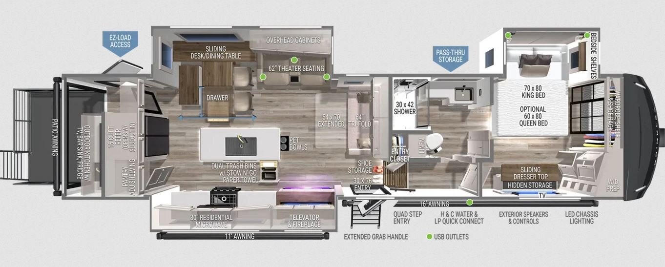 | Mid-Coach Pass-Through Storage Compartment w/ Motion Lighting & Power Outlets Storage Compartment (Heated & Insulated) |