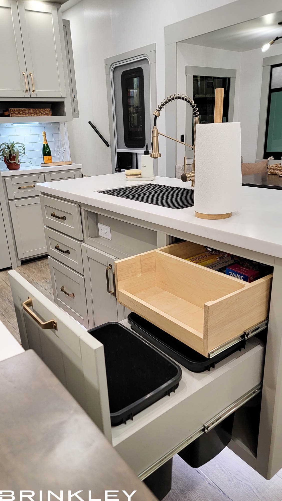 | Premium Residential Drawers w/ Dovetail Joints Dual Pull-Out Trash Bins Stow ‘n Go Paper Towel Caddy Farmhouse Black Stainless Steel Sink w/ Tuff Coat & Roller Cover Premium Residential Soft Close Cabinet Doors & Drawers Residential Solid Surface Countertops Maxxair Fan w/ Rain Sensor Magnetic Cabinet & Drawer Catches Large Pantry w/ Adjustable Shelves & Appliance Outlet One-Piece Steel Island Base (Super Stable) Island Base & Soffit w/ Indirect Mood Light 16 Cubic Feet Energy Efficient 12-Volt Refrigerator Residential 30″ Microwave |