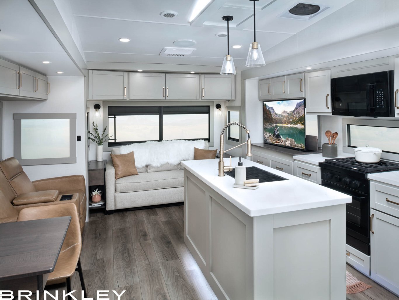 MODEL ZLUXURY MID-SIZED FIFTH WHEELSThe Brinkley Model Z – Mid-Sized Luxury Fifth Wheel is in a class of its own… Featuring an automotive exterior with a residential interior, yielding NO COMPROMISE. It’s destined to change the RV ownership experience. Whether you’re a weekend camper or a full-time RVer, Model Z offers features and amenities that will appeal to all camping enthusiasts. From 7k axles, 17.5” H-rated Cooper tires, flush floor slides, and a class-leading 79.5″ bed & bath interior height, to name a few. The Model Z has a combination of high-end features unheard of on a Mid-Size Fifth Wheel.