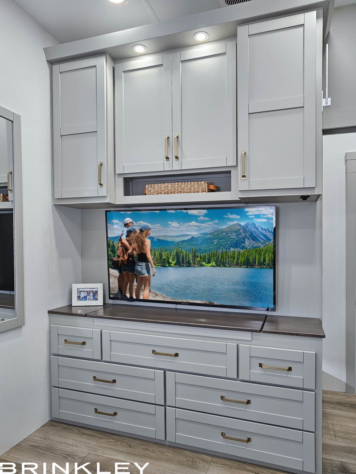 | 79.5″ Bedroom Ceiling Height 67″ Bedroom Slide-Out Height Dimmable Bedroom Lighting King Bed w/ Residential 9″ Memory Foam Mattress (70″x80″) Queen Bed w/ Residential 9″ Memory Foam Mattress (60″x80″) & Nightstands Matching Comforter & Pillow Package Dual Motion Activated LED Bed Lights Dual Bedside Overhead Shelves (CPAP Extensions Available Through Parts Dept.) Dual Bedside Outlets w/ USB & USB-C Finished Under-Bed Storage Compartment w/ Motion Activated Lighting Dual Reading Sconce Lights 3″ Deep Bedside Display Shelves Walk-In Closet w/ Residential Mirrored Sliding Doors Bright LED Closet Lighting Residential Style Dresser Hidden Sliding Dresser Top Storage Compartment 32″ Smart TV Folding Wall Hooks |