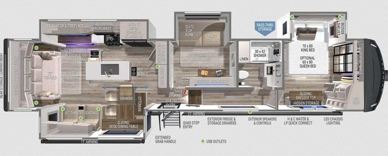 | 370 Watt Solar Panel (740 Watt Ready) 60 Amp MPPT Solar Controller (Inverter Prep & Lithium Ready) Pre-Wired For Up To 5.5k Generator (Front Storage Compartment) 18k BTU Rear Furrion Chill Cube Air Conditioner (Main) 13.5k BTU Front Air Conditioner w/ Heat Pump (Bed & Bath) 13.5k BTU Mid Air Conditioner w/ Heat Pump (Bonus Room) Brinkley Smart-Command™ Center w/ App Control Thermaflex® No Kink No Tear Heat Ducts Dual Recessed EZ Access Group 27 Battery Box Pre-Engineered & Assembled Wiring Harnesses, Loomed, Labeled, & Color Coded for Easy Serviceability (Segment-First) Wire Conduit for Aftermarket Upgrades (Roof> Interior> Basement) 35k BTU High-Capacity Furnace Detachable Power Cord w/ LED Indicator Light & Angled Connector |
