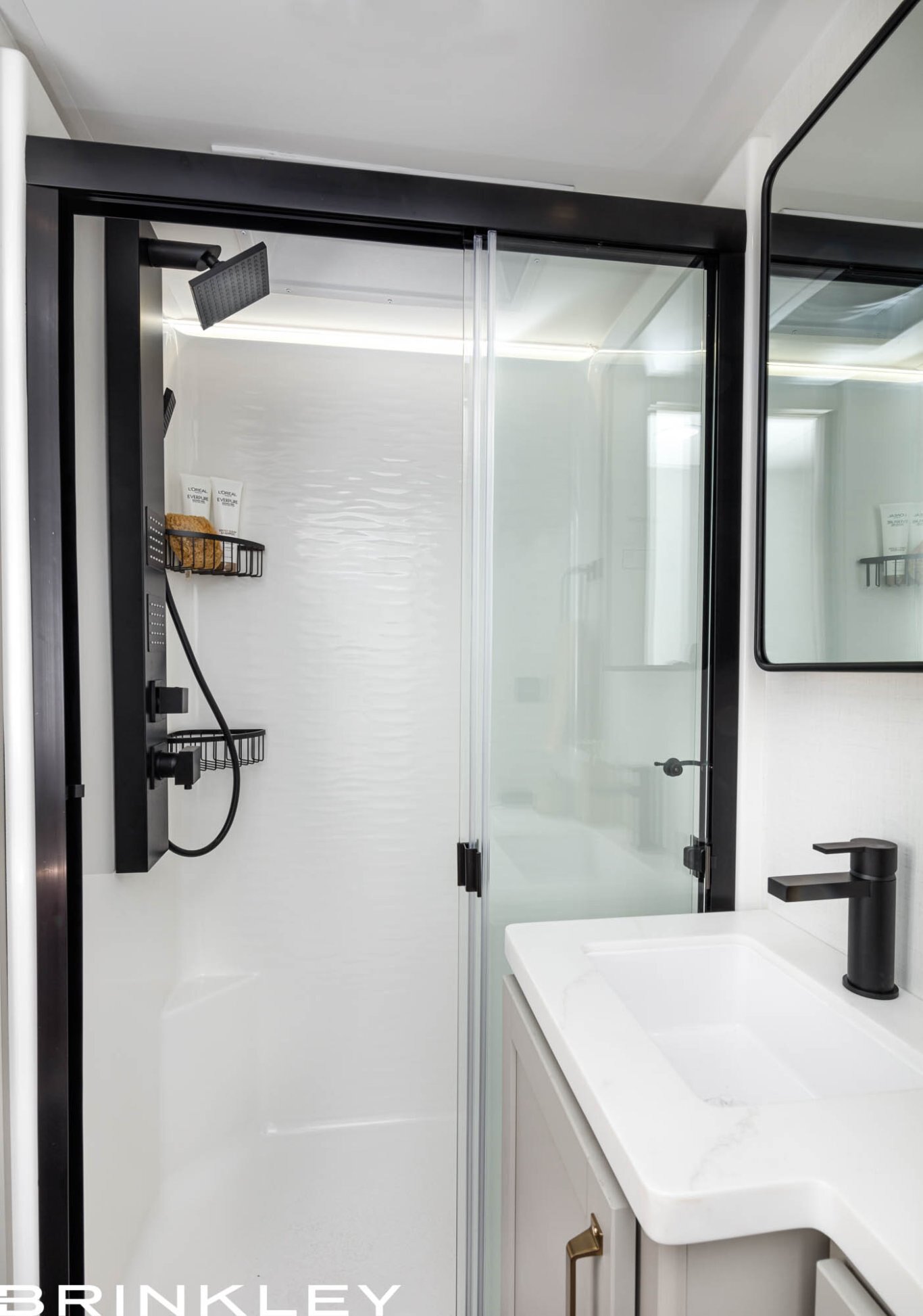 | Marine Grade Dotless COB Neon LED Shower Lighting Space Saver Bathroom Passage Door(s) Backlit Recessed Bathroom Medicine Cabinet Residential Solid Surface Countertop Black Stainless Steel Sink w/ Tuff Coat Glass Sliding Shower Door One-Piece 42"x30" Molded Fiberglass Shower (Low-Step/Max Height) Shower Seat Install Prep Residential Shower System w/ Head, Body, & Handheld Sprayers Overhead Shower Cove 3 Matching Bath Hooks Toilet Paper Holder w/ Magnetic Travel Keeper Oversized Linen Closet 79.5″ Bathroom Ceiling Height Porcelain Toilet Maxxair Fan w/ Rain Sensor |