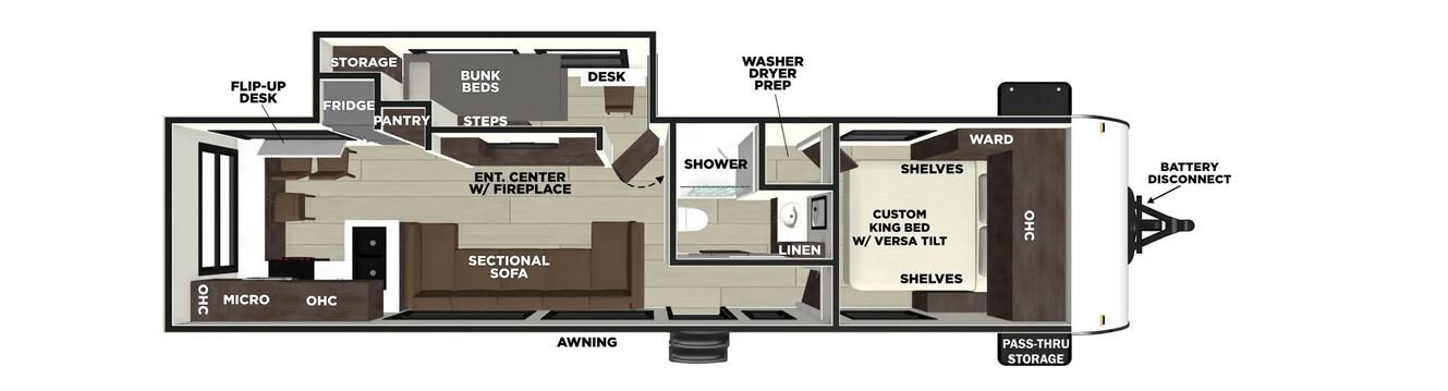 The Salem 290ZEN floorplan offers standard hung fiberglass exterior and solid surface countertops. Features the Versa-Slide offering additional storage, bunks and capability to utilize as an office. This model bypasses a traditional dinette but offers 18 linear feet of countertop space and the 105 square feet of windows offers a view that is unrivaled in this segment.