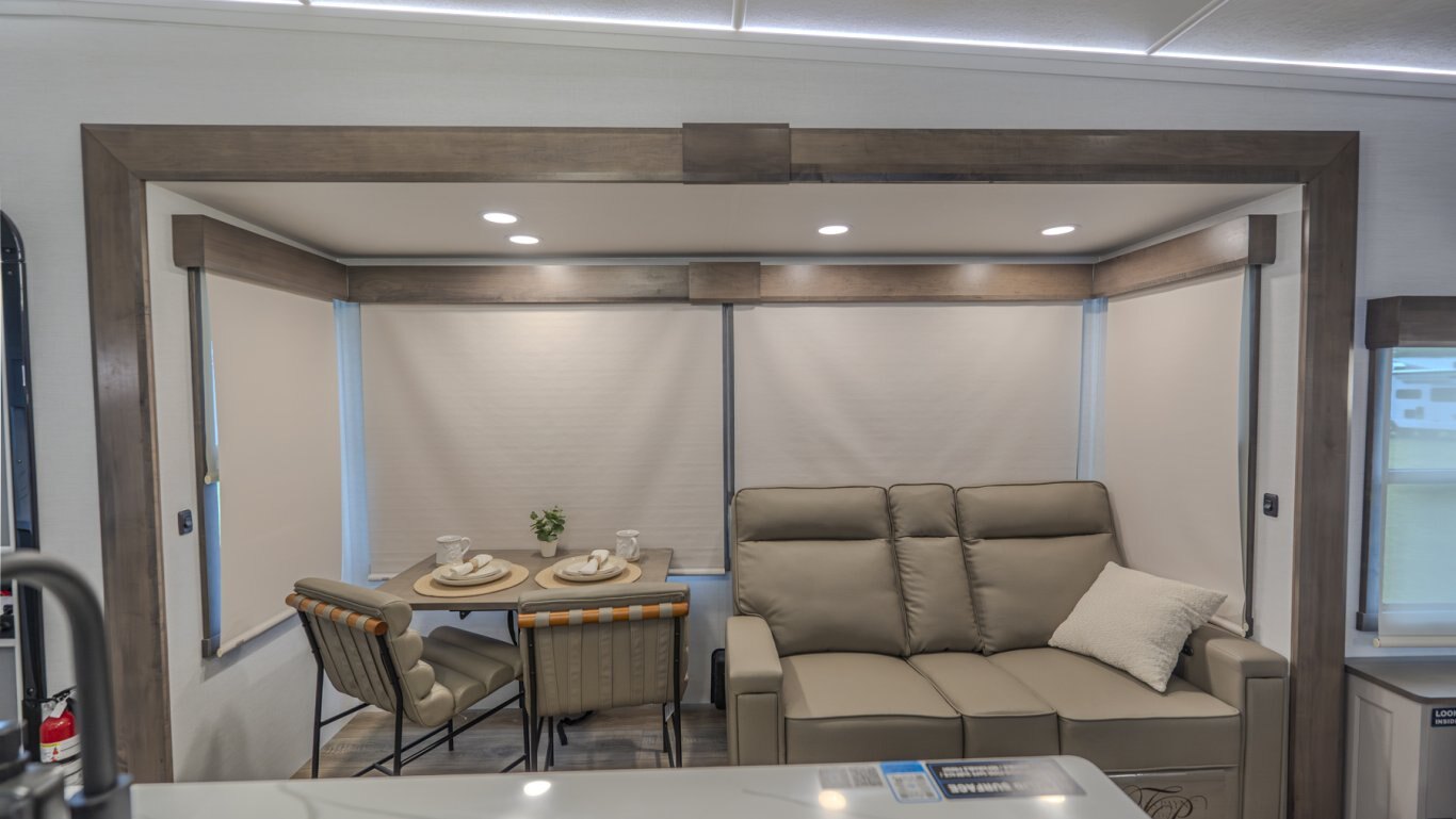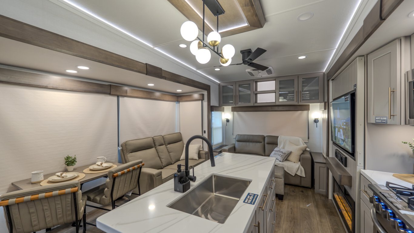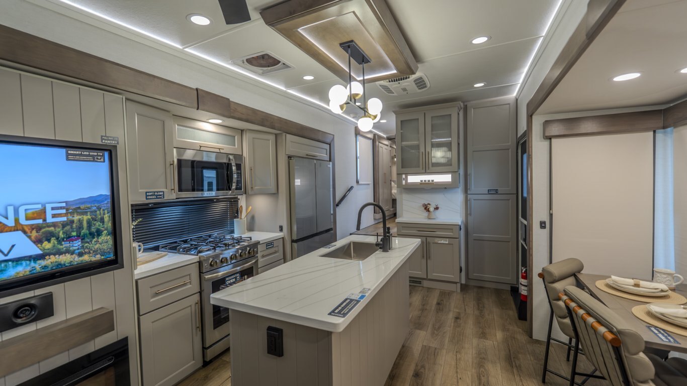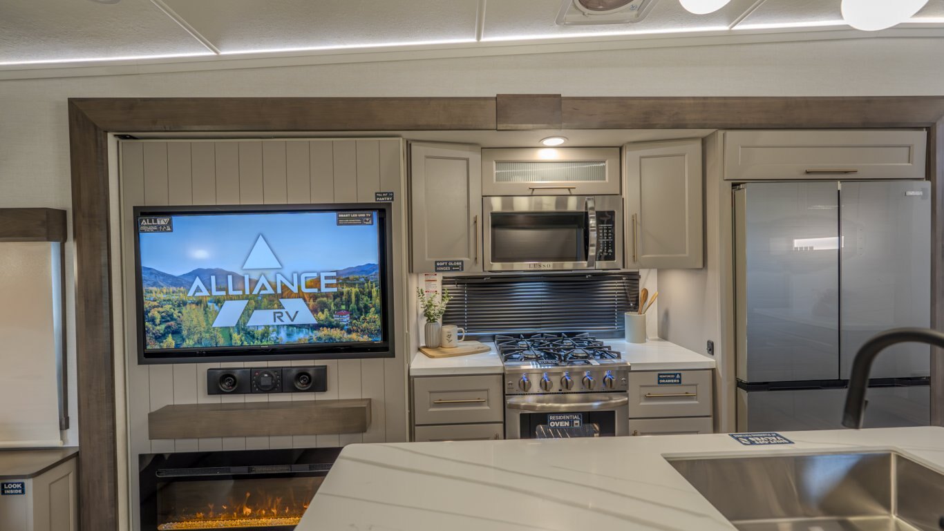 -Rear lounge setup containing 50-inch smart TV in front of dual recliner love seating, containing a sleeper sofa to the immediate left. The Alliance 2026 Paradigm 340RL features a luxurious rear lounge with dual recliners facing a 50-inch smart TV and a sleeper sofa to the left. The central kitchen offers a hidden pantry, residential microwave and stove, dishwasher prep, and a versatile swivel dining table. To the right of the quad entry is a convenient storage closet, while a hallway on the left leads to a spacious bathroom with a full sink and a 61" x 30" shower. The front bedroom includes a king bed (queen optional), bedside charging ports, TV hookup, and washer/dryer prep. Designed for comfort and style, this fifth wheel blends residential amenities with premium elegance. |