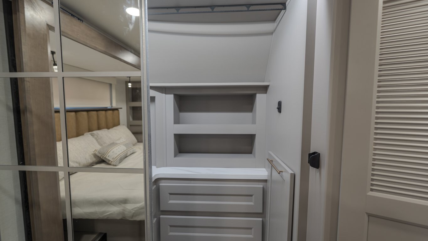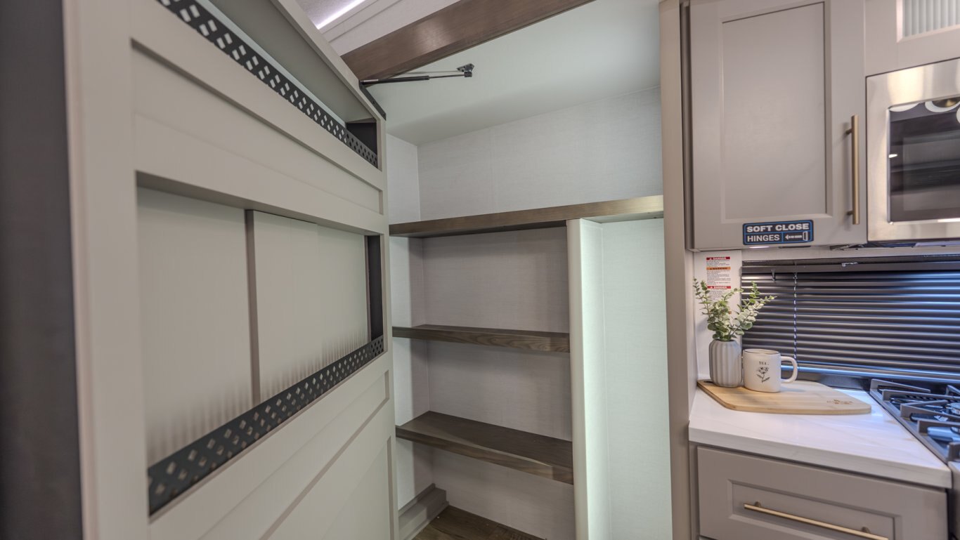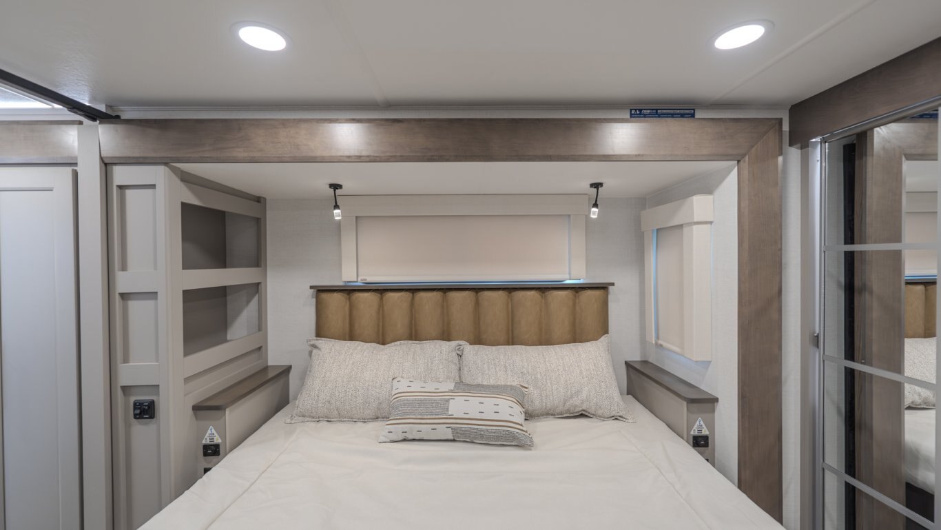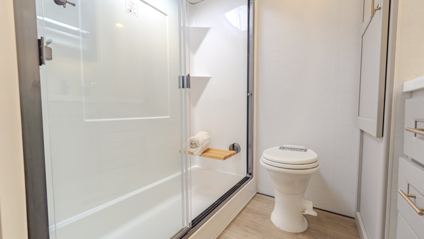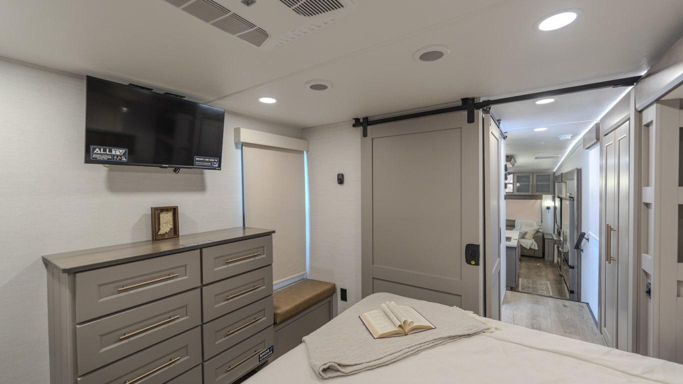 -Rear lounge setup containing 50-inch smart TV in front of dual recliner love seating, containing a sleeper sofa to the immediate left. The Alliance 2026 Paradigm 340RL features a luxurious rear lounge with dual recliners facing a 50-inch smart TV and a sleeper sofa to the left. The central kitchen offers a hidden pantry, residential microwave and stove, dishwasher prep, and a versatile swivel dining table. To the right of the quad entry is a convenient storage closet, while a hallway on the left leads to a spacious bathroom with a full sink and a 61" x 30" shower. The front bedroom includes a king bed (queen optional), bedside charging ports, TV hookup, and washer/dryer prep. Designed for comfort and style, this fifth wheel blends residential amenities with premium elegance. |