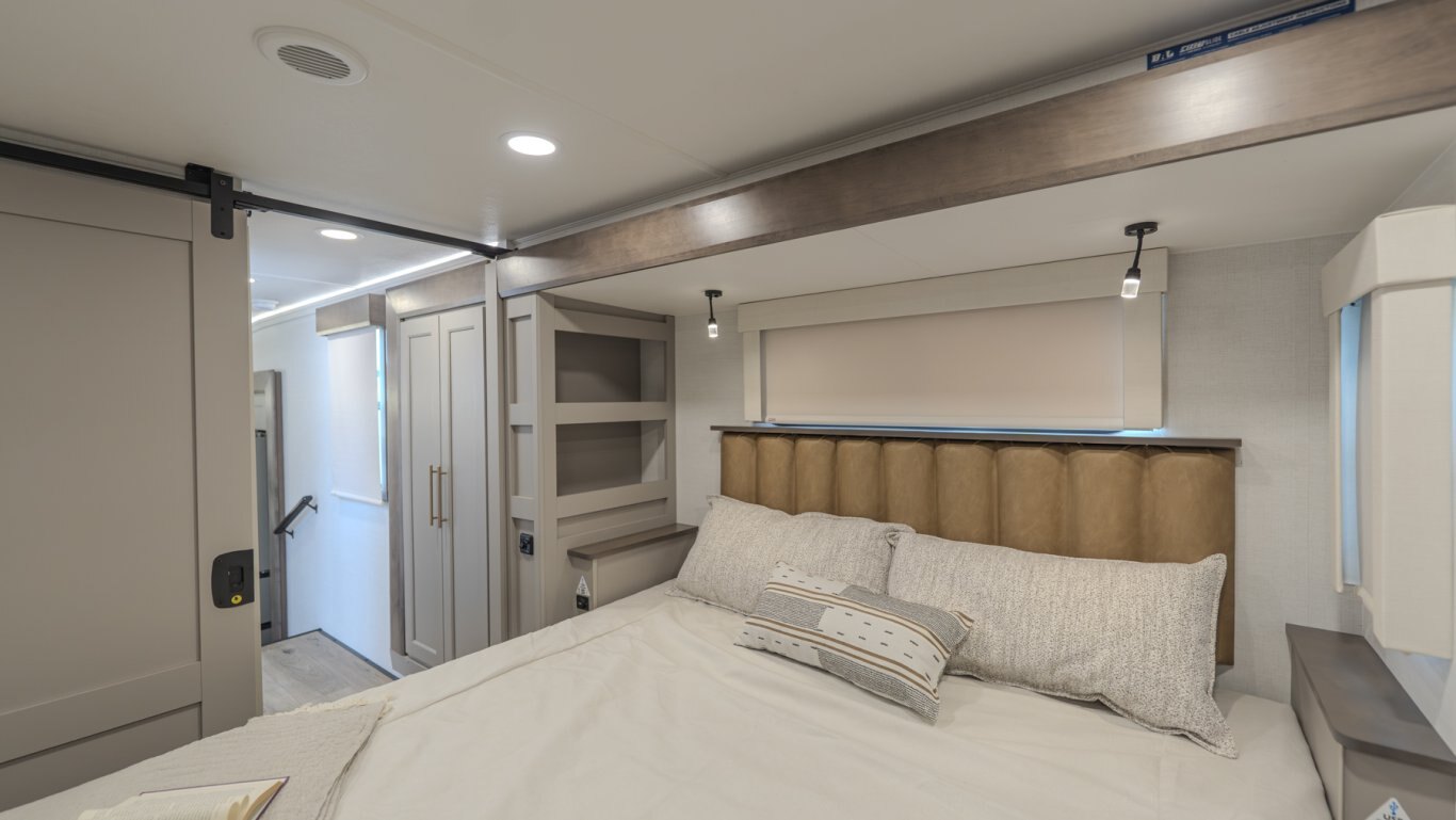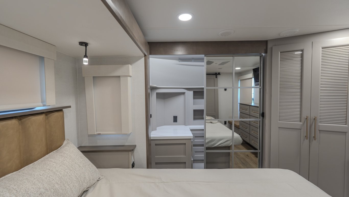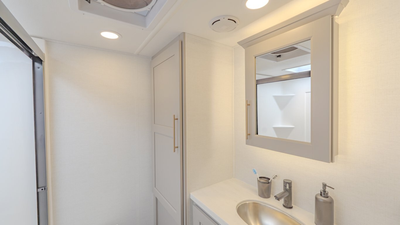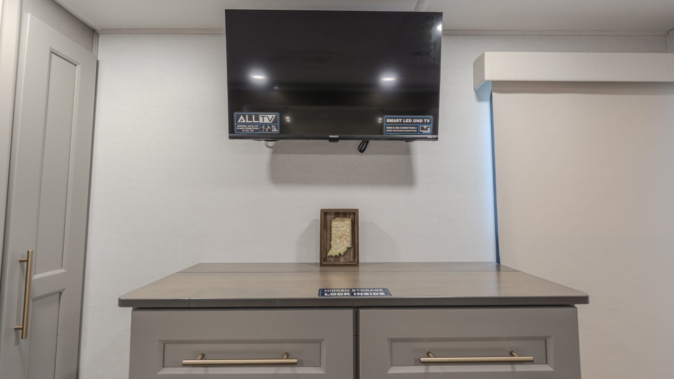 -Rear lounge setup containing 50-inch smart TV in front of dual recliner love seating, containing a sleeper sofa to the immediate left. The Alliance 2026 Paradigm 340RL features a luxurious rear lounge with dual recliners facing a 50-inch smart TV and a sleeper sofa to the left. The central kitchen offers a hidden pantry, residential microwave and stove, dishwasher prep, and a versatile swivel dining table. To the right of the quad entry is a convenient storage closet, while a hallway on the left leads to a spacious bathroom with a full sink and a 61" x 30" shower. The front bedroom includes a king bed (queen optional), bedside charging ports, TV hookup, and washer/dryer prep. Designed for comfort and style, this fifth wheel blends residential amenities with premium elegance. |