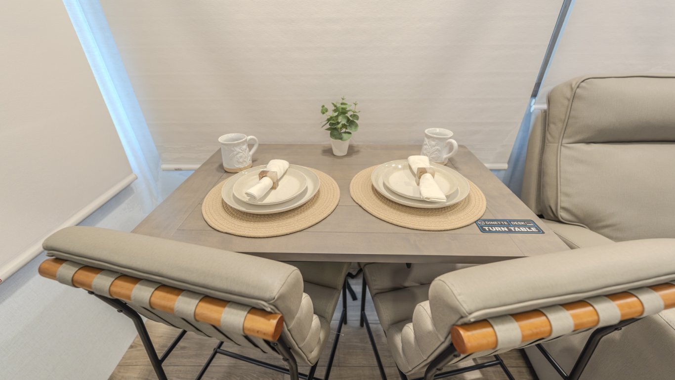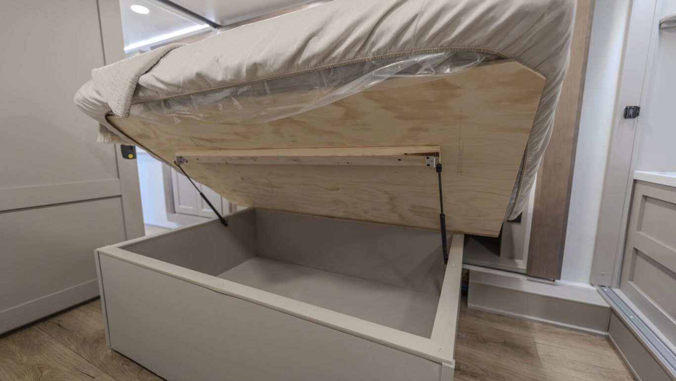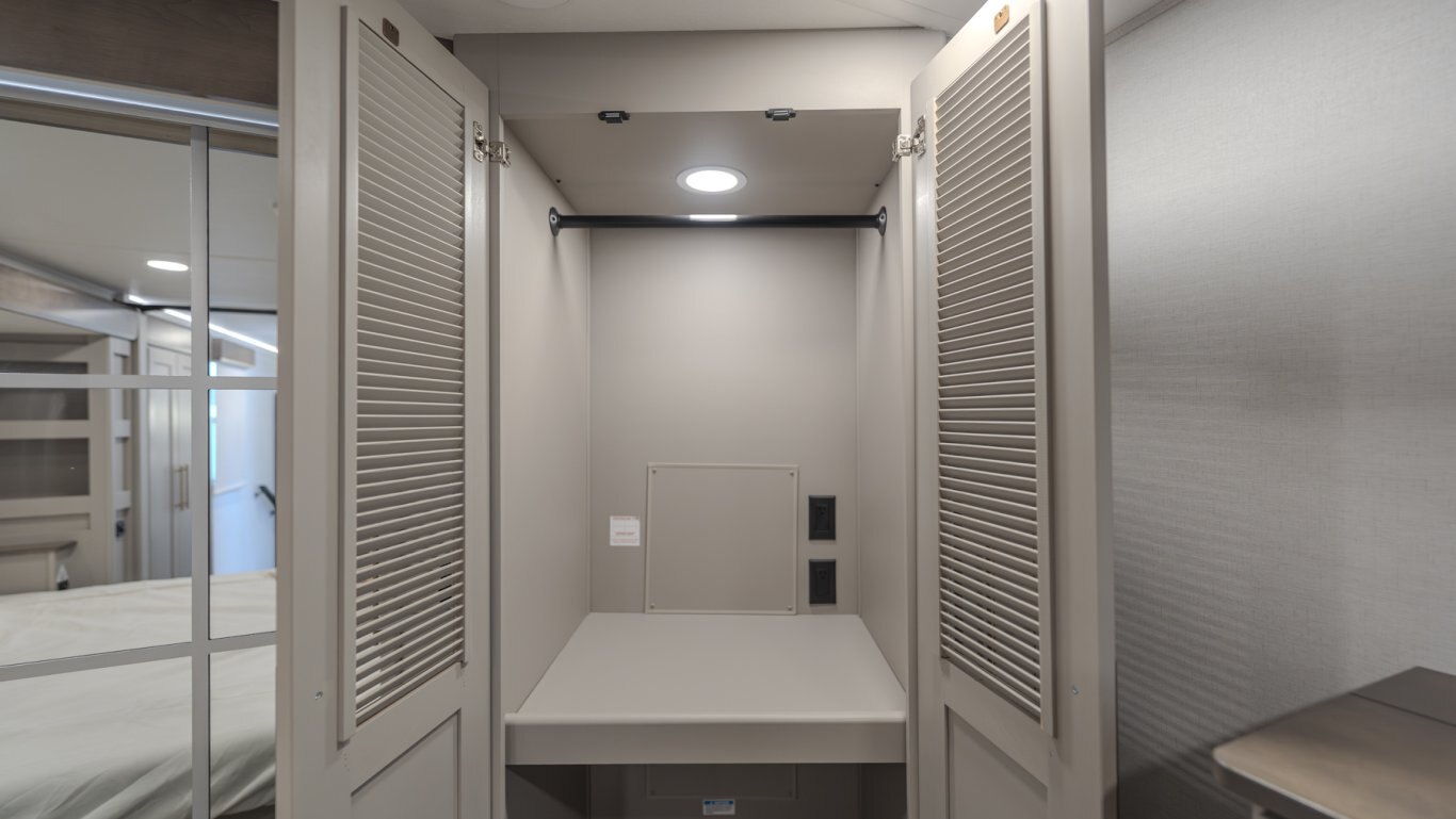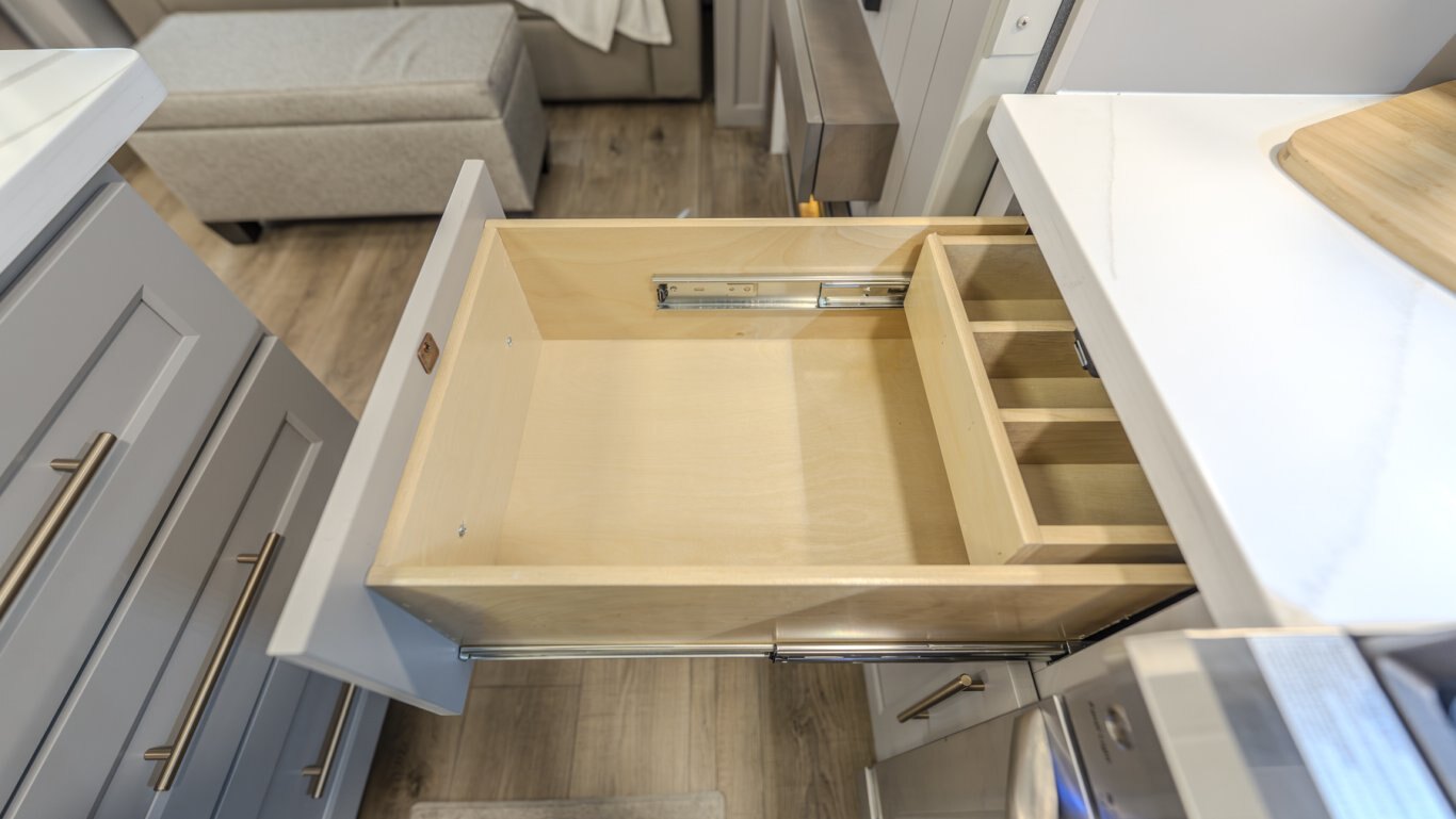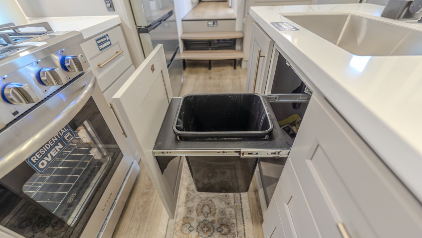 -Rear lounge setup containing 50-inch smart TV in front of dual recliner love seating, containing a sleeper sofa to the immediate left. The Alliance 2026 Paradigm 340RL features a luxurious rear lounge with dual recliners facing a 50-inch smart TV and a sleeper sofa to the left. The central kitchen offers a hidden pantry, residential microwave and stove, dishwasher prep, and a versatile swivel dining table. To the right of the quad entry is a convenient storage closet, while a hallway on the left leads to a spacious bathroom with a full sink and a 61" x 30" shower. The front bedroom includes a king bed (queen optional), bedside charging ports, TV hookup, and washer/dryer prep. Designed for comfort and style, this fifth wheel blends residential amenities with premium elegance. |
