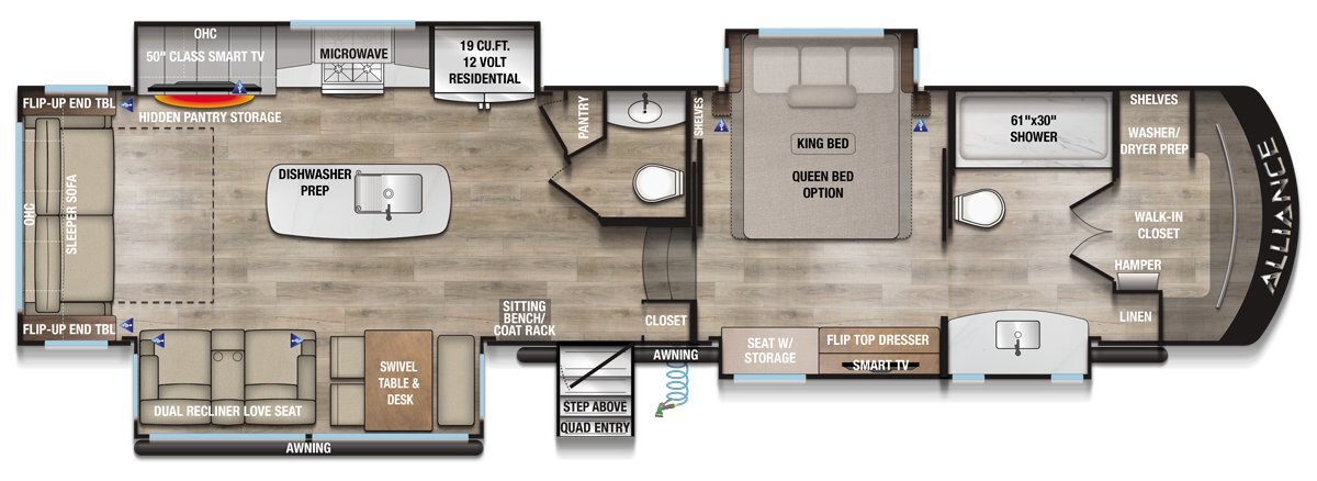 The Alliance RV Paradigm 370FB is a premium fifth wheel designed for those who seek the perfect blend of luxury, functionality, and durability in their RV experience. With its spacious layout, high-end finishes, and thoughtful amenities, the 370FB is ideal for both full-time RV living and extended vacations. The highlight of the Paradigm 370FB is its massive front bathroom. Featuring a 61" x 30" residential shower, linen storage, and a walk-in closet with a hamper and shelves, this bathroom offers unparalleled comfort and convenience. Additionally, the space is prepped for an optional washer/dryer, enhancing long-term living capabilities. The rear living area is designed for relaxation and entertainment. It includes a dual recliner love seat, a sleeper sofa, and a swivel table with a desk, providing versatile seating options. The 50" Smart TV and fireplace create a cozy atmosphere for unwinding after a day of adventure. Hidden pantry storage ensures that essentials are organized and easily accessible. The kitchen is a chef's dream, equipped with a 19 cu. ft. 12V residential refrigerator, a four-burner cooktop, and LG solid surface countertops. The kitchen island provides additional prep space and includes a large sink and dishwasher prep, enhancing convenience during extended stays. A Maxx fan with a rain sensor keeps the space fresh while cooking. Retreat to the front bedroom, where you'll find a king bed slide-out, providing extra floor space. The room also features a flip-top dresser, a seat with storage, and a large front wardrobe prepped for a washer and dryer. This setup ensures a restful retreat after a day of adventure. |