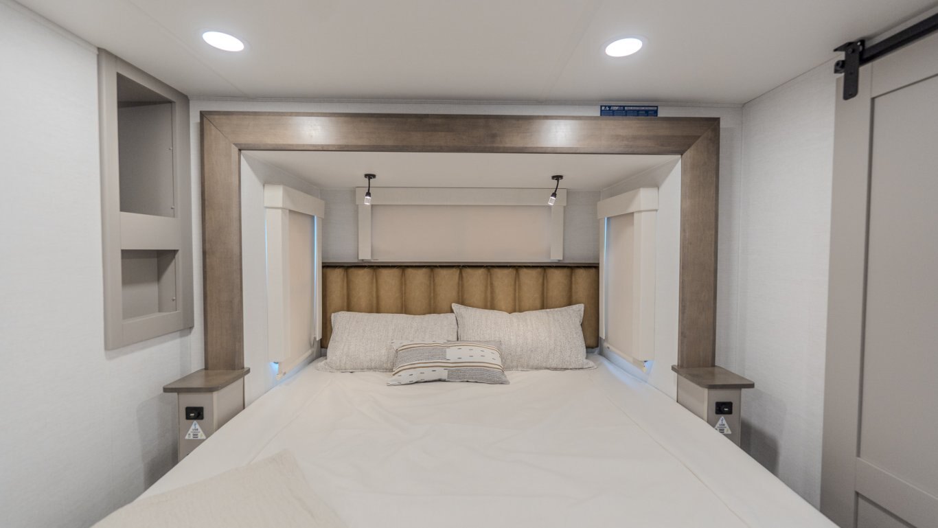 Just inside the quad entry, a storage closet and stairs lead to a refined bedroom with a king bed (queen optional), charging ports, a flip-top dresser, and TV. At the front, the luxurious master bathroom includes a 61"x30"