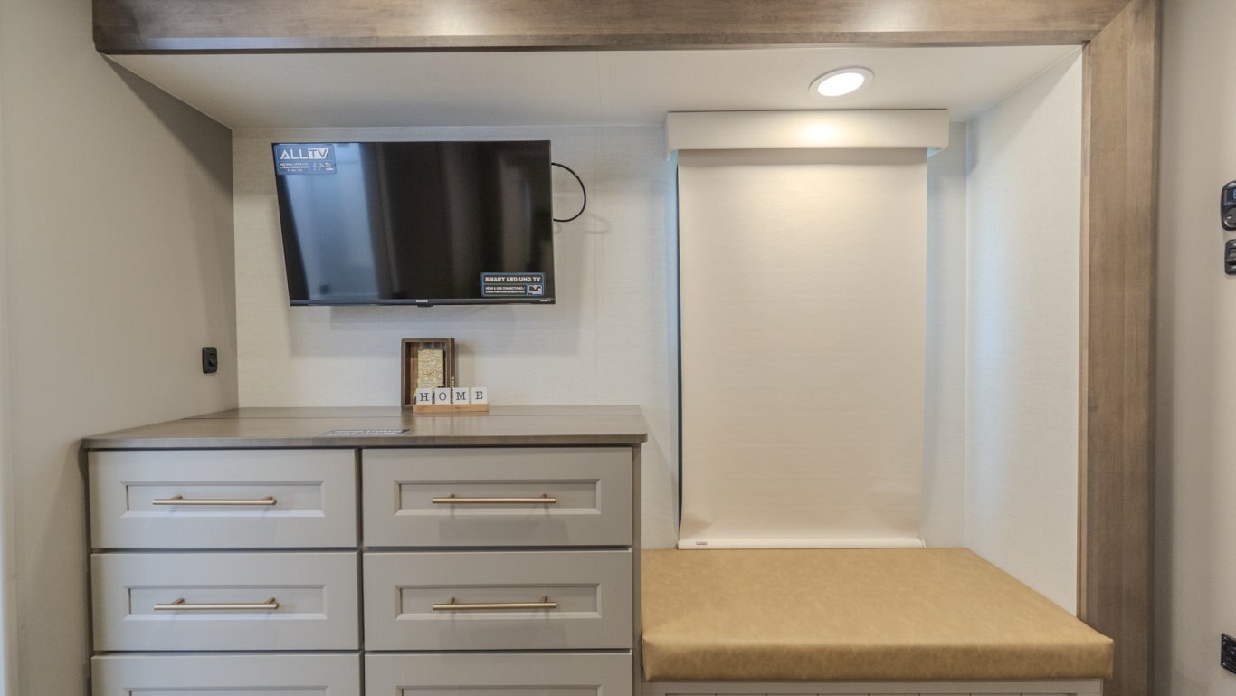 -Within the bedroom can be found charing ports, a TV for entertainment and a fliptop dresser for more space.