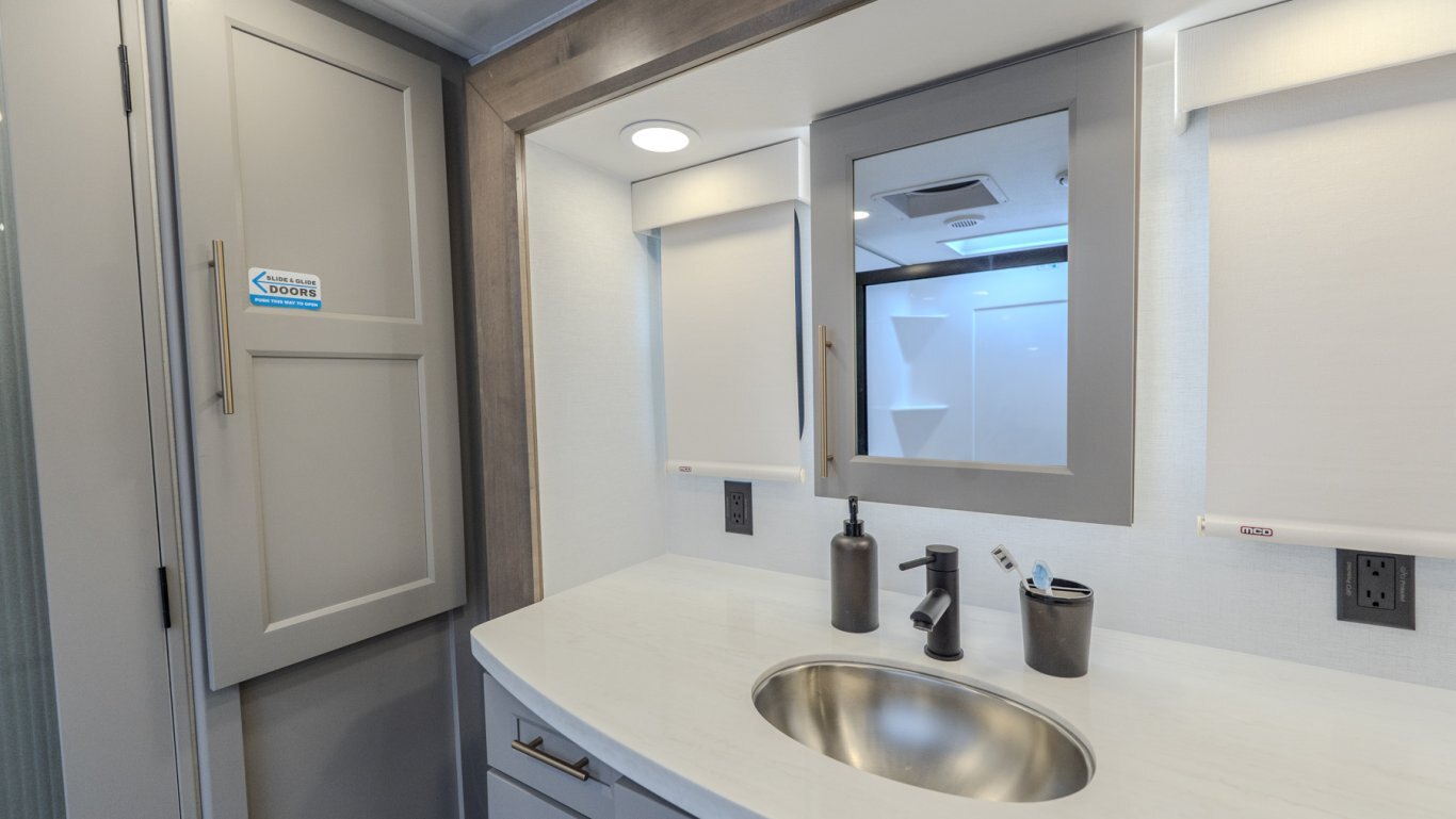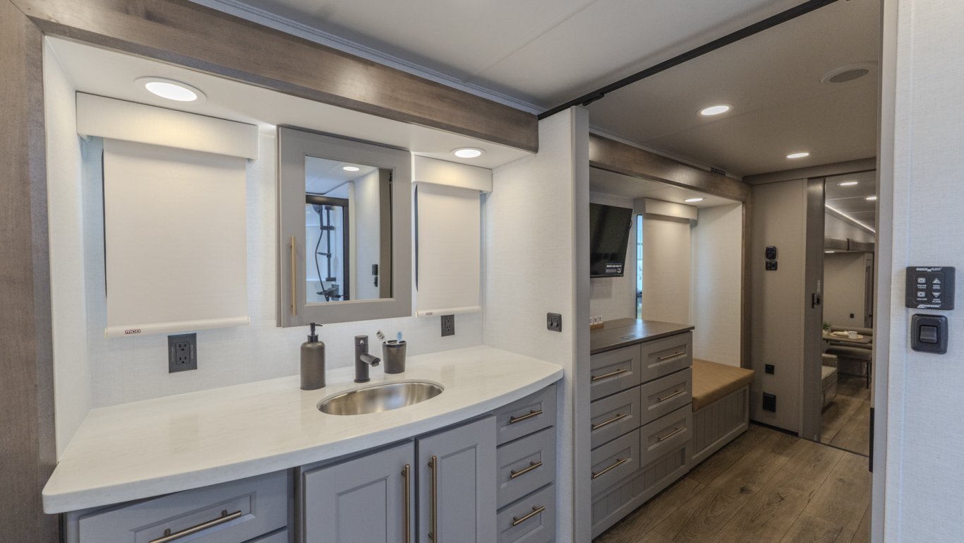 shower, full-size sink, and a walk-in closet with washer and dryer prep—delivering residential comfort on the road.