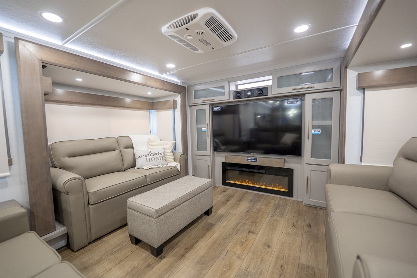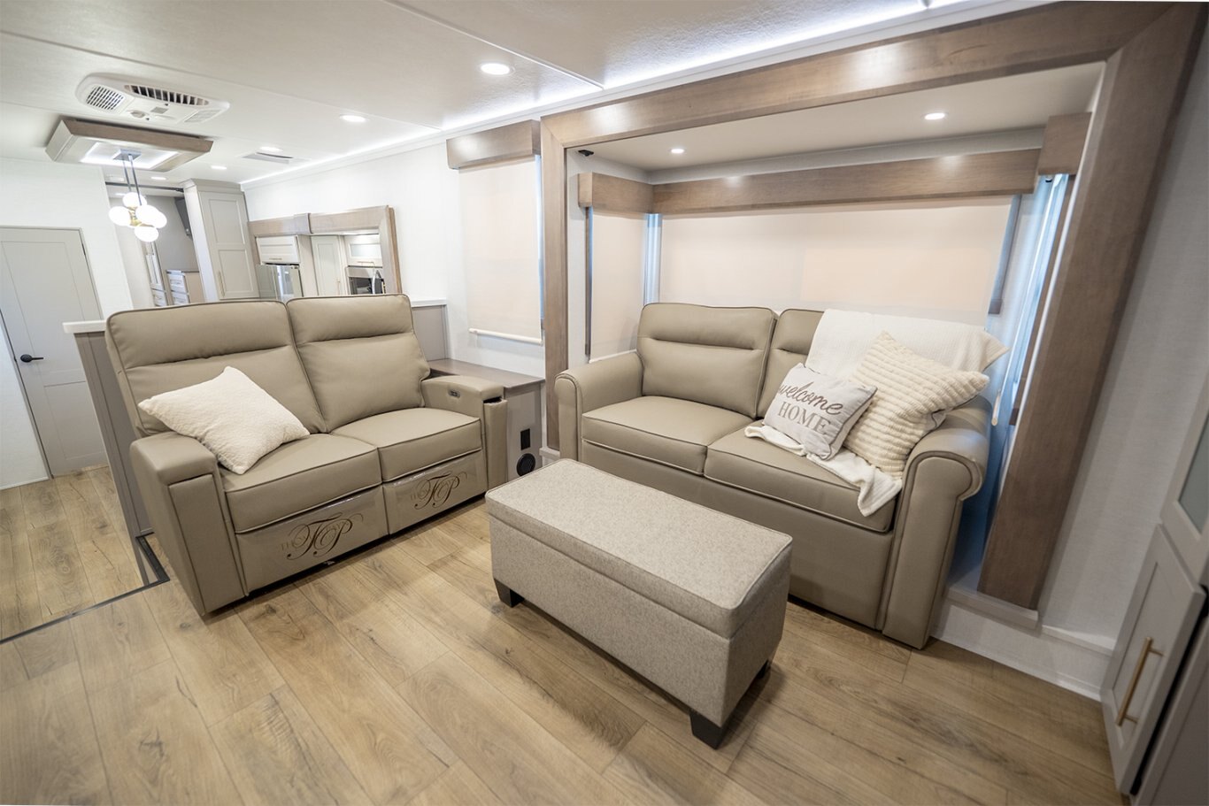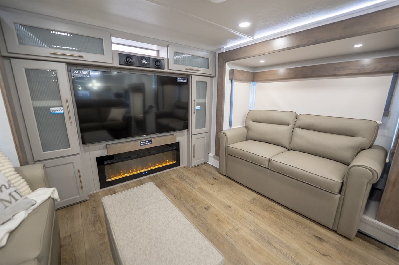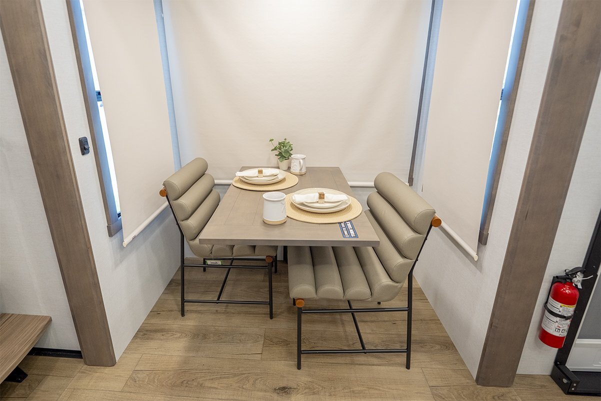 The Alliance RV Paradigm 385FL fifth wheel redefines luxury RV living by seamlessly blending innovative design with high-end amenities. Crafted for full-time RVers and those seeking extended adventures, the 385FL offers unparalleled comfort, functionality, and craftsmanship. At the heart of the Paradigm 385FL is its impressive front living room—an inviting, elevated space ideal for entertaining or relaxing. Dual opposing sleeper sofas and a power-reclining theater loveseat provide ample, plush seating options, all oriented toward a 55" smart HDTV positioned above a cozy electric fireplace with hidden storage. Expansive atrium-style windows flood the space with natural light, offering breathtaking views and an airy, open ambiance. The mid-coach gourmet kitchen is equally impressive, featuring a 19 cu. ft. 12V residential refrigerator, LG solid surface countertops, and a large center island with an undermount sink and high-rise faucet. Cooking is elevated by the inclusion of a four-burner Insignia range and oven, a residential-sized microwave, and a spacious pantry with LED motion lighting. With dishwasher prep and premium finishes throughout, this kitchen rivals any luxury residential setup. Toward the rear, the private master suite offers a king bed on a slide-out for increased floor space, paired with a flip-top dresser, overhead cabinetry, and a wall-mounted smart TV. It connects seamlessly to a spacious rear bathroom outfitted with a 48" x 30" residential-style shower, solid-surface lavatory, porcelain toilet with soft-close seat, and abundant storage—including washer/dryer prep for extended stays. A second half bath near the entry ensures added convenience for guests. |