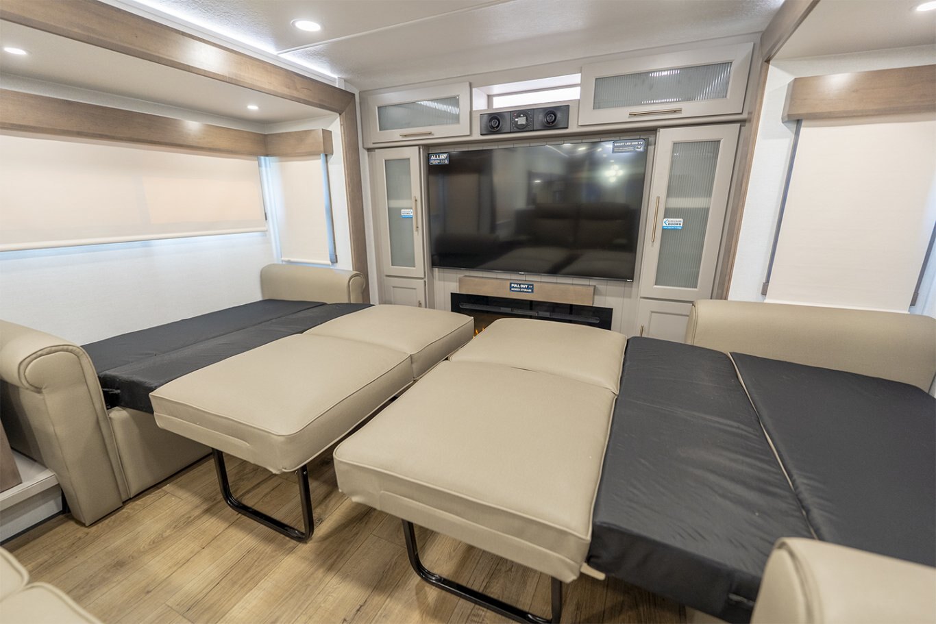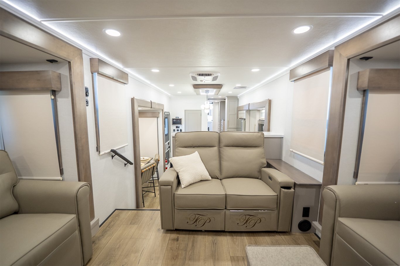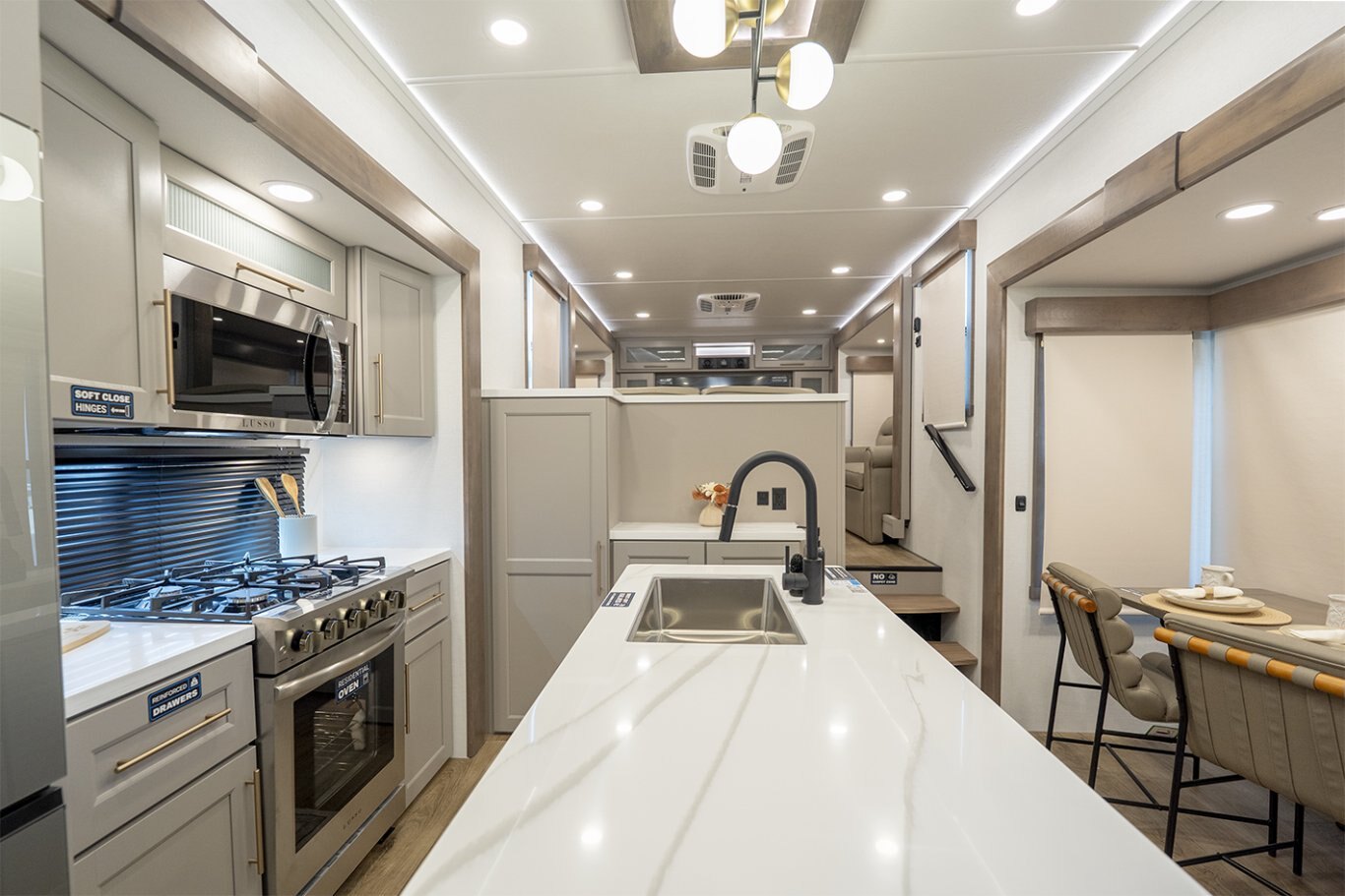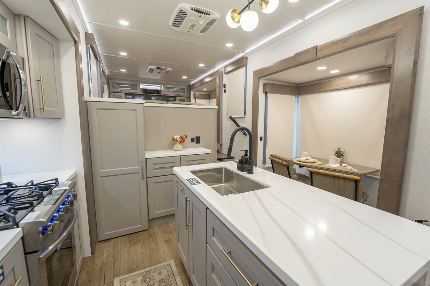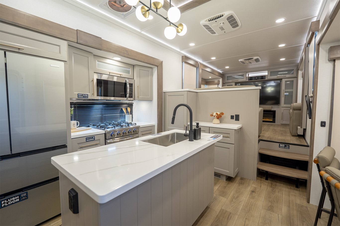 The Alliance RV Paradigm 385FL fifth wheel redefines luxury RV living by seamlessly blending innovative design with high-end amenities. Crafted for full-time RVers and those seeking extended adventures, the 385FL offers unparalleled comfort, functionality, and craftsmanship. At the heart of the Paradigm 385FL is its impressive front living room—an inviting, elevated space ideal for entertaining or relaxing. Dual opposing sleeper sofas and a power-reclining theater loveseat provide ample, plush seating options, all oriented toward a 55" smart HDTV positioned above a cozy electric fireplace with hidden storage. Expansive atrium-style windows flood the space with natural light, offering breathtaking views and an airy, open ambiance. The mid-coach gourmet kitchen is equally impressive, featuring a 19 cu. ft. 12V residential refrigerator, LG solid surface countertops, and a large center island with an undermount sink and high-rise faucet. Cooking is elevated by the inclusion of a four-burner Insignia range and oven, a residential-sized microwave, and a spacious pantry with LED motion lighting. With dishwasher prep and premium finishes throughout, this kitchen rivals any luxury residential setup. Toward the rear, the private master suite offers a king bed on a slide-out for increased floor space, paired with a flip-top dresser, overhead cabinetry, and a wall-mounted smart TV. It connects seamlessly to a spacious rear bathroom outfitted with a 48" x 30" residential-style shower, solid-surface lavatory, porcelain toilet with soft-close seat, and abundant storage—including washer/dryer prep for extended stays. A second half bath near the entry ensures added convenience for guests. |