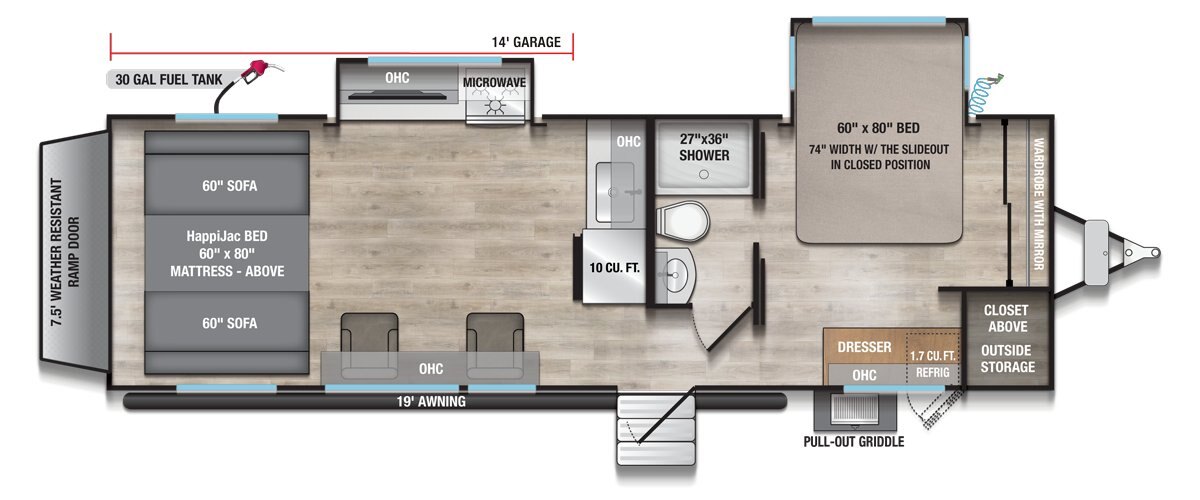 Garage Management System Weather resistant ramp door Multipoint tie down system 12 volt HappiJac rollover sofas Fully insulated garage floor