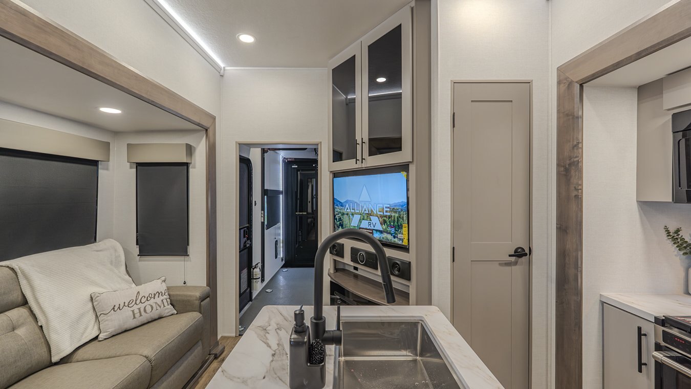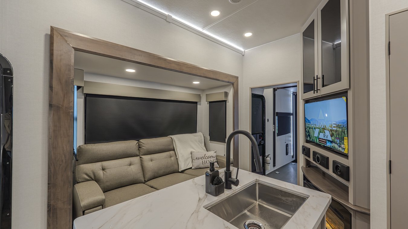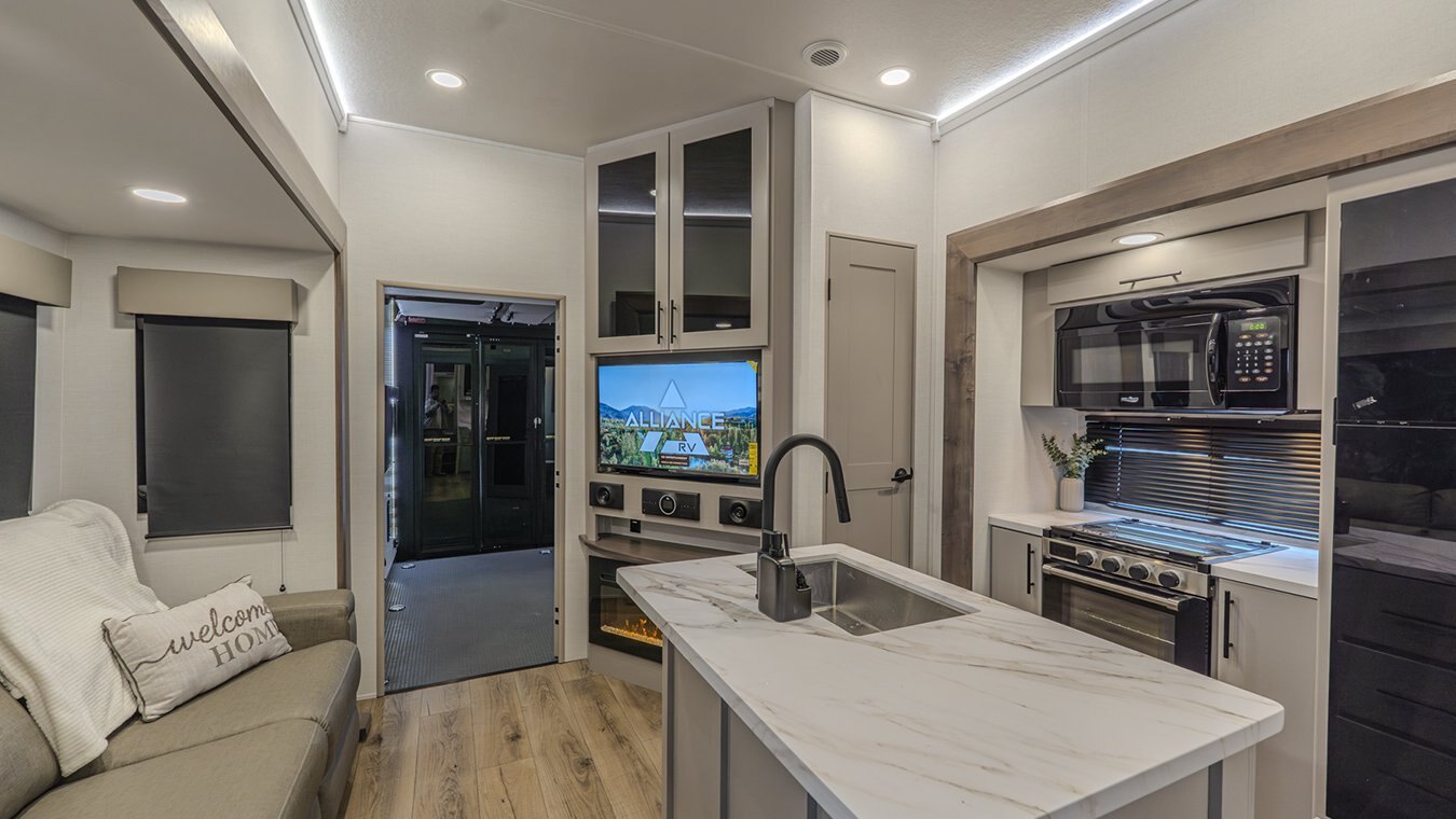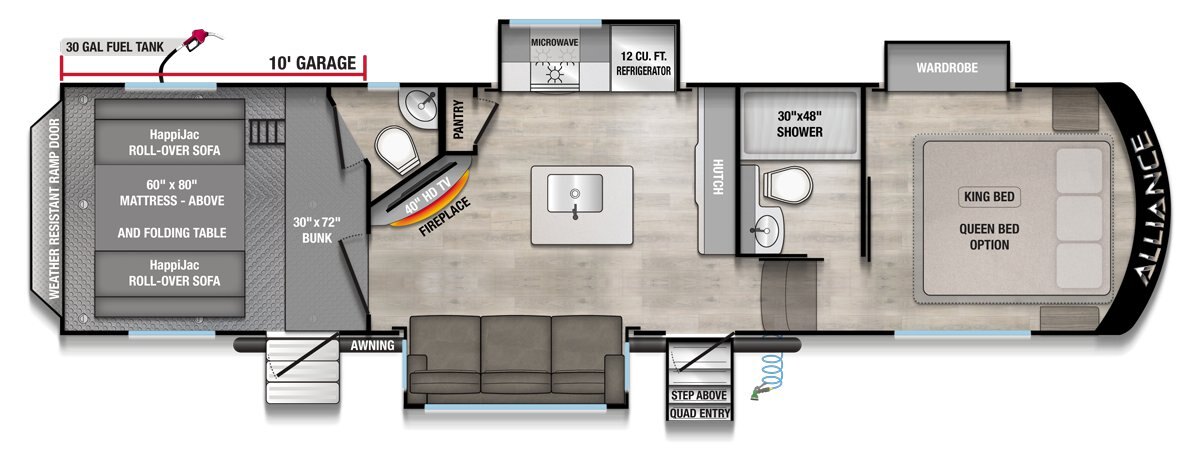 The Alliance RV Valor 32A10 is a premier fifth-wheel toy hauler that masterfully combines rugged utility with refined comfort, designed for those who seek adventure without compromising on quality. With a length of 35'11" and a dry weight of 12,100 lbs, it offers a spacious and durable platform for both outdoor enthusiasts and full-time travelers. Built on a 101" wide-body Benchmark chassis, the Valor 32A10 features a flush-floor upper deck, ensuring a stable and smooth ride. Its Performance Running Gear Package includes 7,000 lb. Dexter® axles, MorRyde® CRE3000 suspension system, and G-Range 4,400 lb. rated tires with 16" aluminum wheels, providing enhanced durability and towing stability. The 6-point hydraulic auto-leveling system simplifies setup, while the Rota-Flex pin box reduces towing stress. The seamless PVC roof covering and Azdel-backed fiberglass sidewalls offer long-lasting protection against the elements. The 10-foot garage is fully insulated and equipped with a weather-resistant ramp door, multipoint tie-down system, and 12V HappiJac rollover sofas with a table, transforming the space into a versatile living area. An air compressor and washer/dryer prep add to the convenience. The main living area boasts a sofa with power recliners, a 50" HD TV, and a 5,000 BTU fireplace, creating a cozy environment for relaxation. Commercial-grade vinyl flooring throughout ensures easy maintenance. The kitchen is equipped with a 4-burner gas stove with an oversized oven, residential microwave, and an 11 cu. ft. 12V refrigerator, providing all the essentials for meal preparation. Solid surface countertops and soft-close cabinet doors with magnetic catches add a touch of elegance. The large residential shower and soft-close toilet enhance the bathroom experience. Dimmable lighting and roller shades throughout create a comfortable ambiance. |