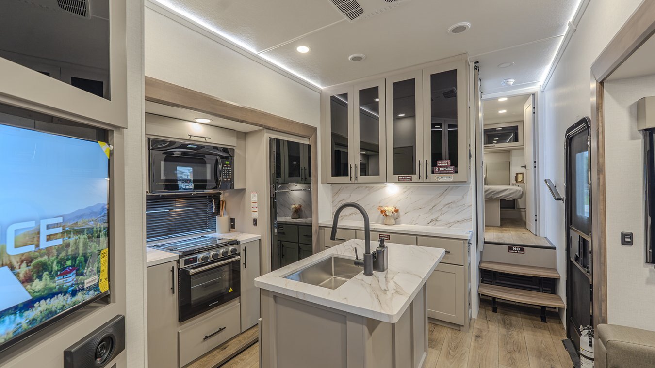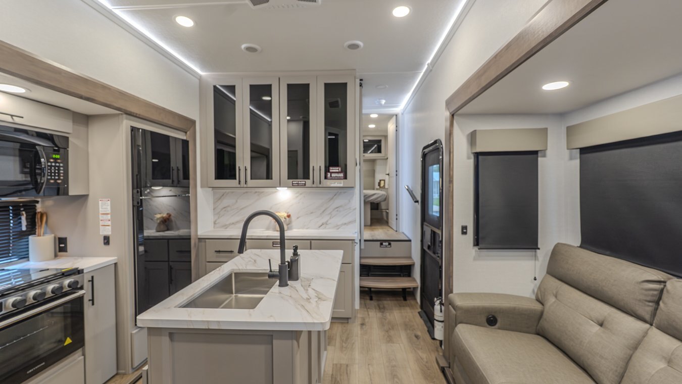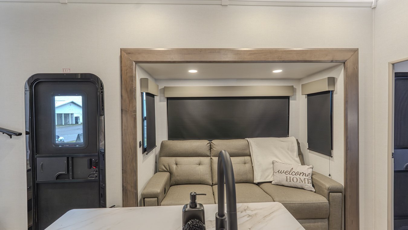 The Alliance RV Valor 32A10 is a premier fifth-wheel toy hauler that masterfully combines rugged utility with refined comfort, designed for those who seek adventure without compromising on quality. With a length of 35'11" and a dry weight of 12,100 lbs, it offers a spacious and durable platform for both outdoor enthusiasts and full-time travelers. Built on a 101" wide-body Benchmark chassis, the Valor 32A10 features a flush-floor upper deck, ensuring a stable and smooth ride. Its Performance Running Gear Package includes 7,000 lb. Dexter® axles, MorRyde® CRE3000 suspension system, and G-Range 4,400 lb. rated tires with 16" aluminum wheels, providing enhanced durability and towing stability. The 6-point hydraulic auto-leveling system simplifies setup, while the Rota-Flex pin box reduces towing stress. The seamless PVC roof covering and Azdel-backed fiberglass sidewalls offer long-lasting protection against the elements. The 10-foot garage is fully insulated and equipped with a weather-resistant ramp door, multipoint tie-down system, and 12V HappiJac rollover sofas with a table, transforming the space into a versatile living area. An air compressor and washer/dryer prep add to the convenience. The main living area boasts a sofa with power recliners, a 50" HD TV, and a 5,000 BTU fireplace, creating a cozy environment for relaxation. Commercial-grade vinyl flooring throughout ensures easy maintenance. The kitchen is equipped with a 4-burner gas stove with an oversized oven, residential microwave, and an 11 cu. ft. 12V refrigerator, providing all the essentials for meal preparation. Solid surface countertops and soft-close cabinet doors with magnetic catches add a touch of elegance. The large residential shower and soft-close toilet enhance the bathroom experience. Dimmable lighting and roller shades throughout create a comfortable ambiance. |