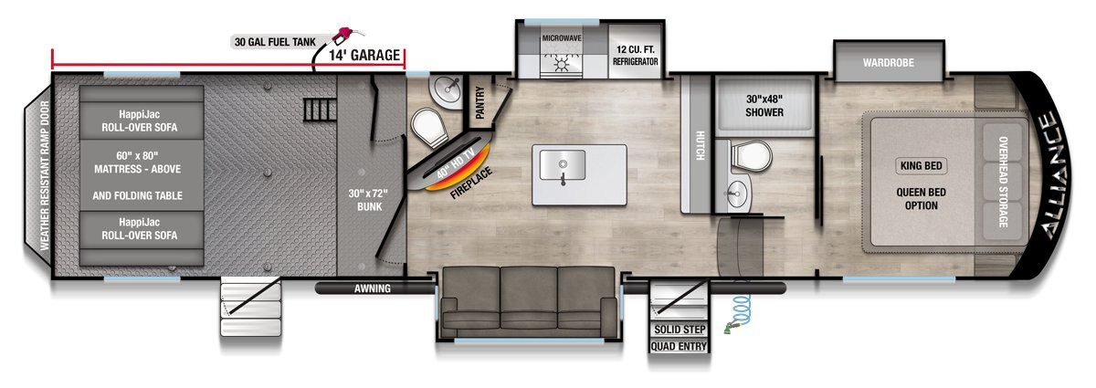 You have family, toys, gear and the intense personal desire to explore the outdoors. Courageously take adventure head on with the most versatile multi-zone living vehicle designed by RVers for RVers. Valor by ALLIANCE RV is packed with adventure-ready quality equipment for the extreme journey from performance running gear to the coolest HVAC system on the market.