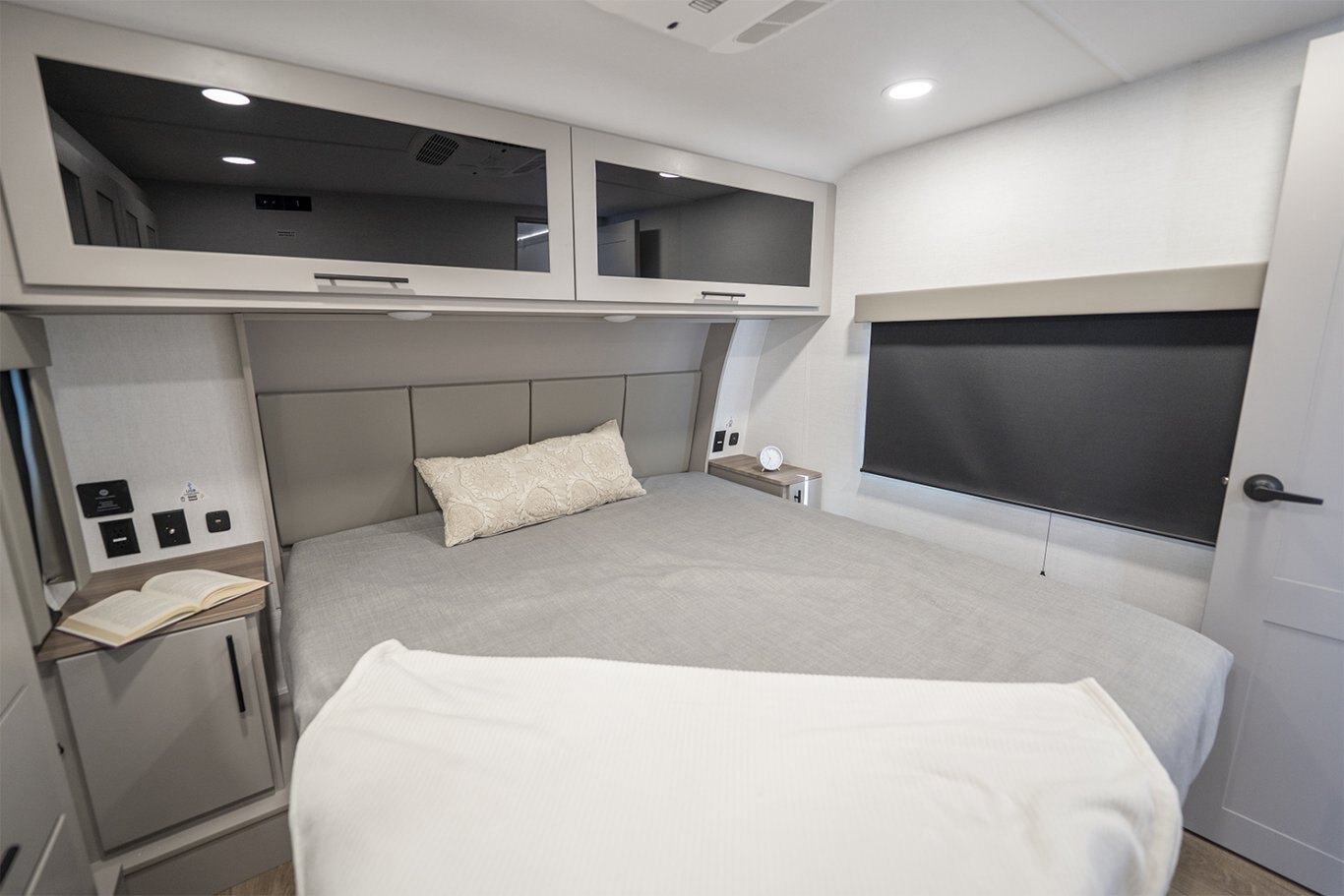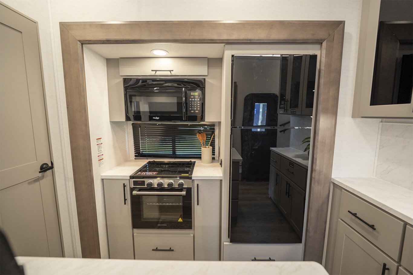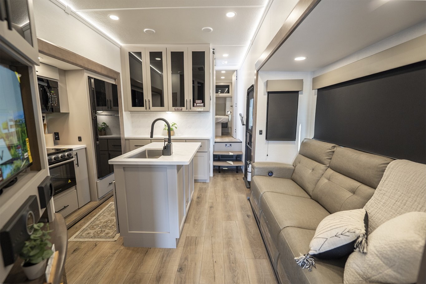 Inside, the Valor 35A14 impresses with its well-appointed kitchen, featuring a 17 cu. ft. 12V refrigerator, a four-burner gas stove with an oversized oven, and a residential microwave. Solid surface countertops and soft-close cabinetry add a touch of elegance, while the commercial-grade vinyl flooring ensures durability and easy maintenance.