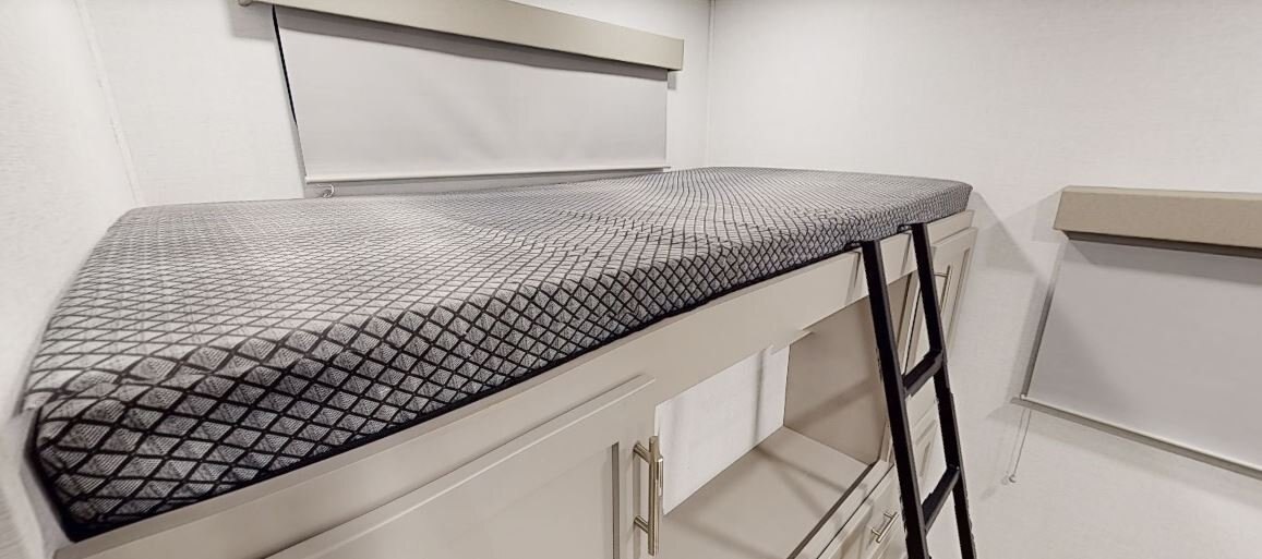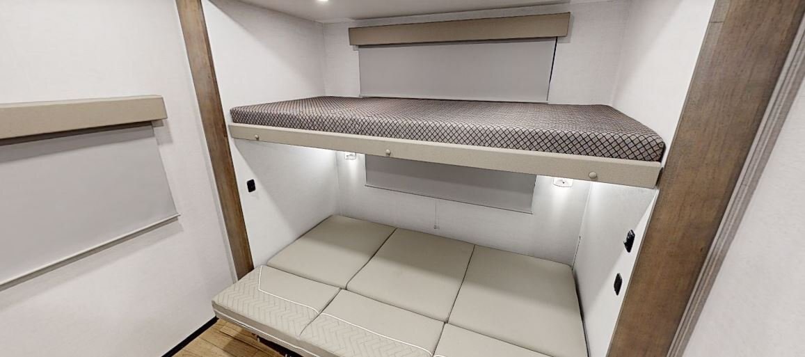The Avenue 333BH by Alliance RV is the perfect blend of family-friendly functionality and residential comfort, built for those who want to feel at home wherever they roam. Its spacious interior features a reclining theater seat, floating dinette with movable ottoman, and a large kitchen island surrounded by premium appliances and ample pantry space. A hidden entertainment center with a 50" HDTV and tri-fold sofa transforms the living area into a cozy media lounge or guest sleeping space. The rear bunkhouse offers versatile sleeping for kids or guests with multiple bunks, a cube sofa, and a pull-out trundle, while the full outdoor kitchen and 40" exterior TV bring the fun outside. Up front, the private queen bedroom and full bath with washer/dryer prep ensure you travel in total comfort and style. |