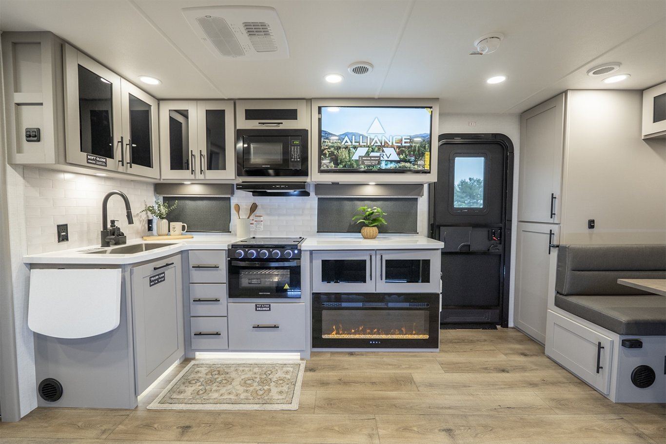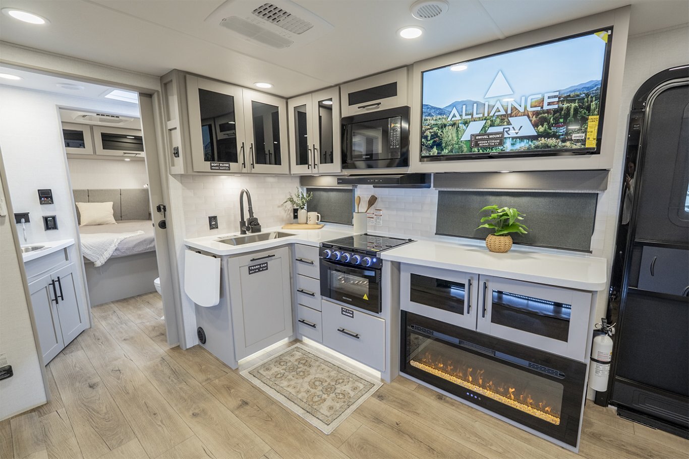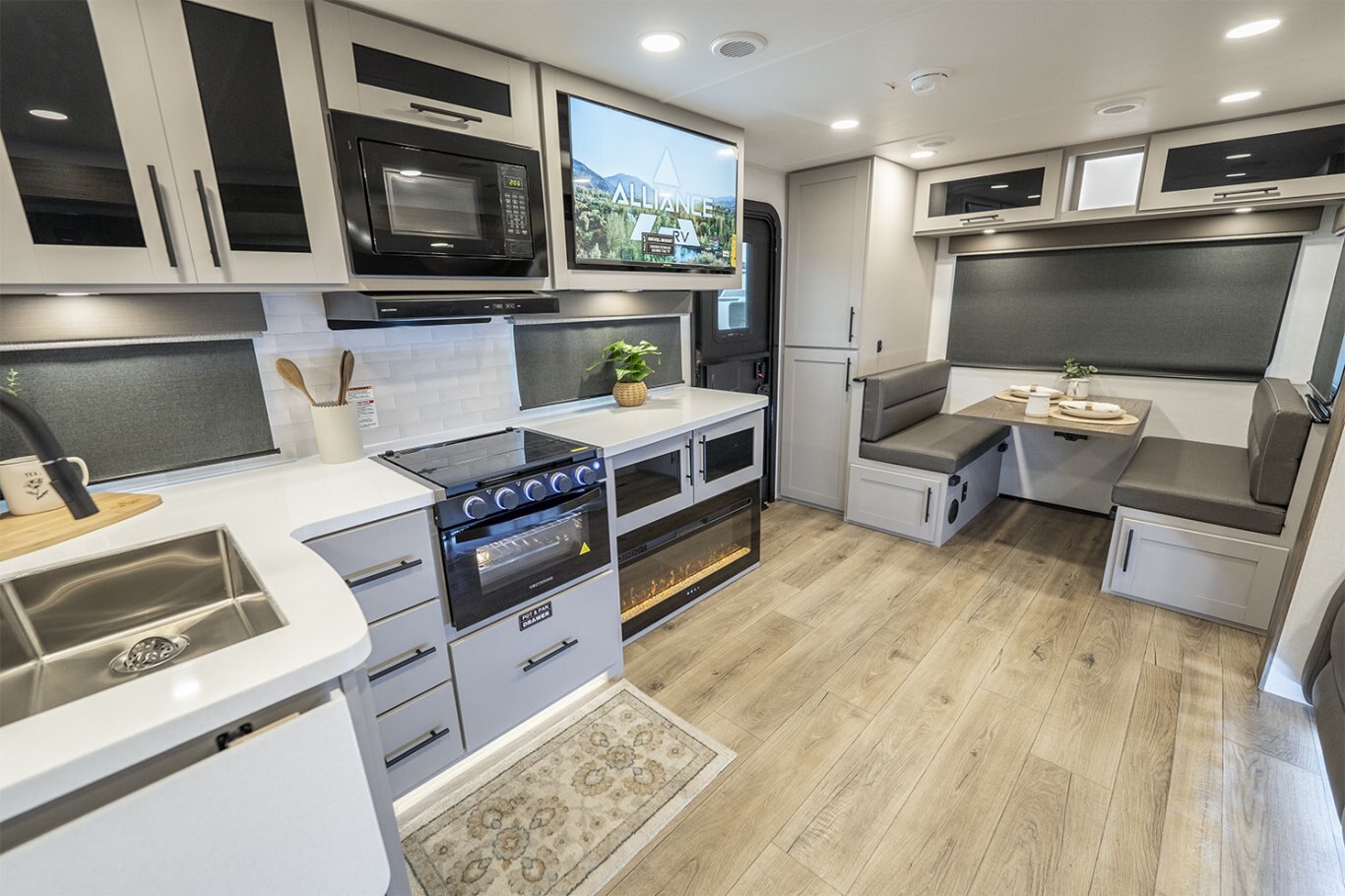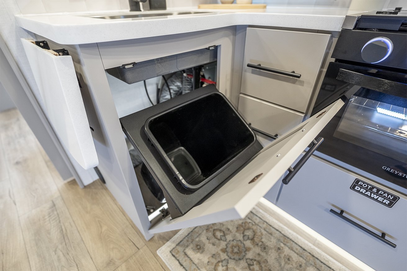 -Kitchen includes a 10 cu. ft. 12V refrigerator, pantry, and flip-up counter extension for added prep space