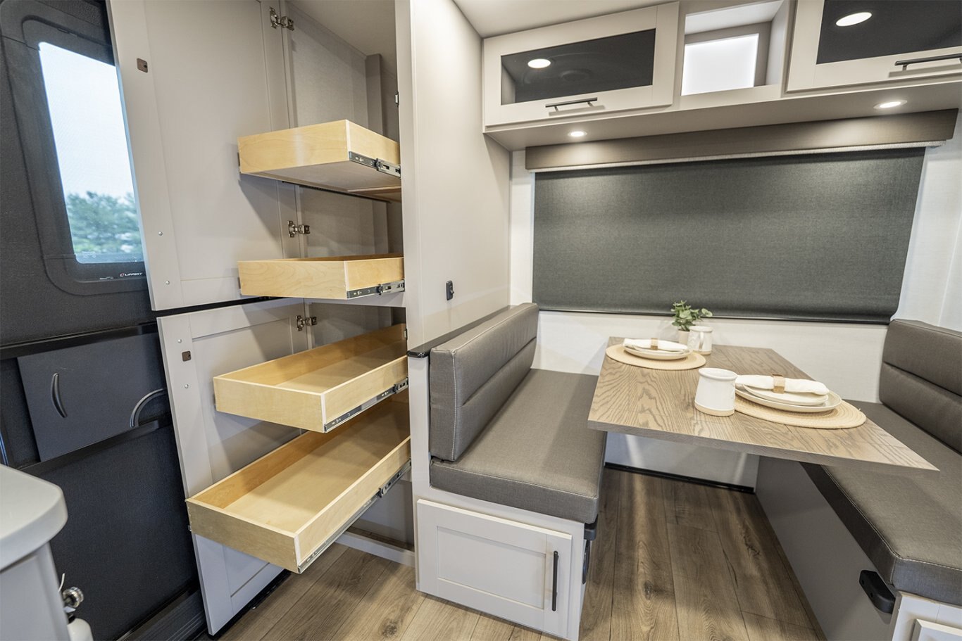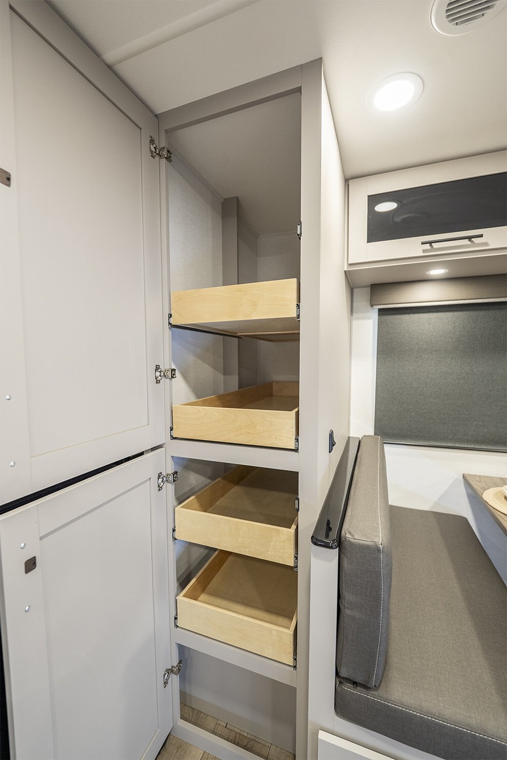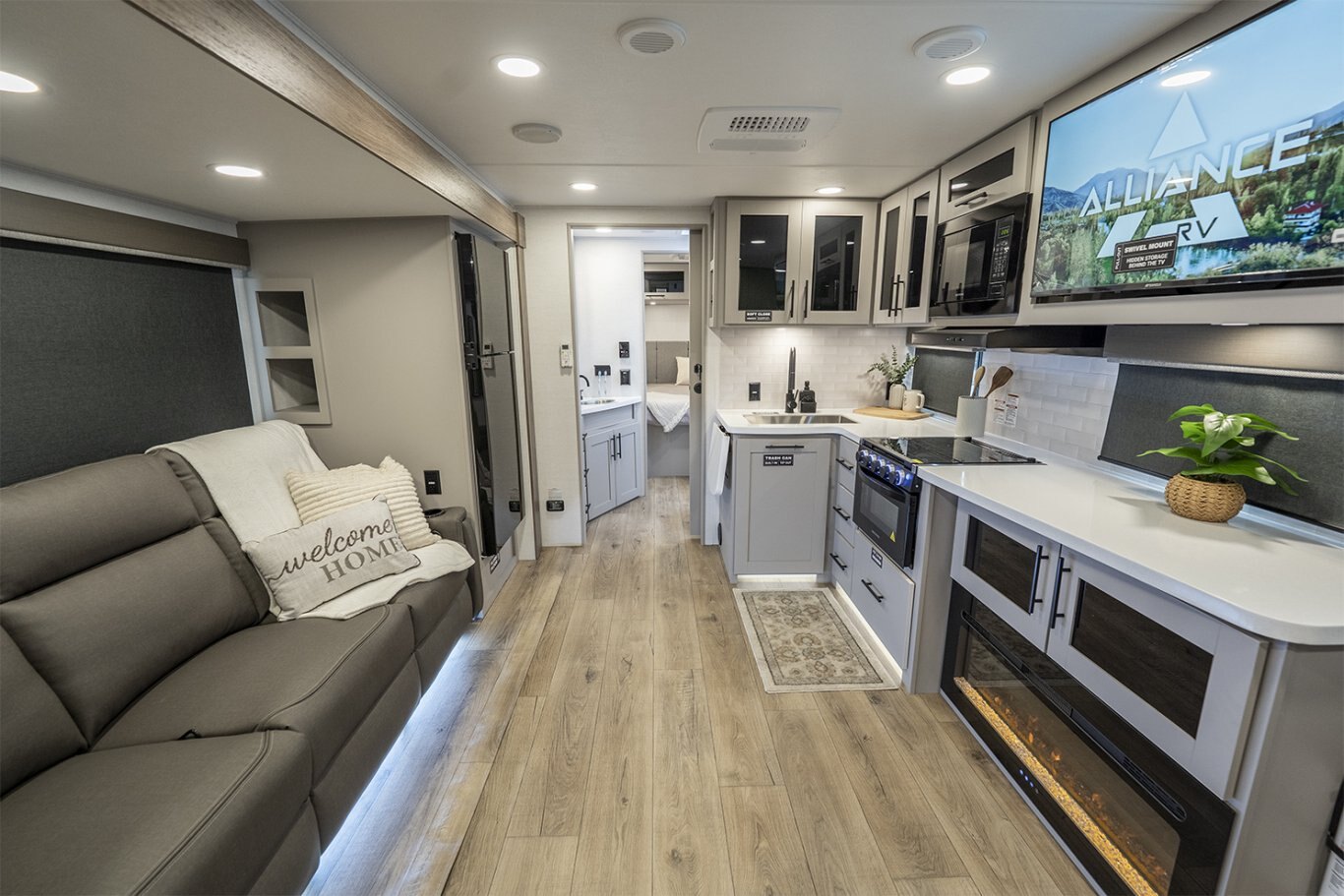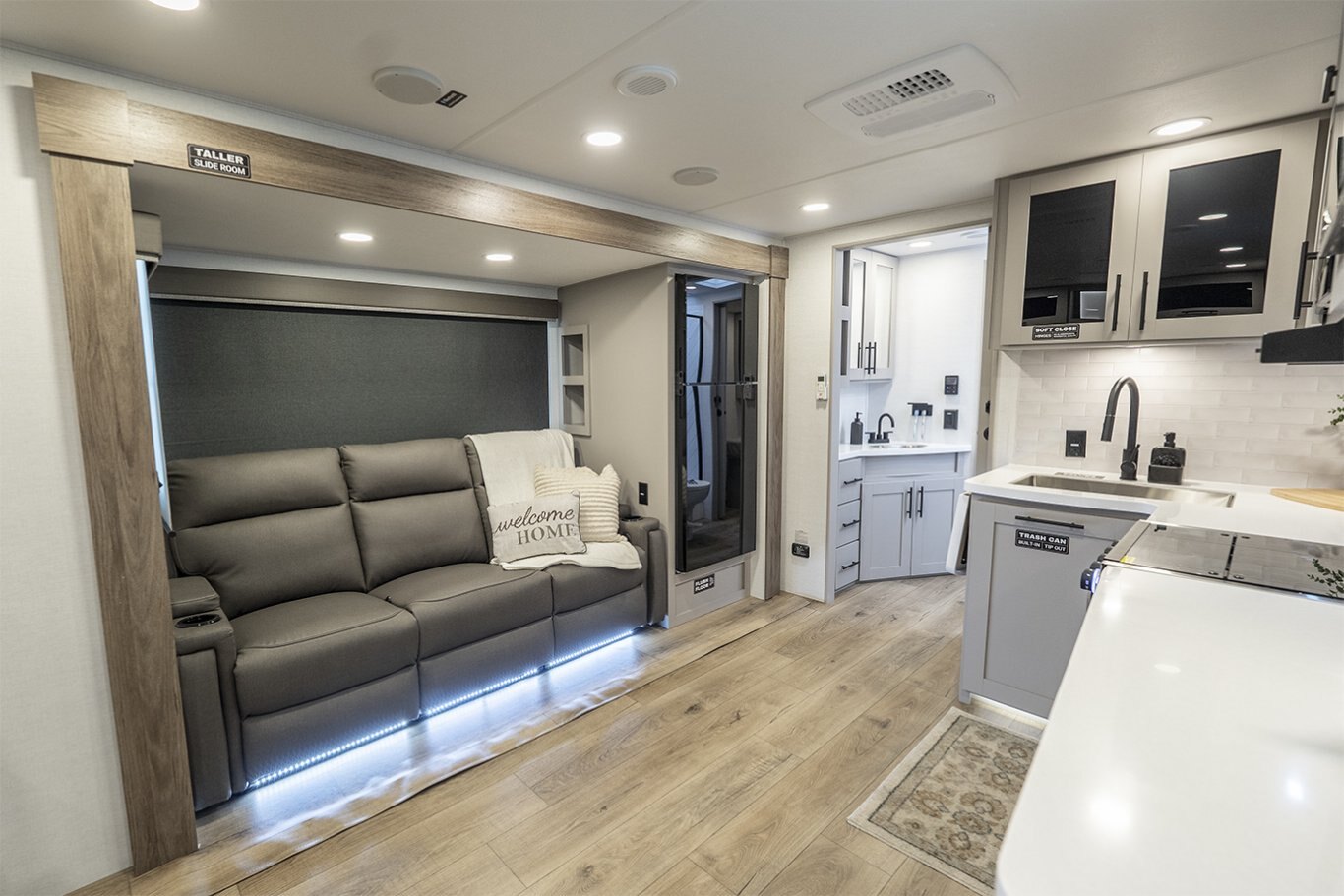 -Kitchen includes a 10 cu. ft. 12V refrigerator, pantry, and flip-up counter extension for added prep space