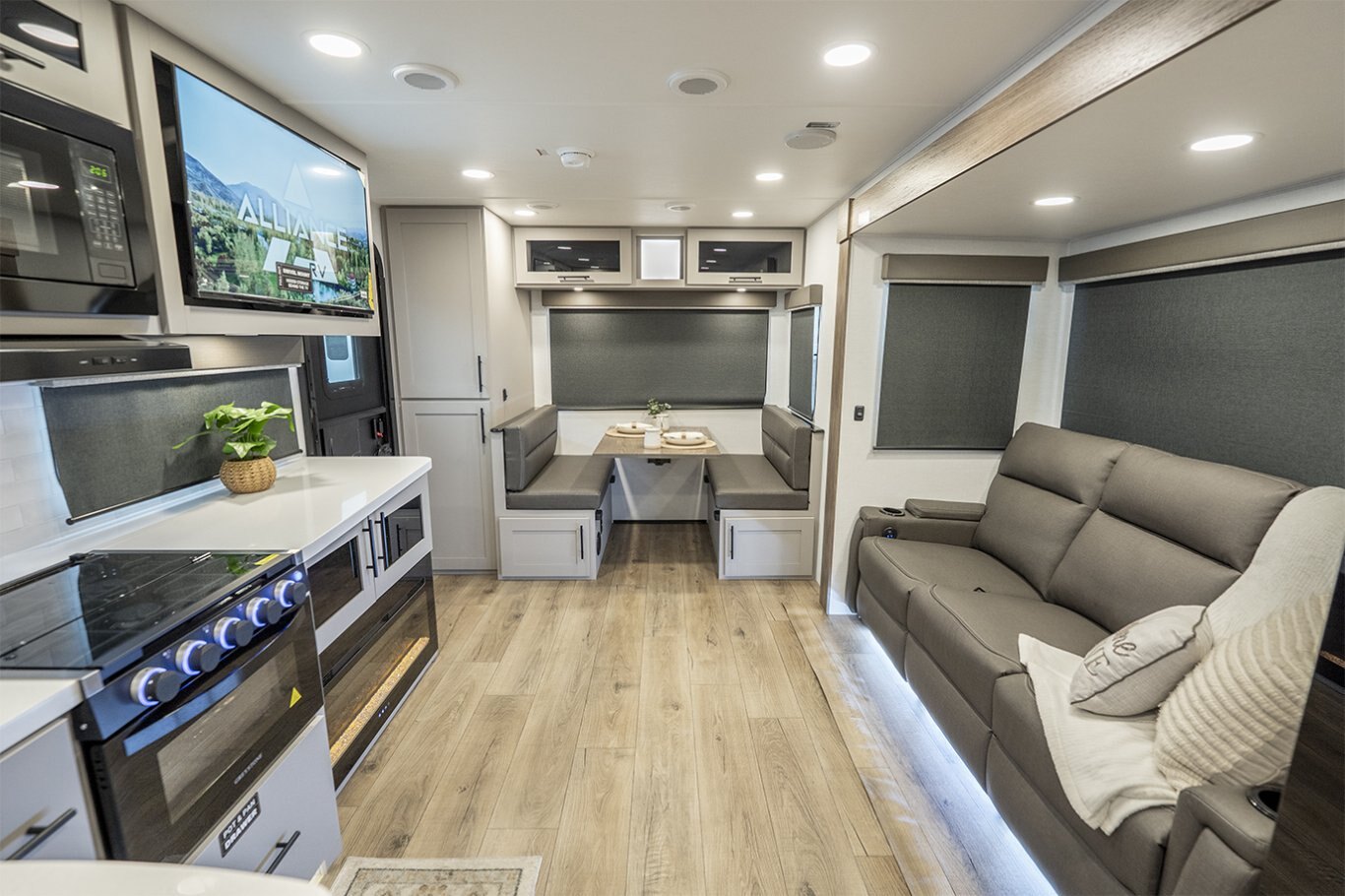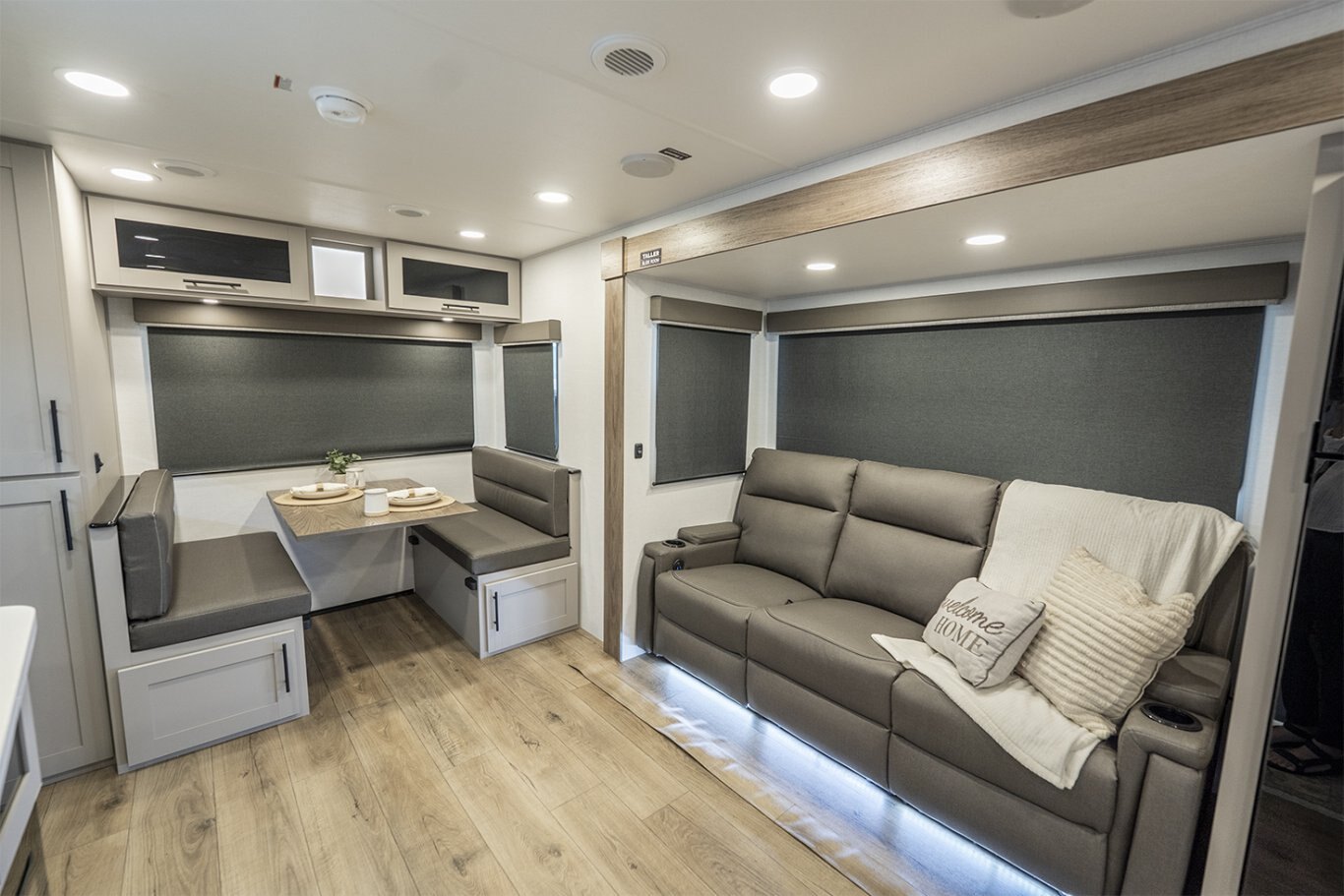 -Rear living layout includes a full dinette with overhead storage and a spacious reclining loveseat near the entry