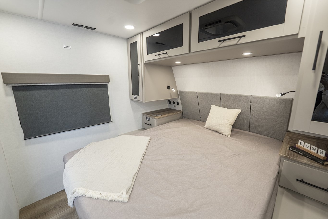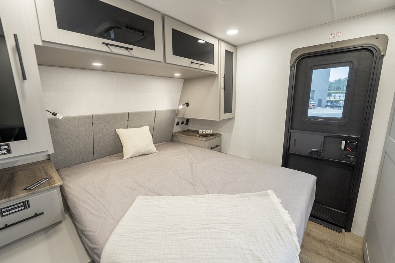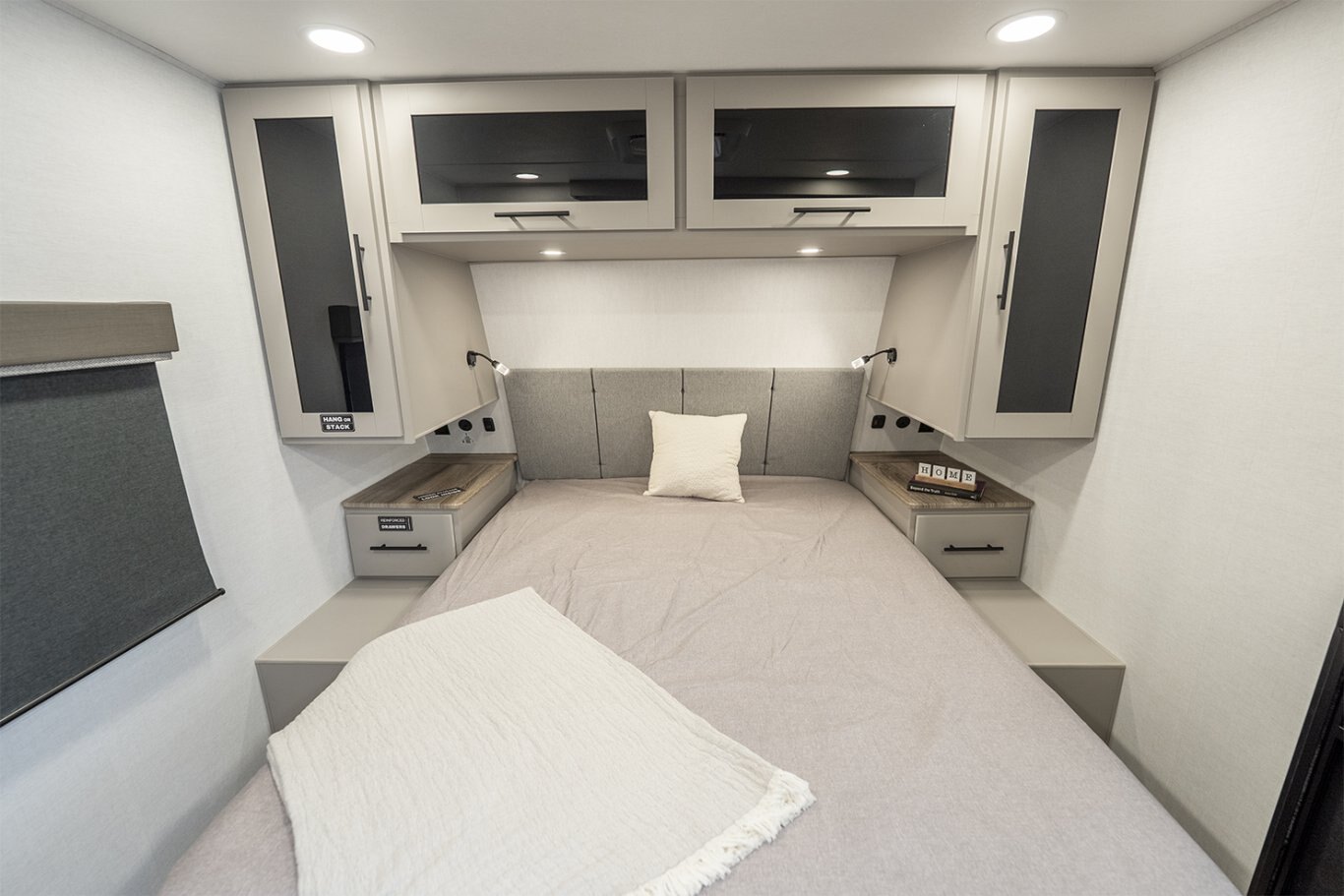 -Front bedroom features a 60" x 80" queen bed with dual wardrobes and overhead storage