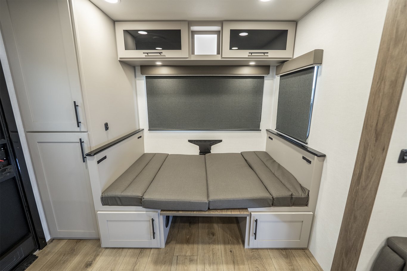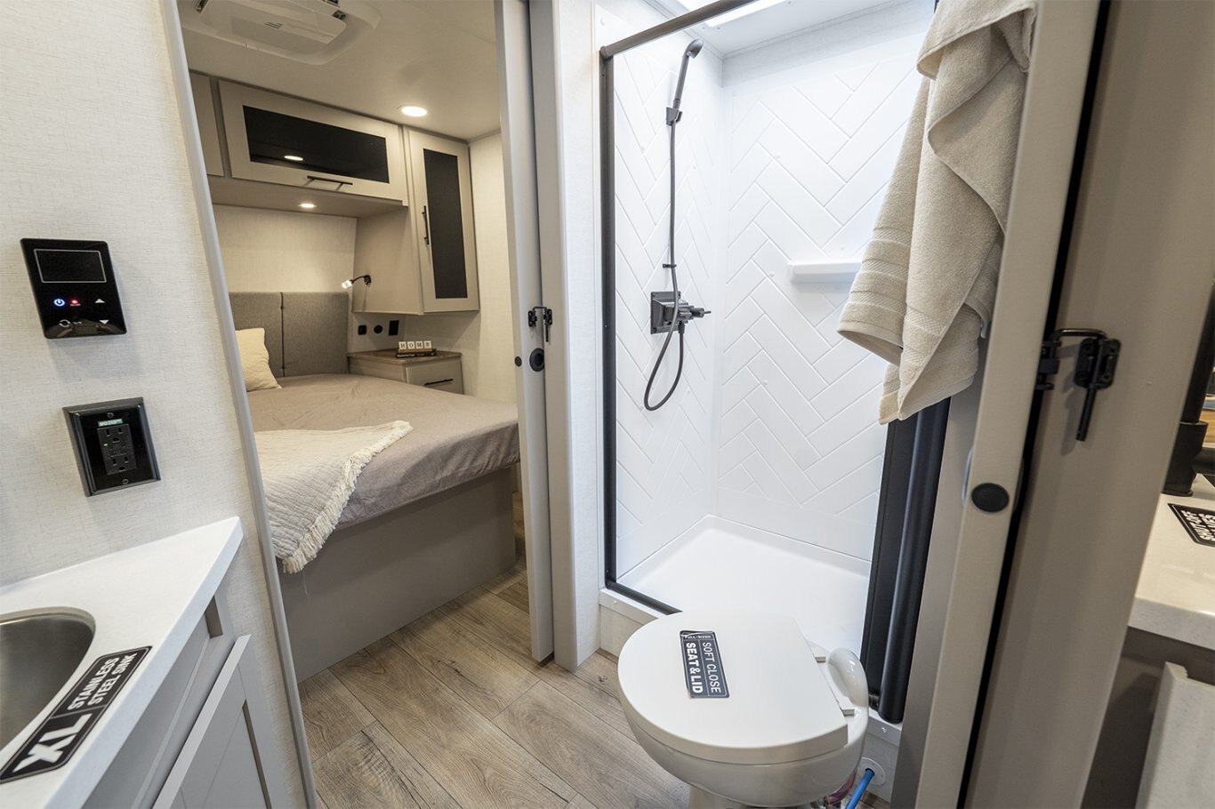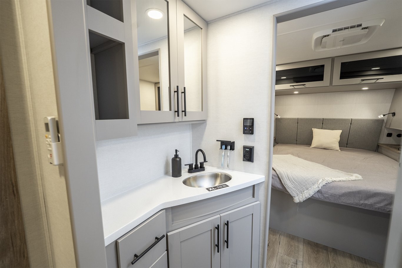 -Front bedroom features a 60" x 80" queen bed with dual wardrobes and overhead storage