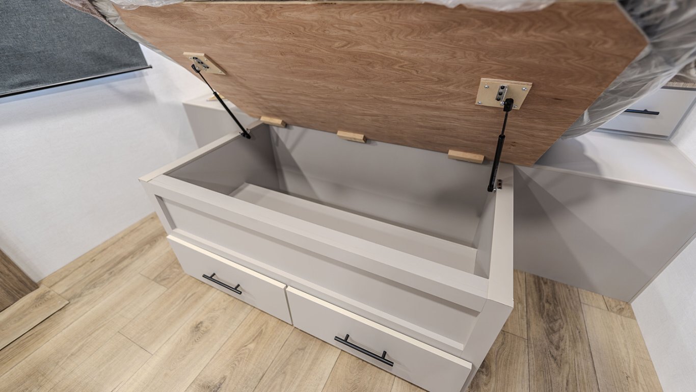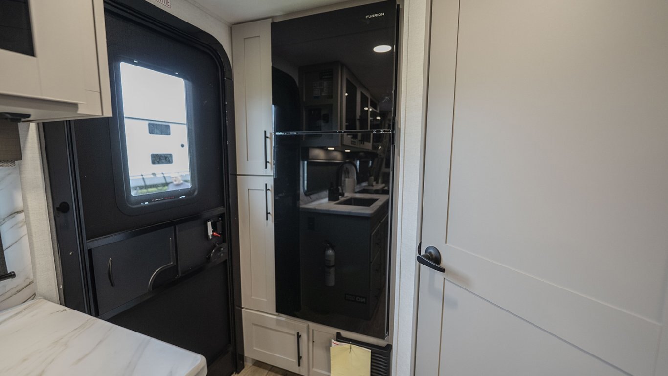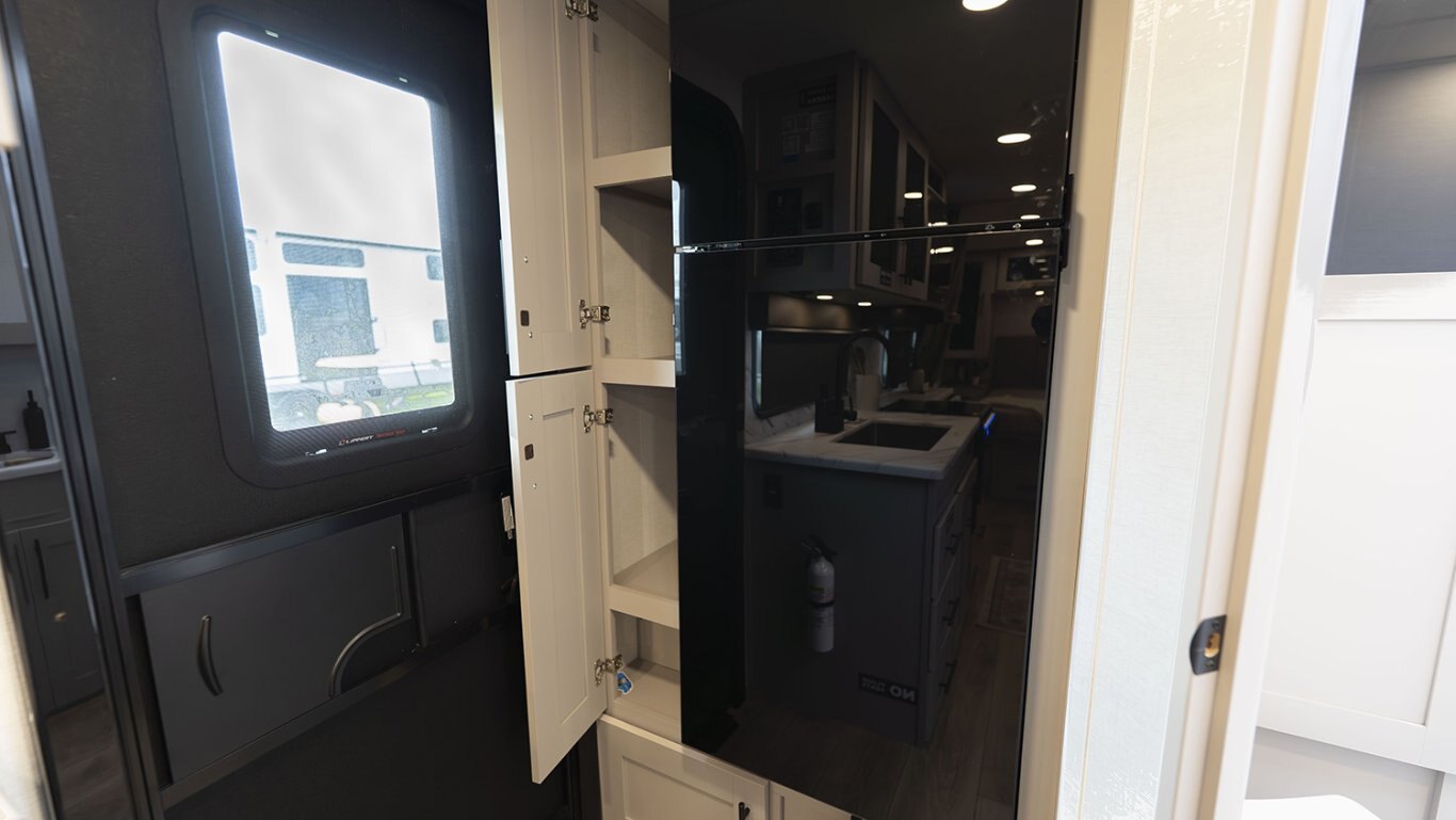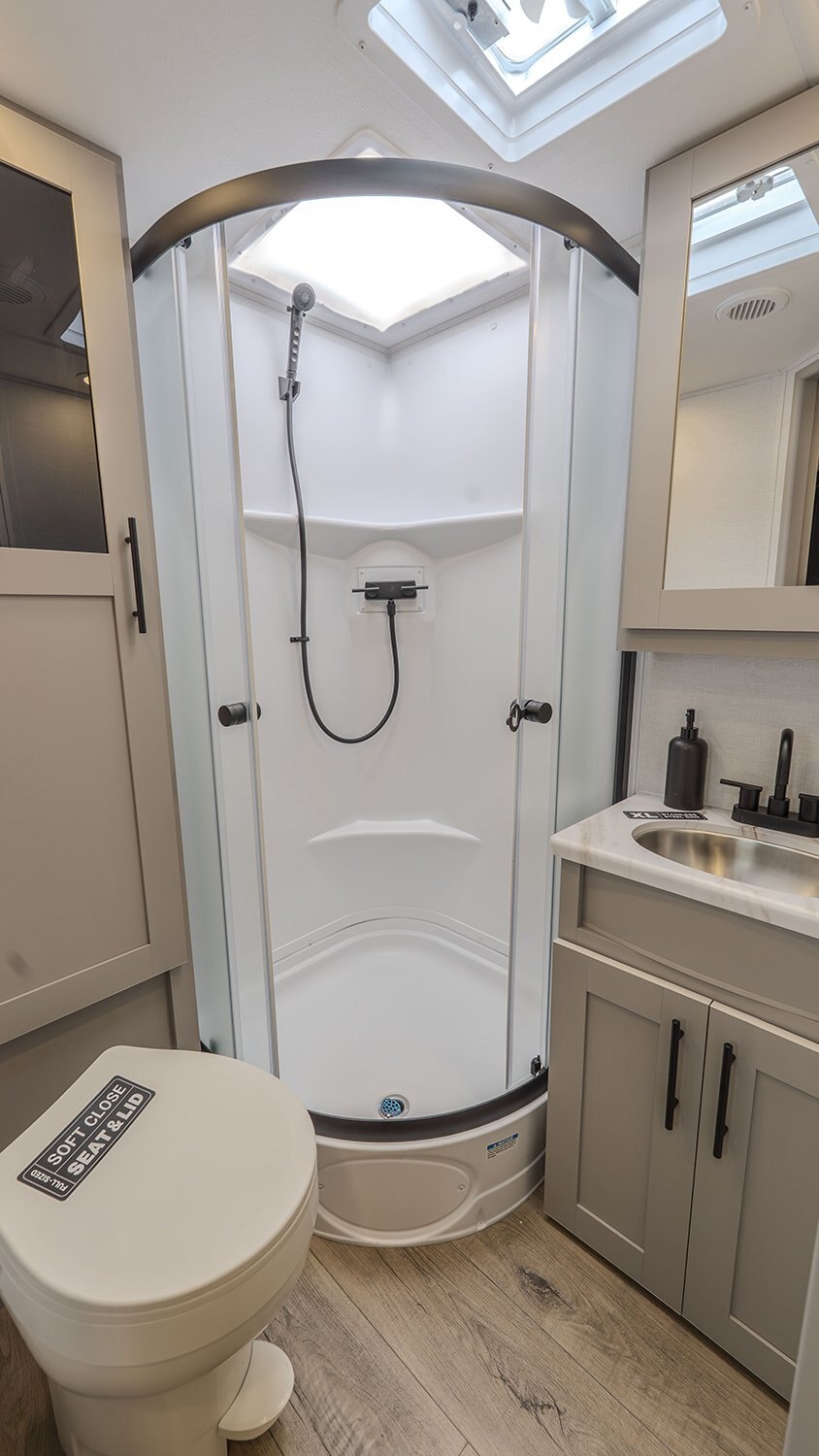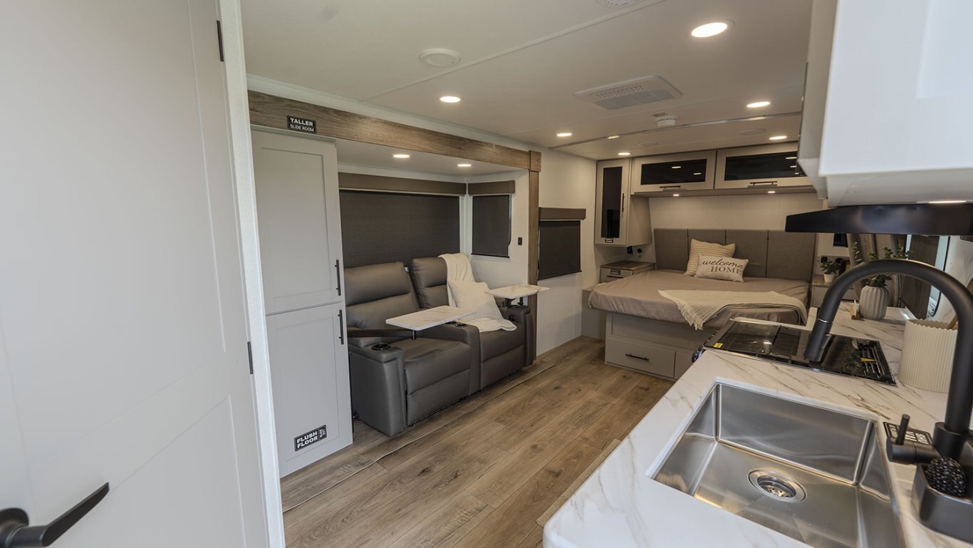The front of the trailer houses a walk-around queen bed with dual wardrobes and overhead storage, providing a restful retreat without compromising on space or accessibility. Panoramic windows bring in natural light and scenic views, while premium touches like Goodyear Endurance tires, Azdel composite sidewalls, and an enclosed underbelly ensure performance and durability on any journey.