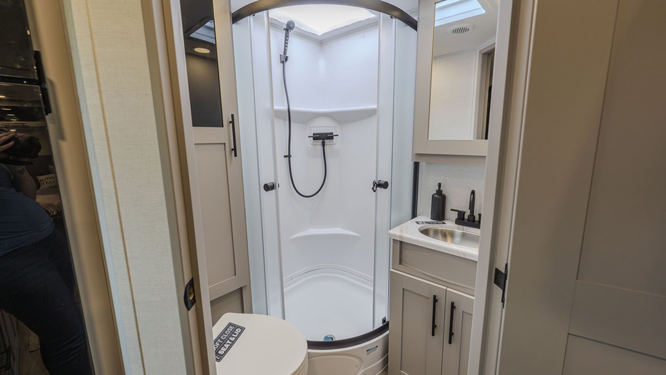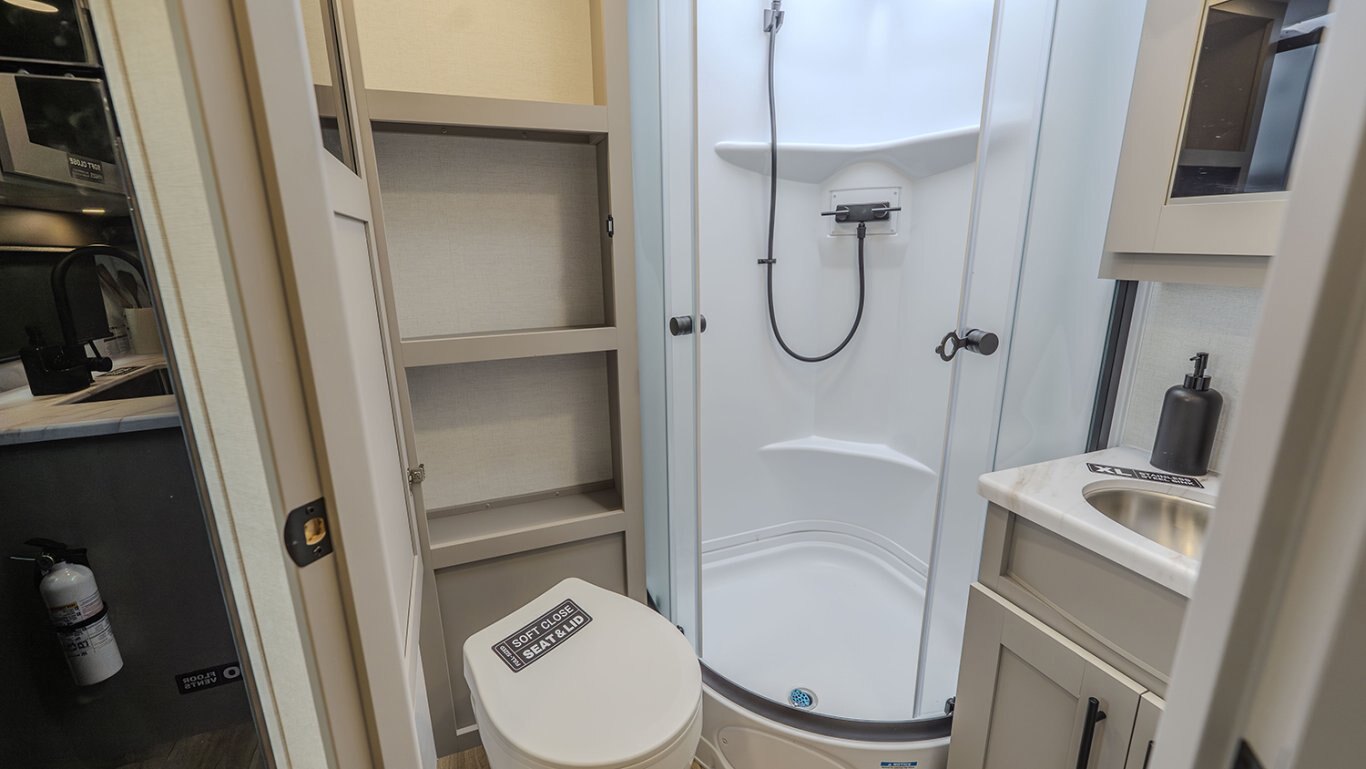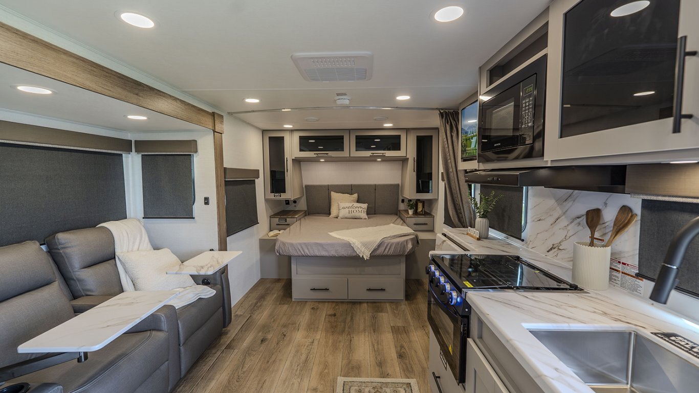 Measuring under 27 feet and engineered for half-ton and SUV towing, the ML206 features a modern mid-living layout that makes the most of every square inch. The rear bathroom provides full residential functionality, while the central living space offers theater seating, an optional tri-fold sofa, and a well-equipped kitchenette with solid surface countertops, a two-burner cooktop, and a convection microwave.
