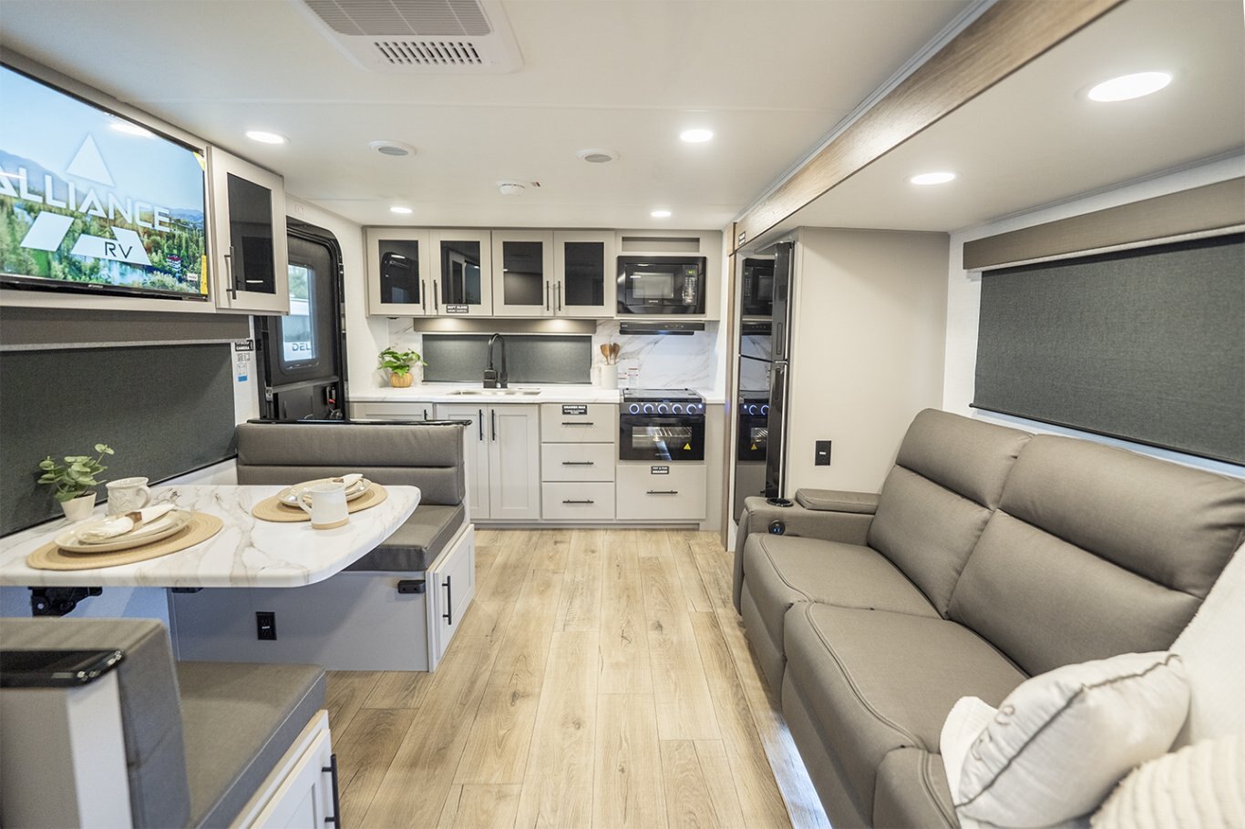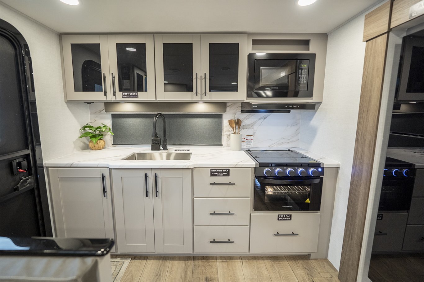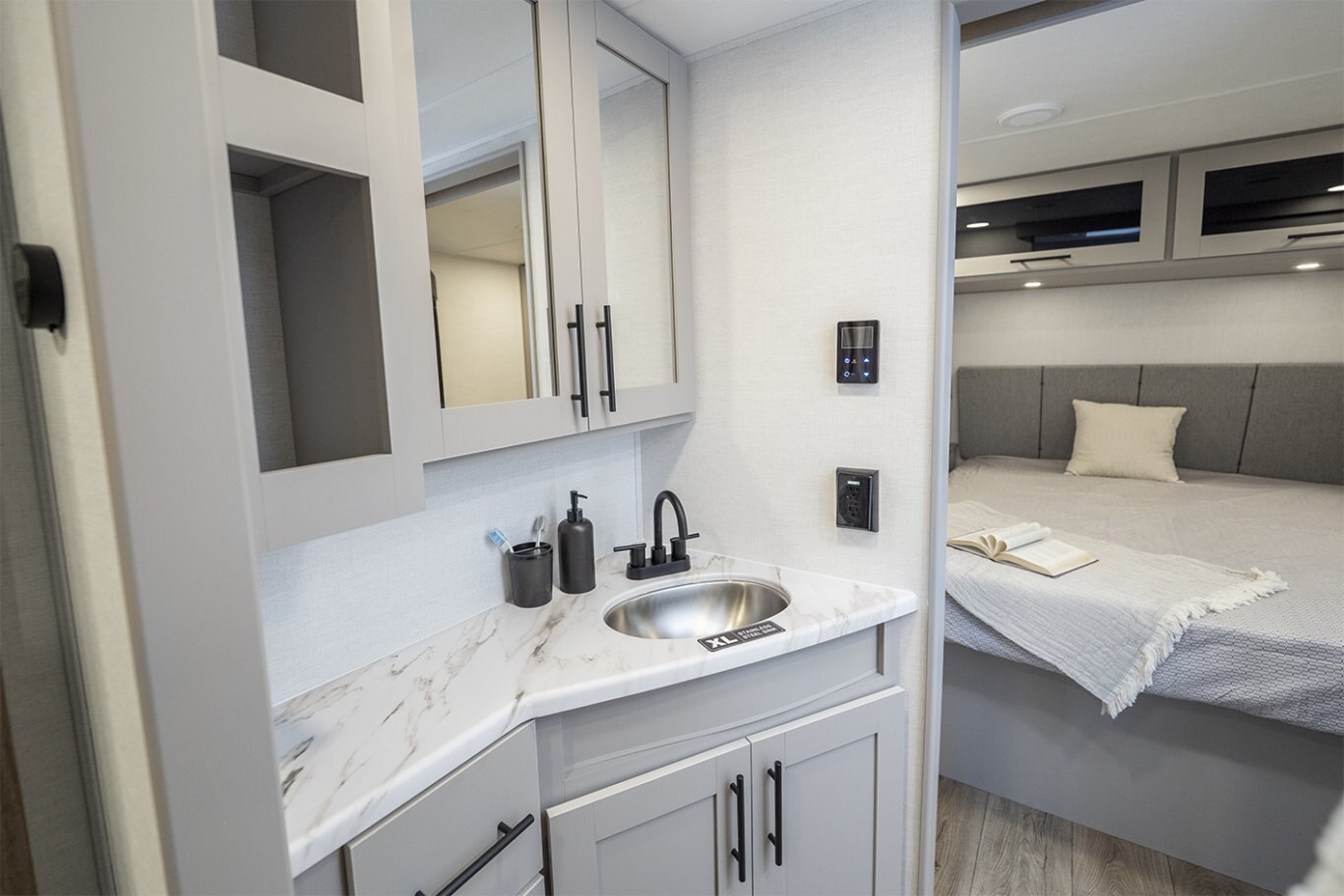 At just under 30 feet, the RK234 delivers a surprising sense of openness thanks to its rear kitchen layout, slide-out dinette, and large panoramic windows. The fully equipped kitchen features a residential microwave, high-rise faucet, and ample pantry storage, giving you everything you need to cook and dine comfortably wherever the road takes you.