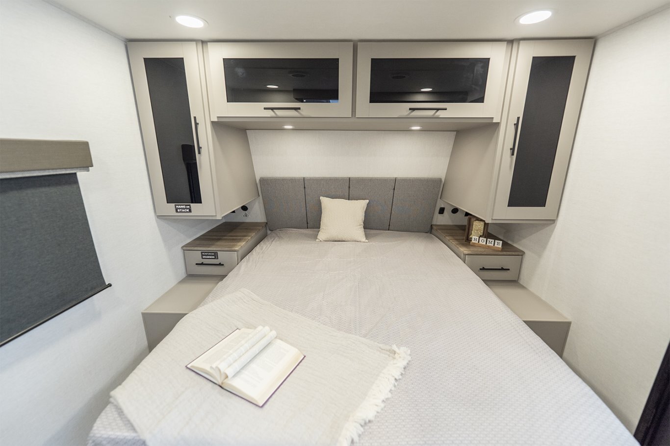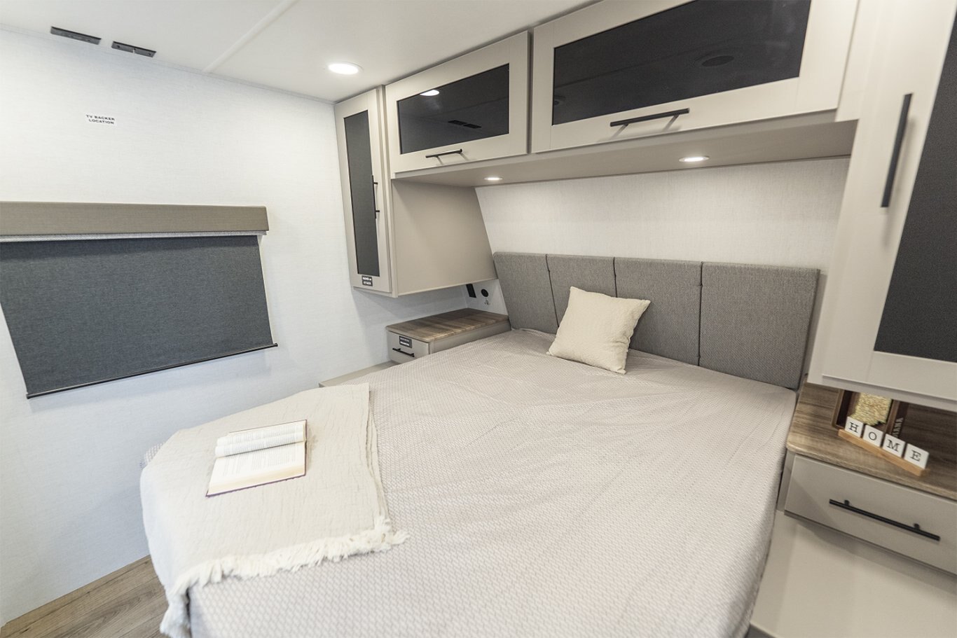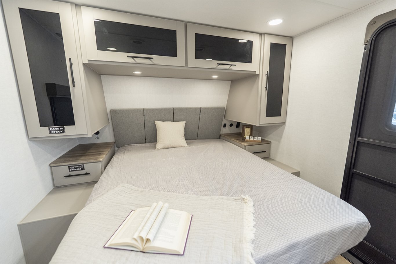The cozy front bedroom includes a queen bed with under-bed storage, overhead cabinets, and dual wardrobes—offering plenty of space for essentials. In the living area, the theater seating or optional tri-fold sofa is positioned perfectly for relaxing across from the entertainment center and fireplace.