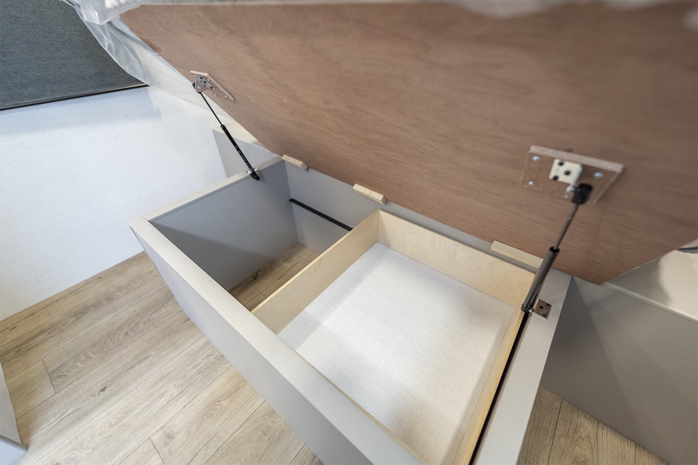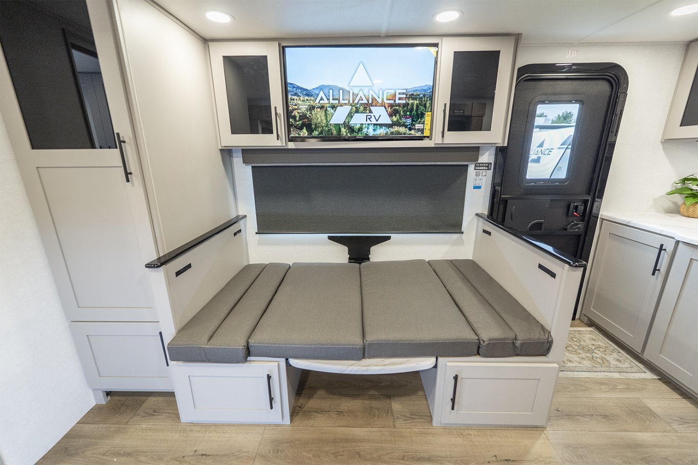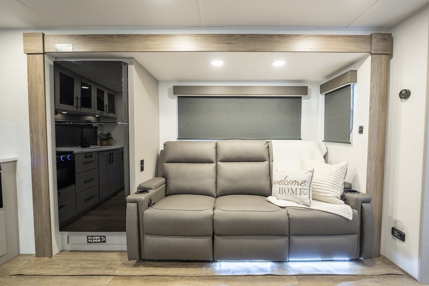 The cozy front bedroom includes a queen bed with under-bed storage, overhead cabinets, and dual wardrobes—offering plenty of space for essentials. In the living area, the theater seating or optional tri-fold sofa is positioned perfectly for relaxing across from the entertainment center and fireplace.