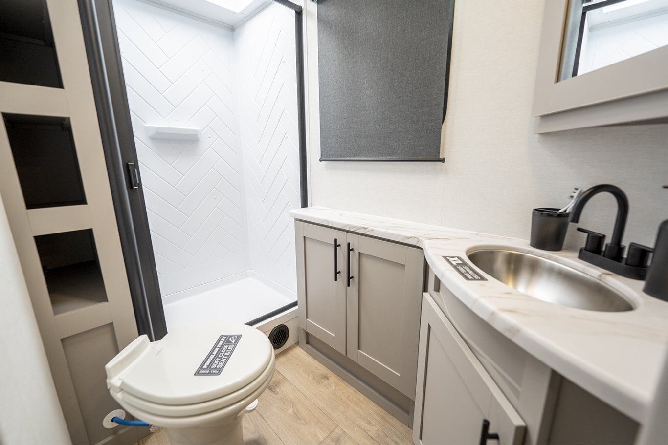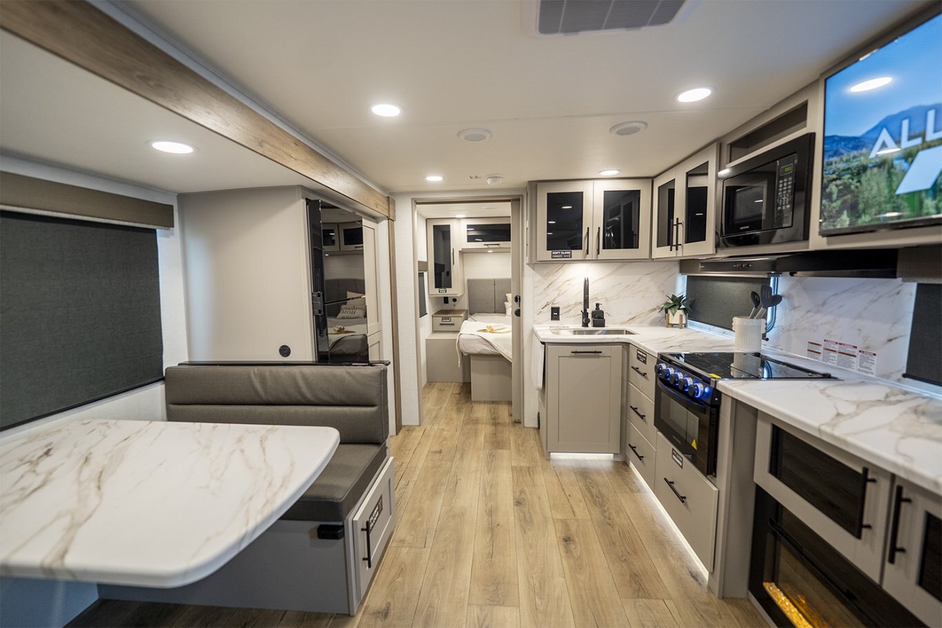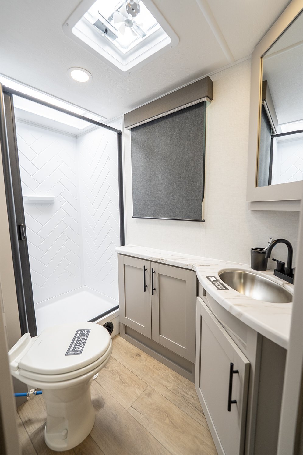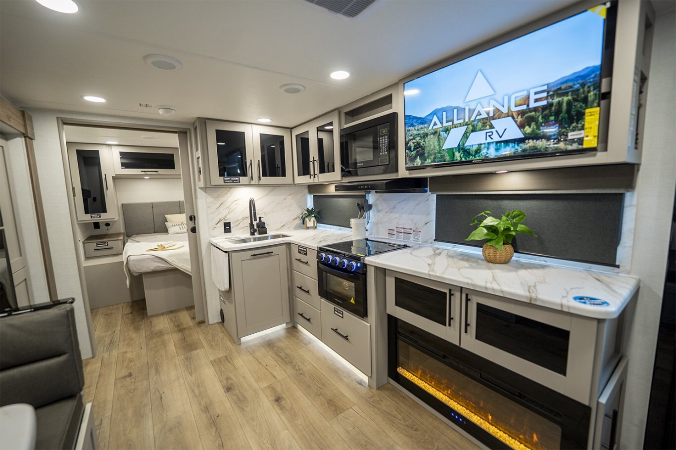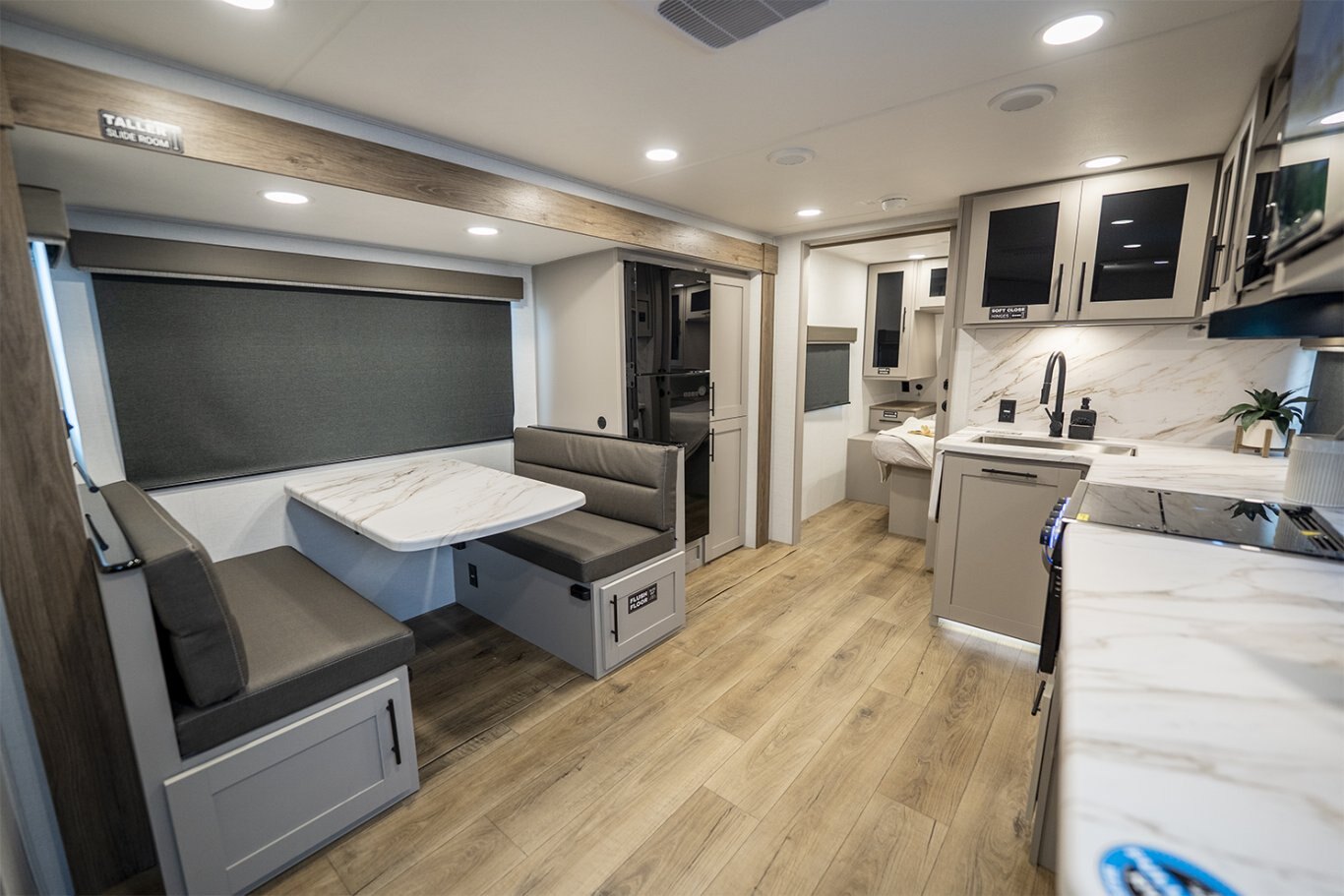 The well-appointed kitchen is equipped with solid surface countertops, a two-burner cooktop, convection microwave, residential refrigerator, and a deep-basin sink—delivering the convenience of home cooking no matter where you roam. A spacious rear corner bath includes a full-size shower and ample storage, making daily routines easy and efficient.